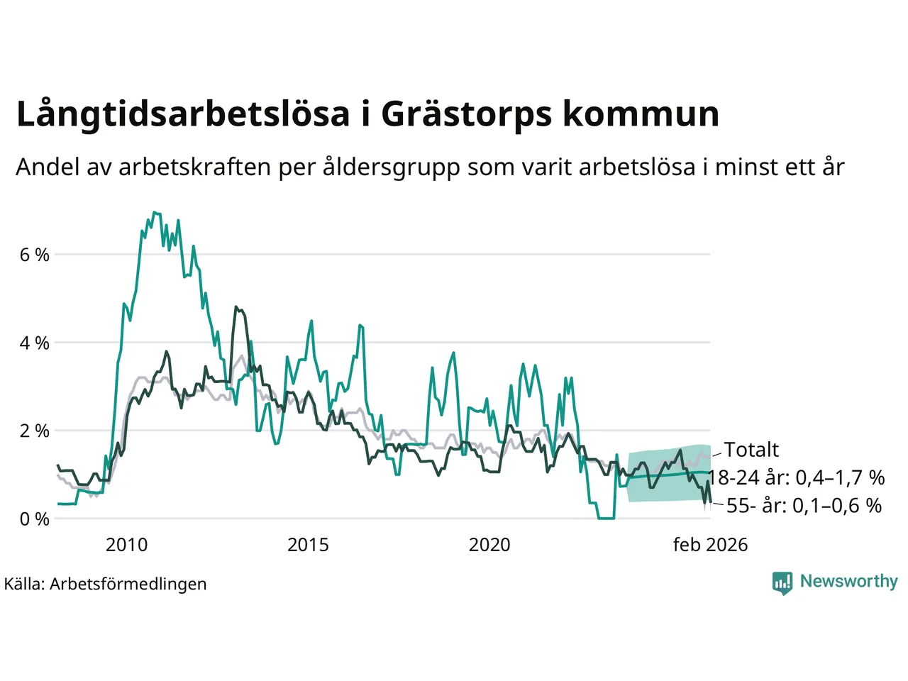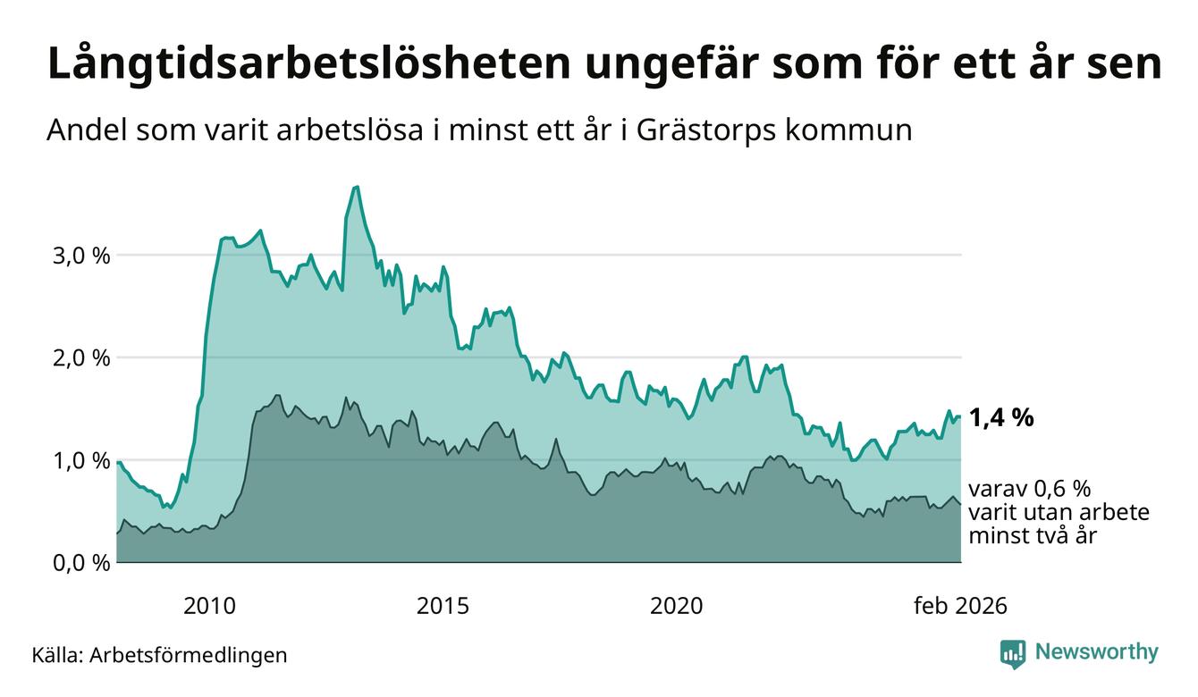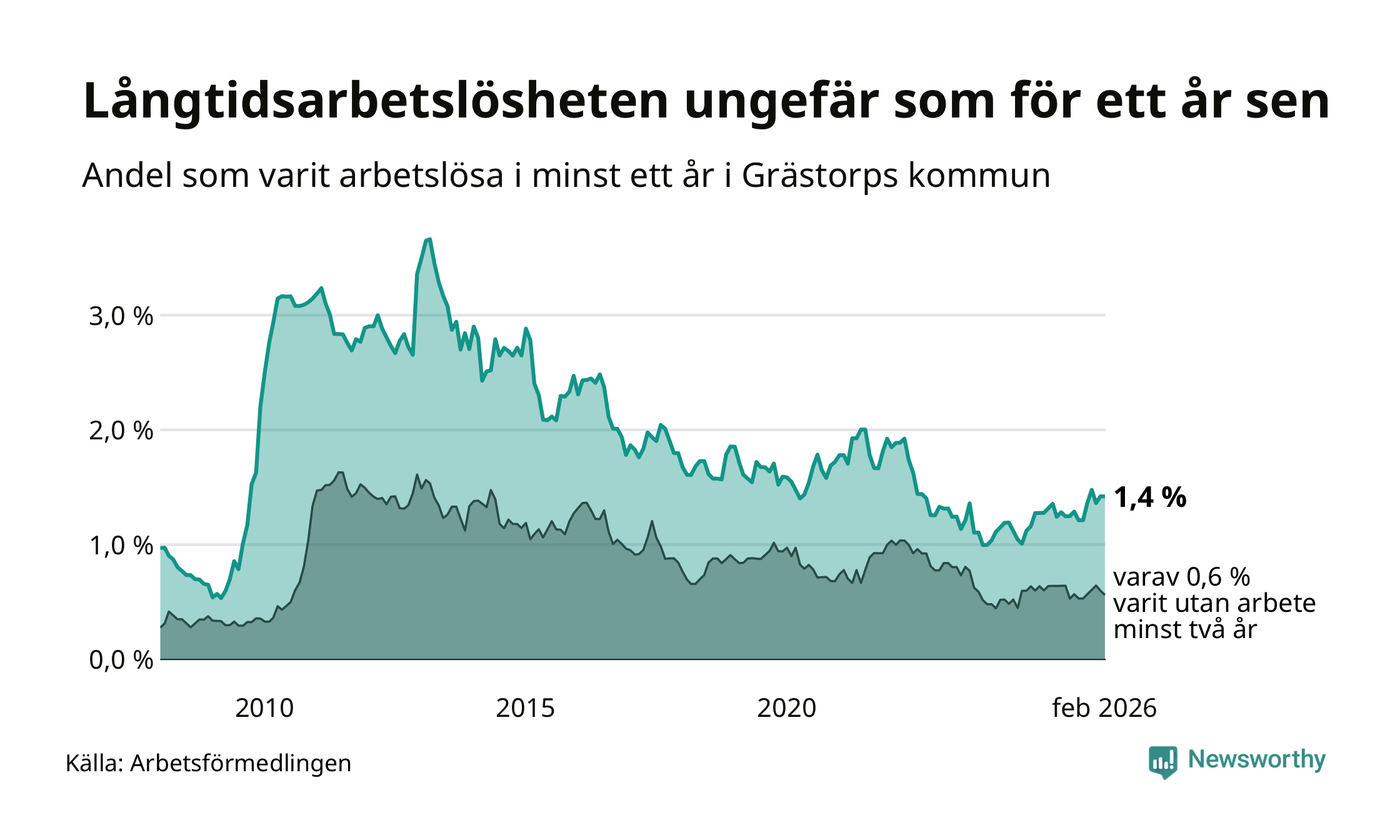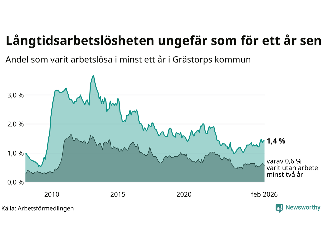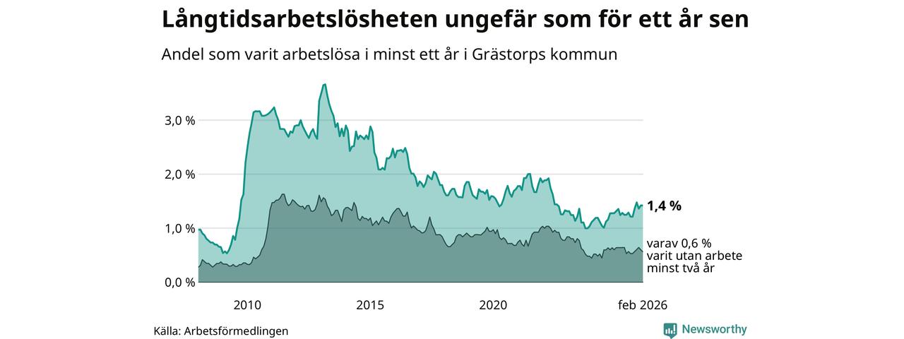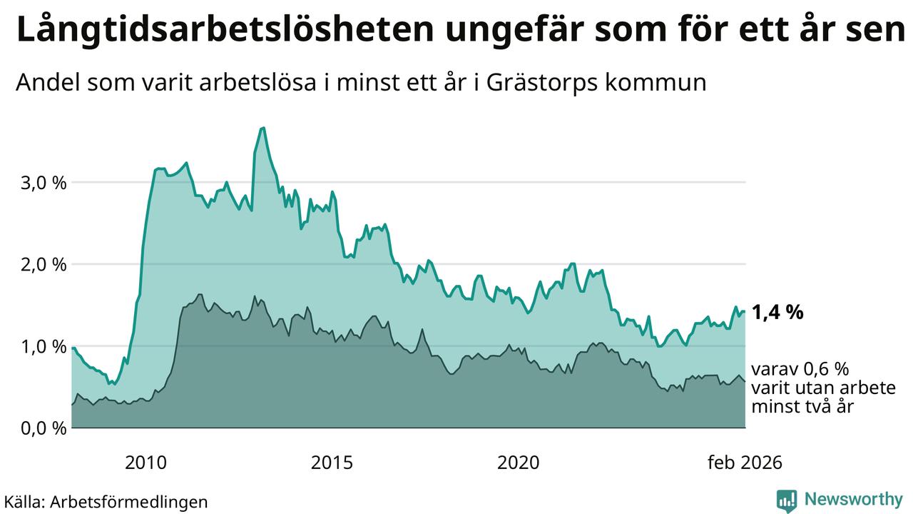 I februari hade 38 Grästorpsbor varit arbetslösa i minst ett år, vilket är lika många som månaden innan. 38 personer motsvarar 1,4 procent av arbetskraften i kommunen – andelen långtidsarbetslösa är ungefär på samma nivå som för ett år sedan.