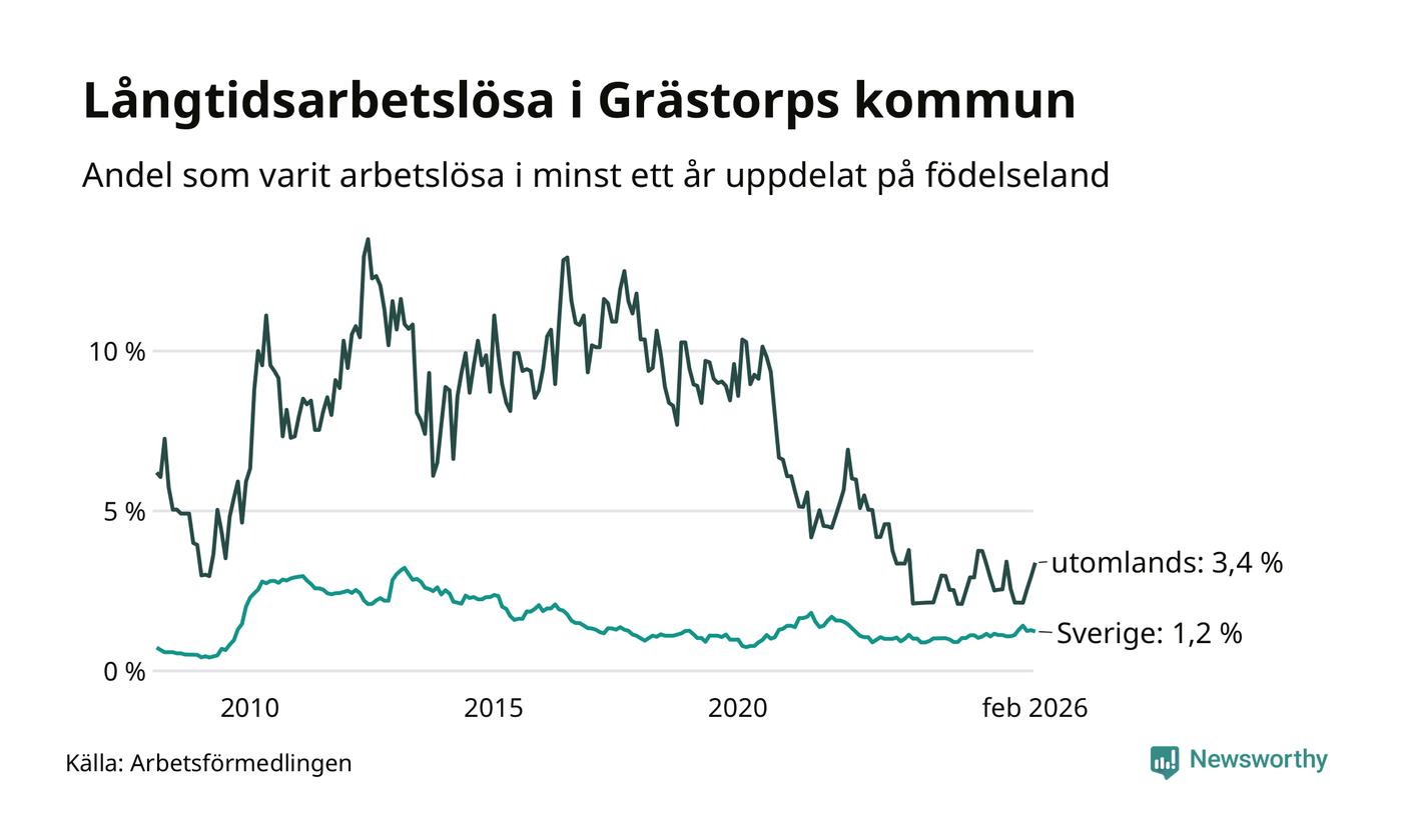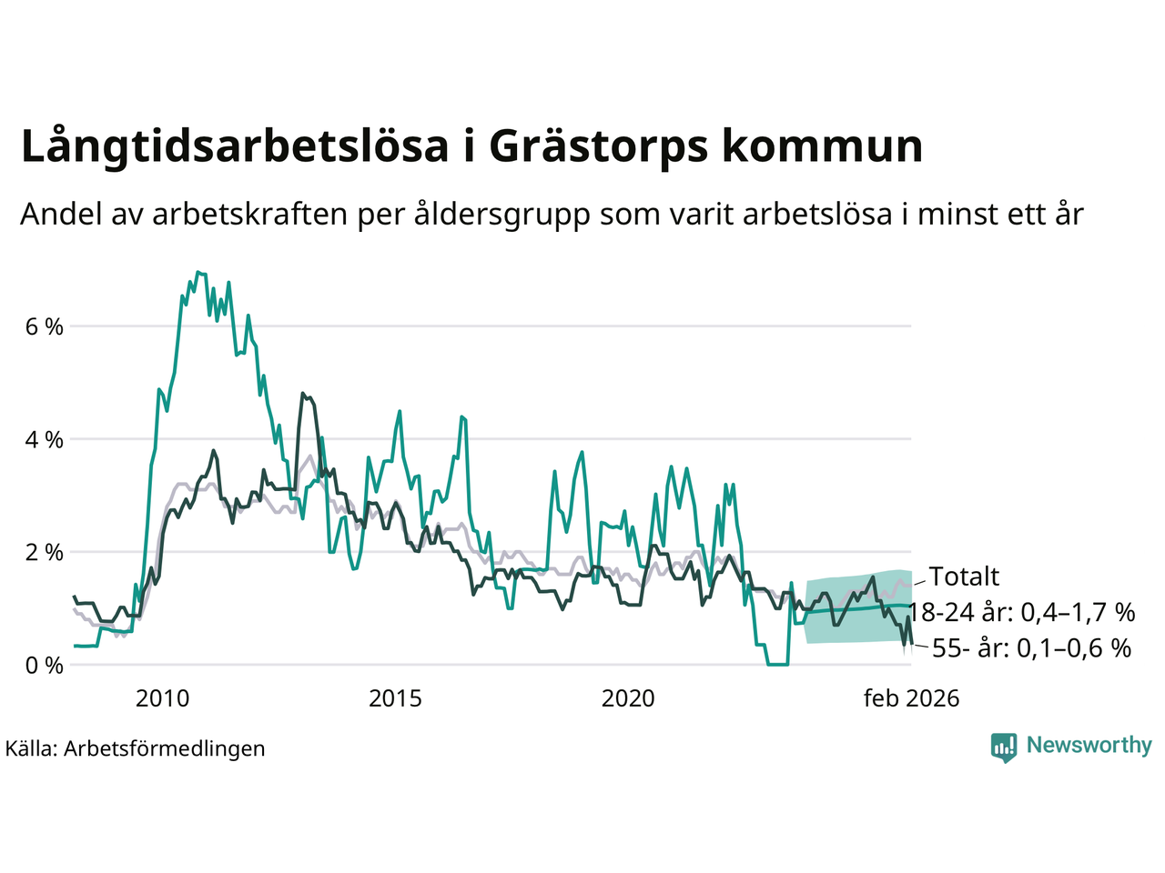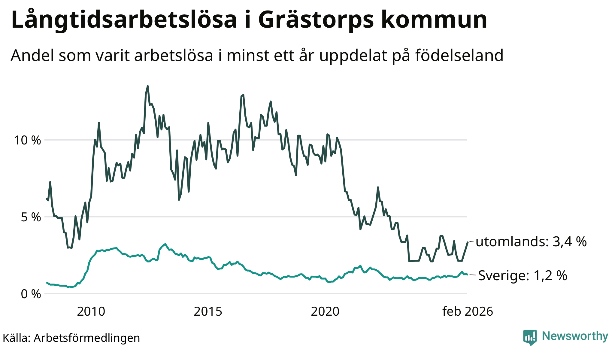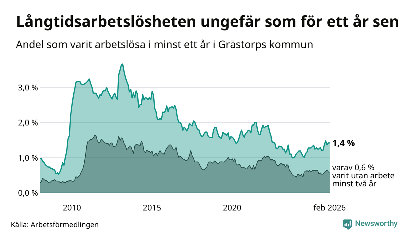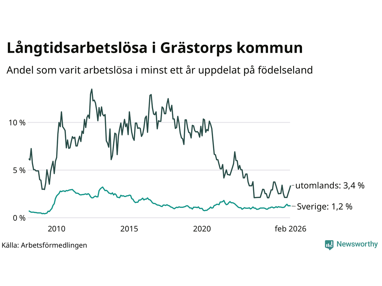 I februari hade 38 Grästorpsbor varit arbetslösa i minst ett år, vilket är lika många som månaden innan. 38 personer motsvarar 1,4 procent av arbetskraften i kommunen – andelen långtidsarbetslösa är ungefär på samma nivå som för ett år sedan.
