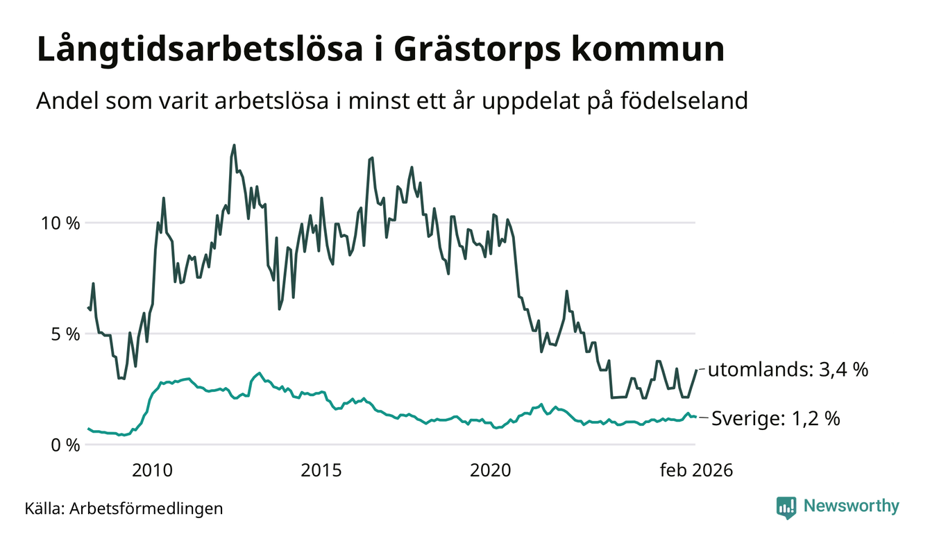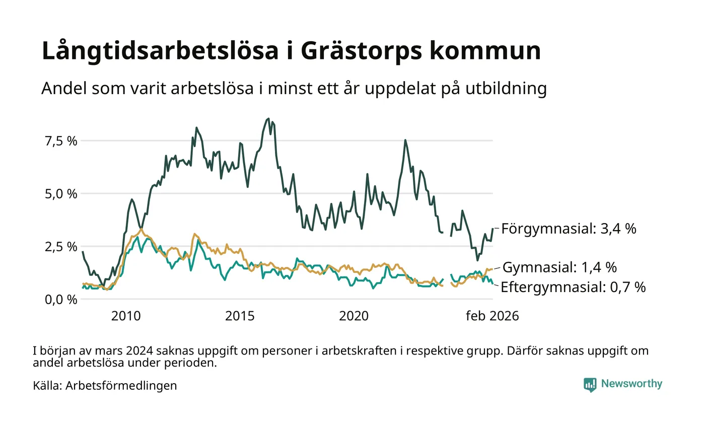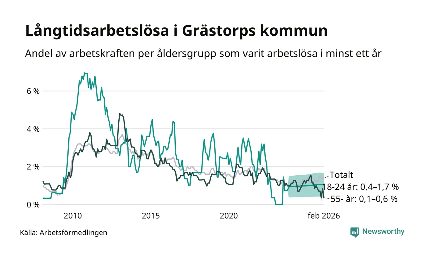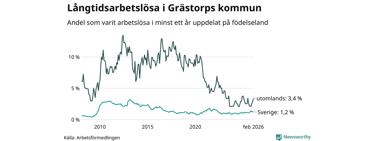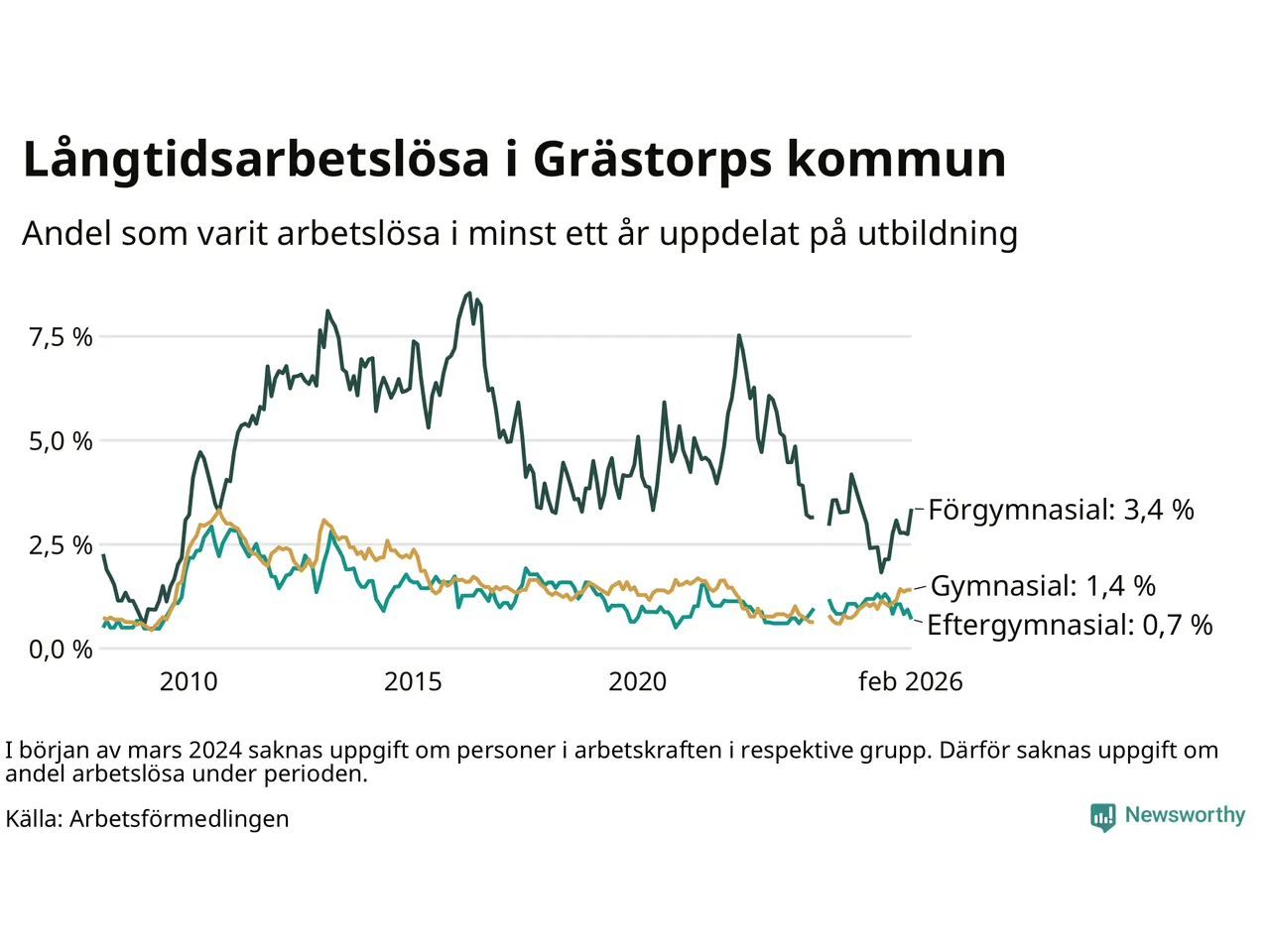 I februari hade 38 Grästorpsbor varit arbetslösa i minst ett år, vilket är lika många som månaden innan. 38 personer motsvarar 1,4 procent av arbetskraften i kommunen – andelen långtidsarbetslösa är ungefär på samma nivå som för ett år sedan.