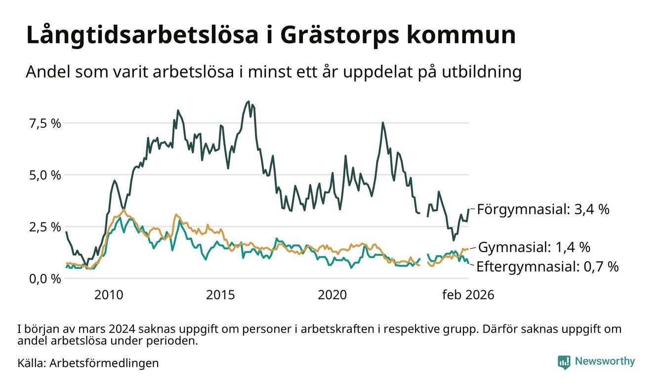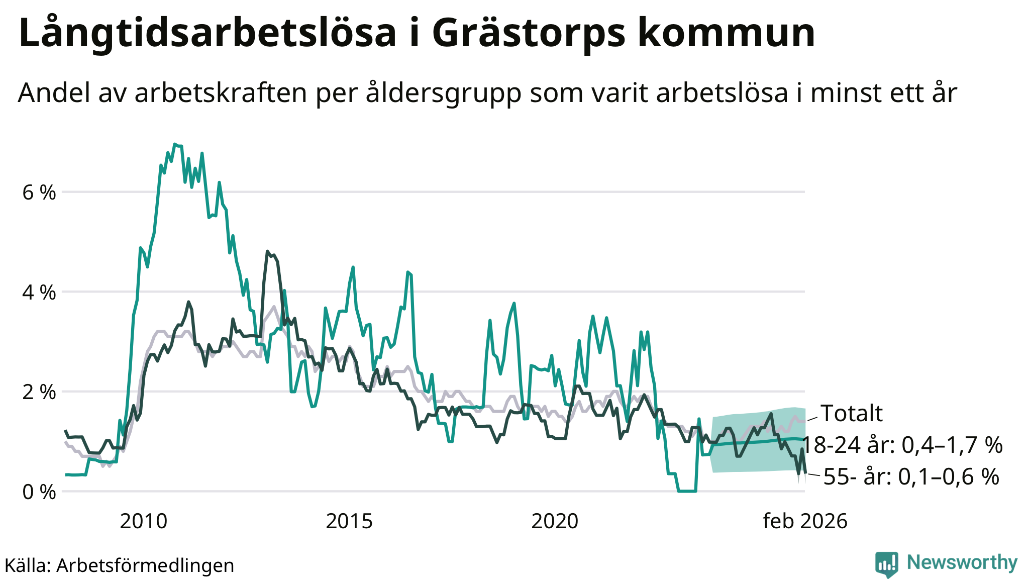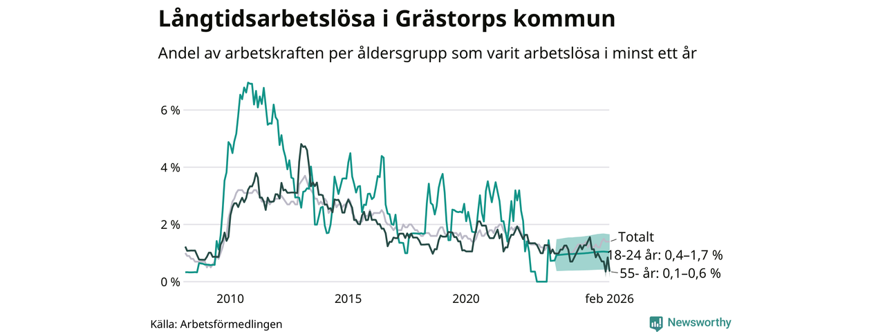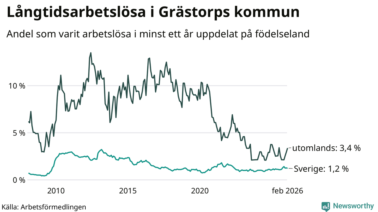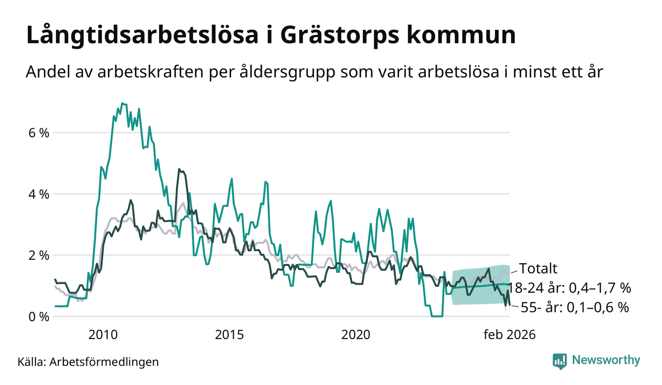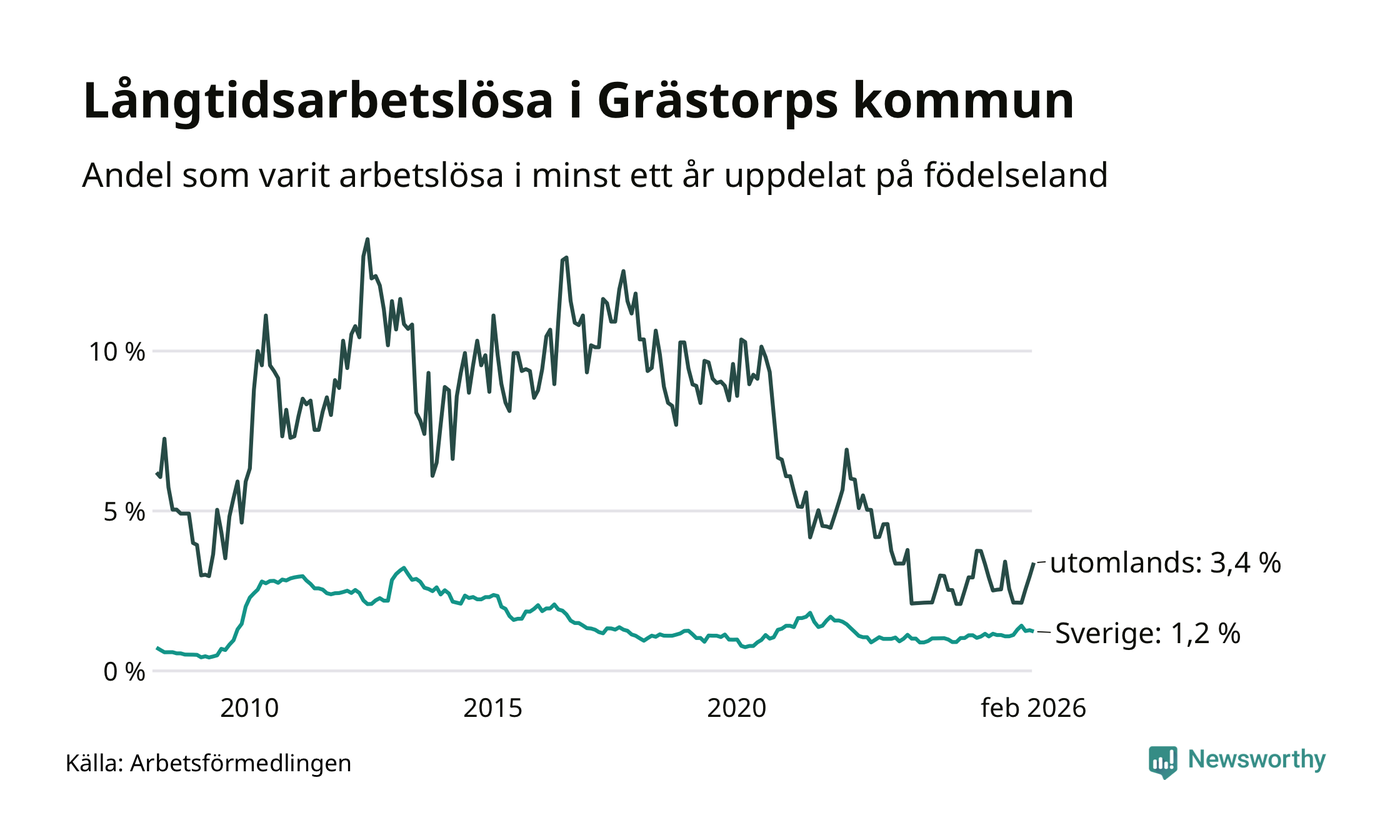 I februari hade 38 Grästorpsbor varit arbetslösa i minst ett år, vilket är lika många som månaden innan. 38 personer motsvarar 1,4 procent av arbetskraften i kommunen – andelen långtidsarbetslösa är ungefär på samma nivå som för ett år sedan.