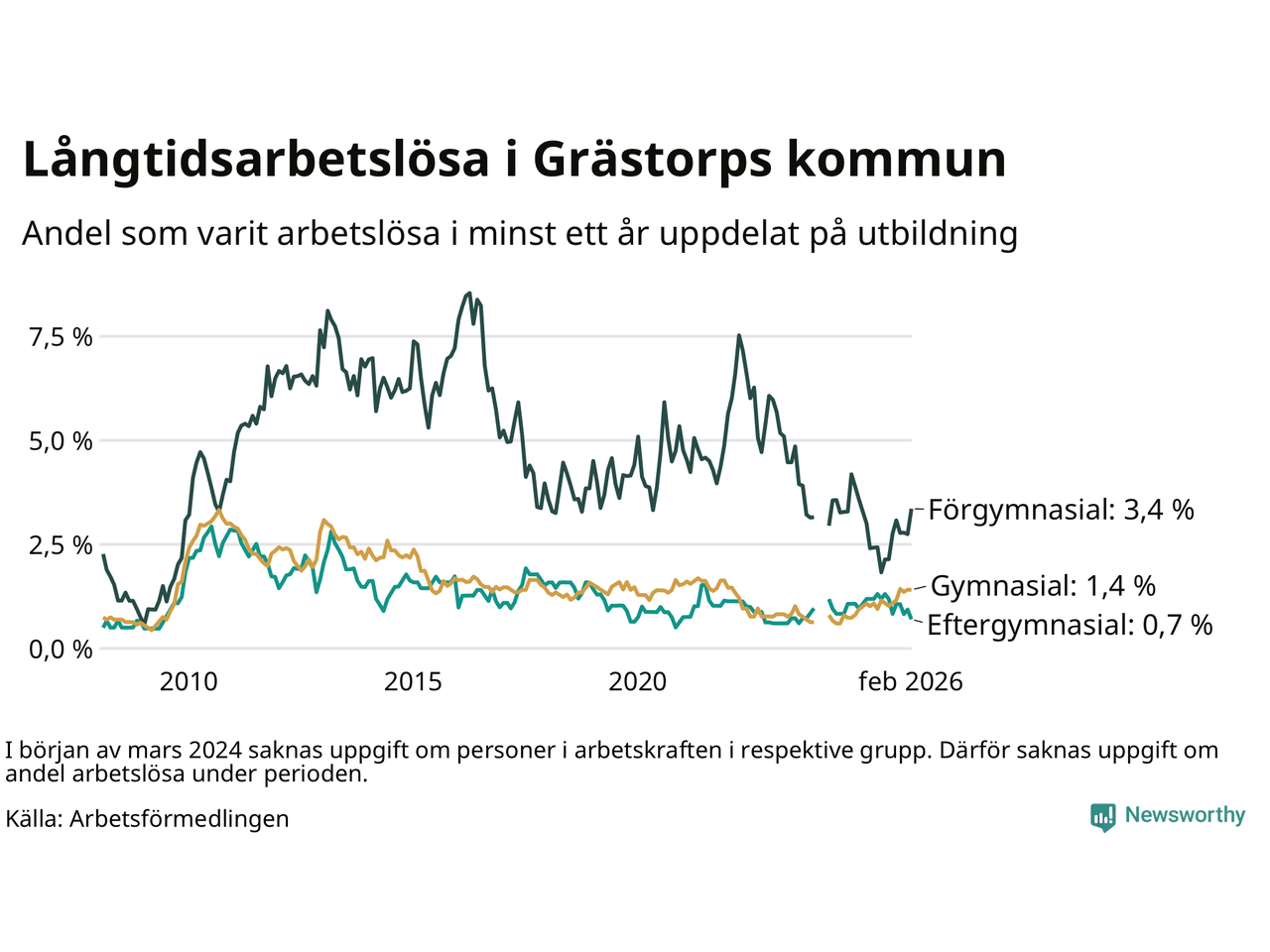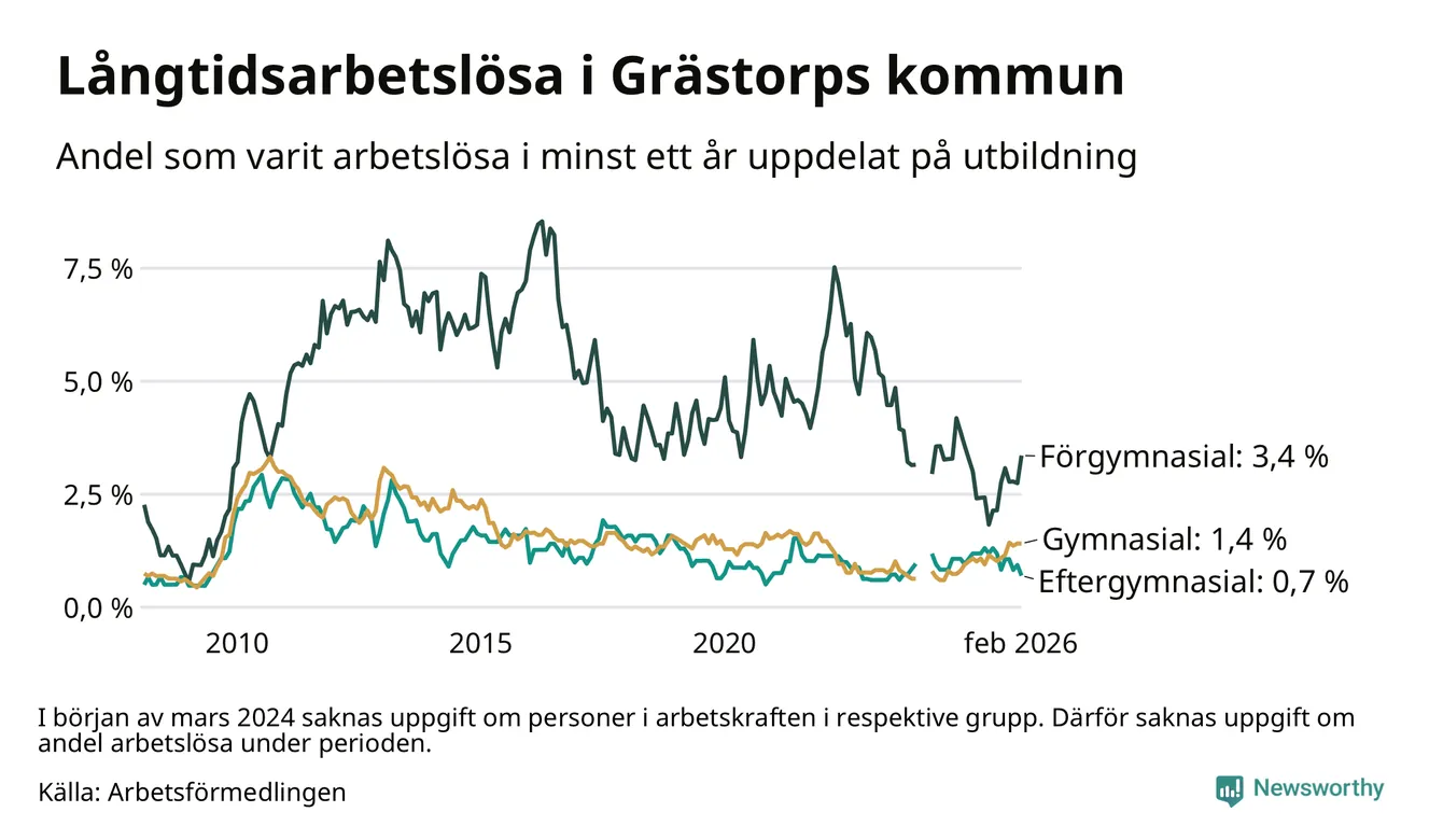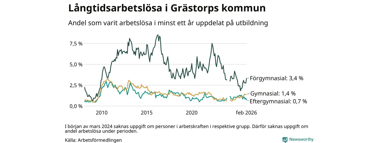 Andelen som varit utan arbete i minst ett år i Grästorp var ungefär lika stor i februari jämfört med samma månad för ett år sedan. Det visar Arbetsfömedlingens senaste månadsstatistik.