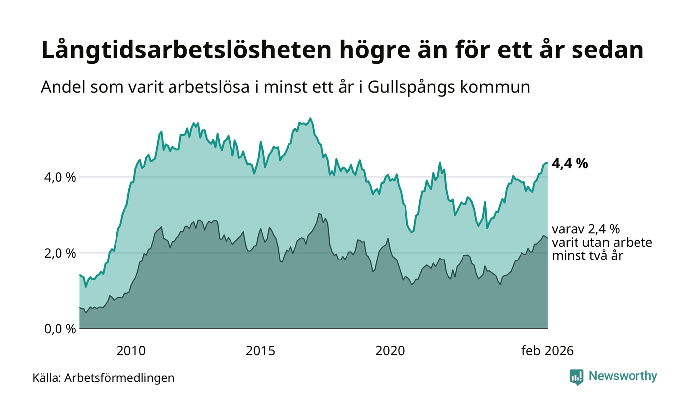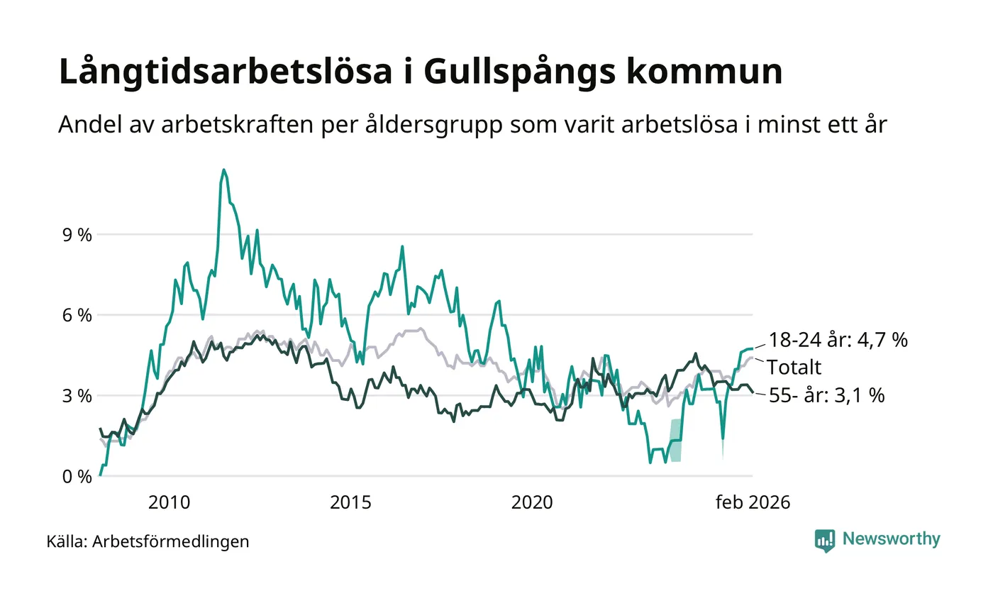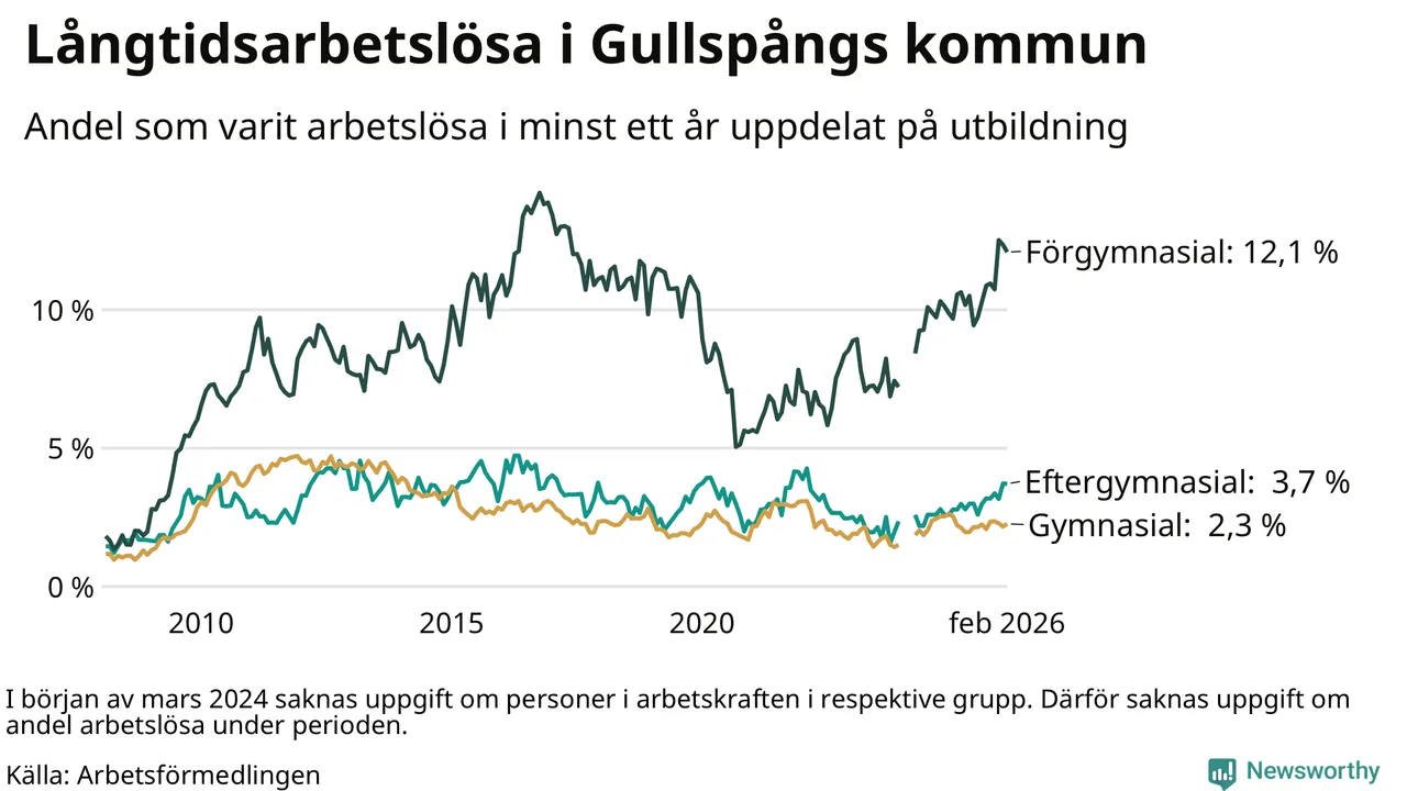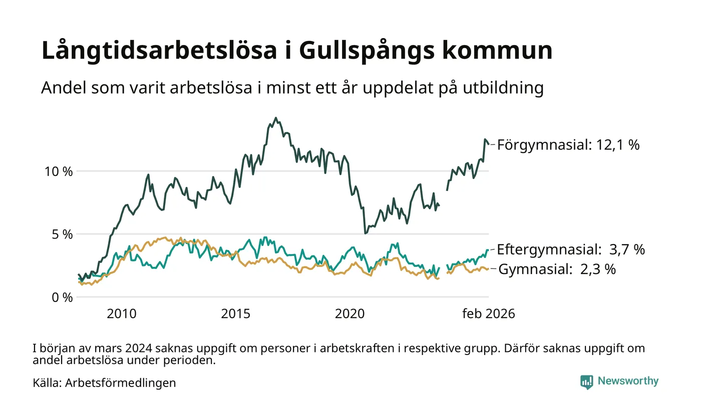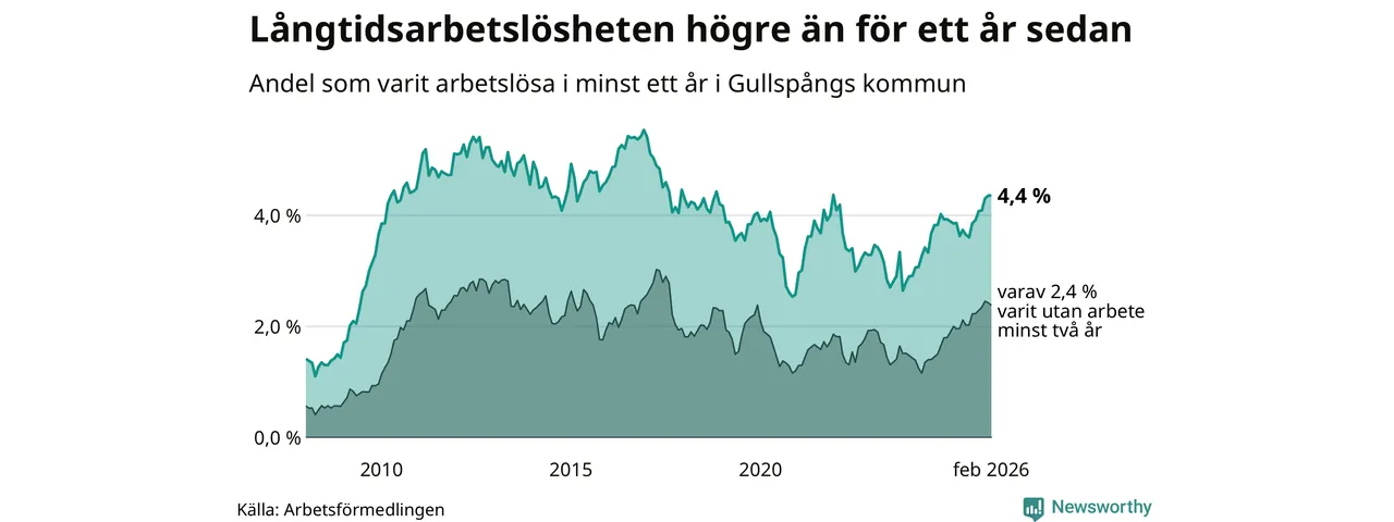 Inte sedan december 2021 har andelen långtidsarbetslösa varit så hög i Gullspång. Det visar Arbetsförmedlingens senaste månadsstatistik.