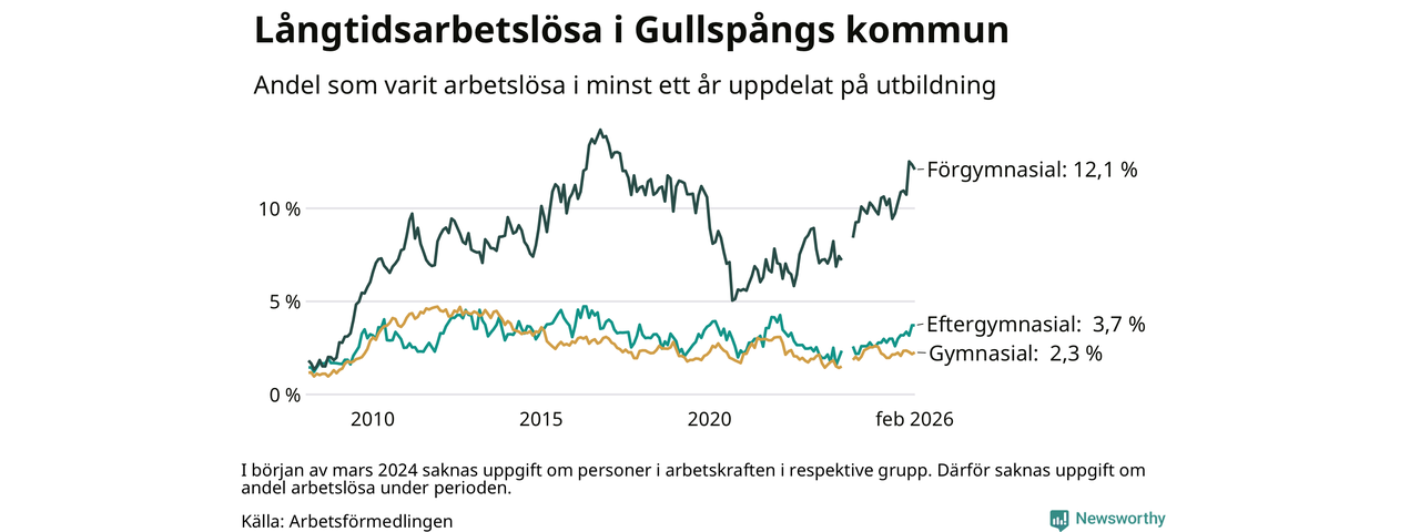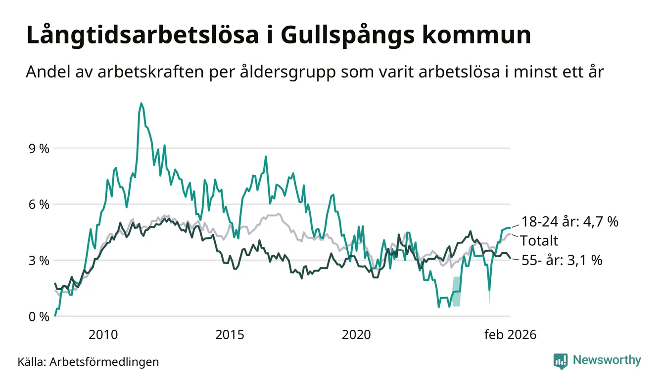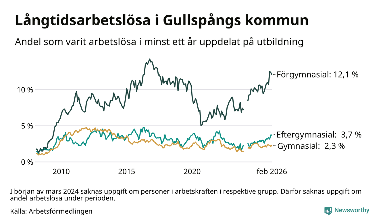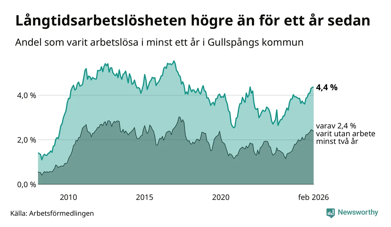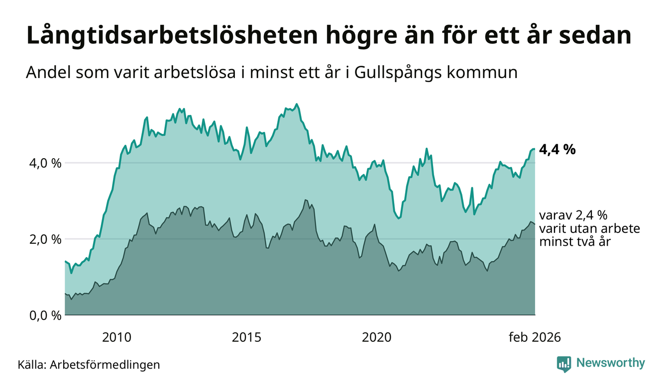 Inte sedan december 2021 har andelen långtidsarbetslösa varit så hög i Gullspång. Det visar Arbetsförmedlingens senaste månadsstatistik.