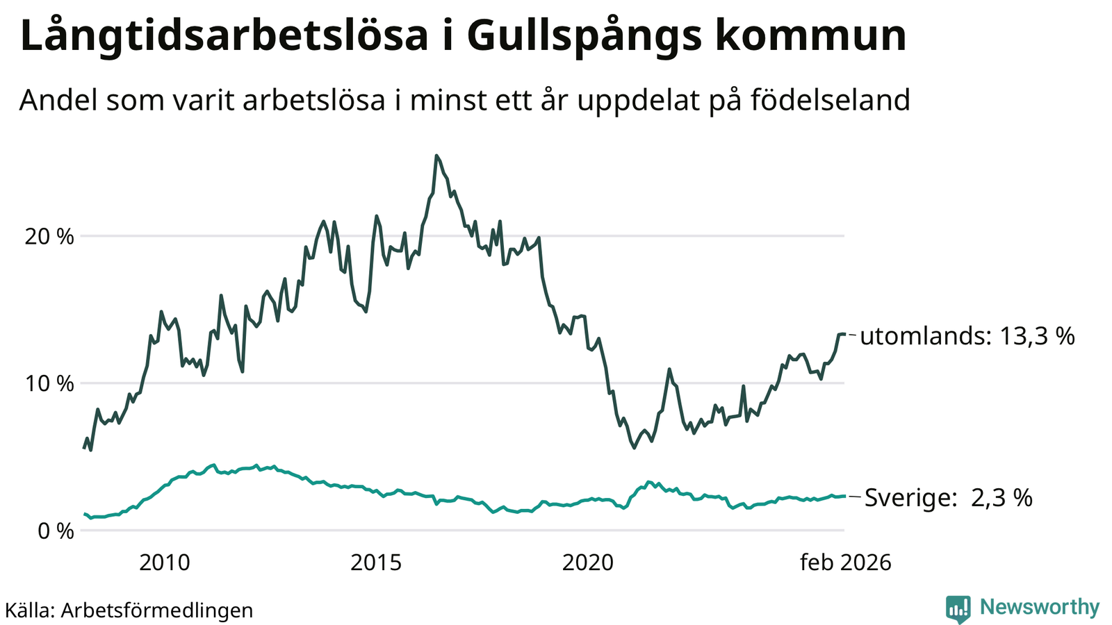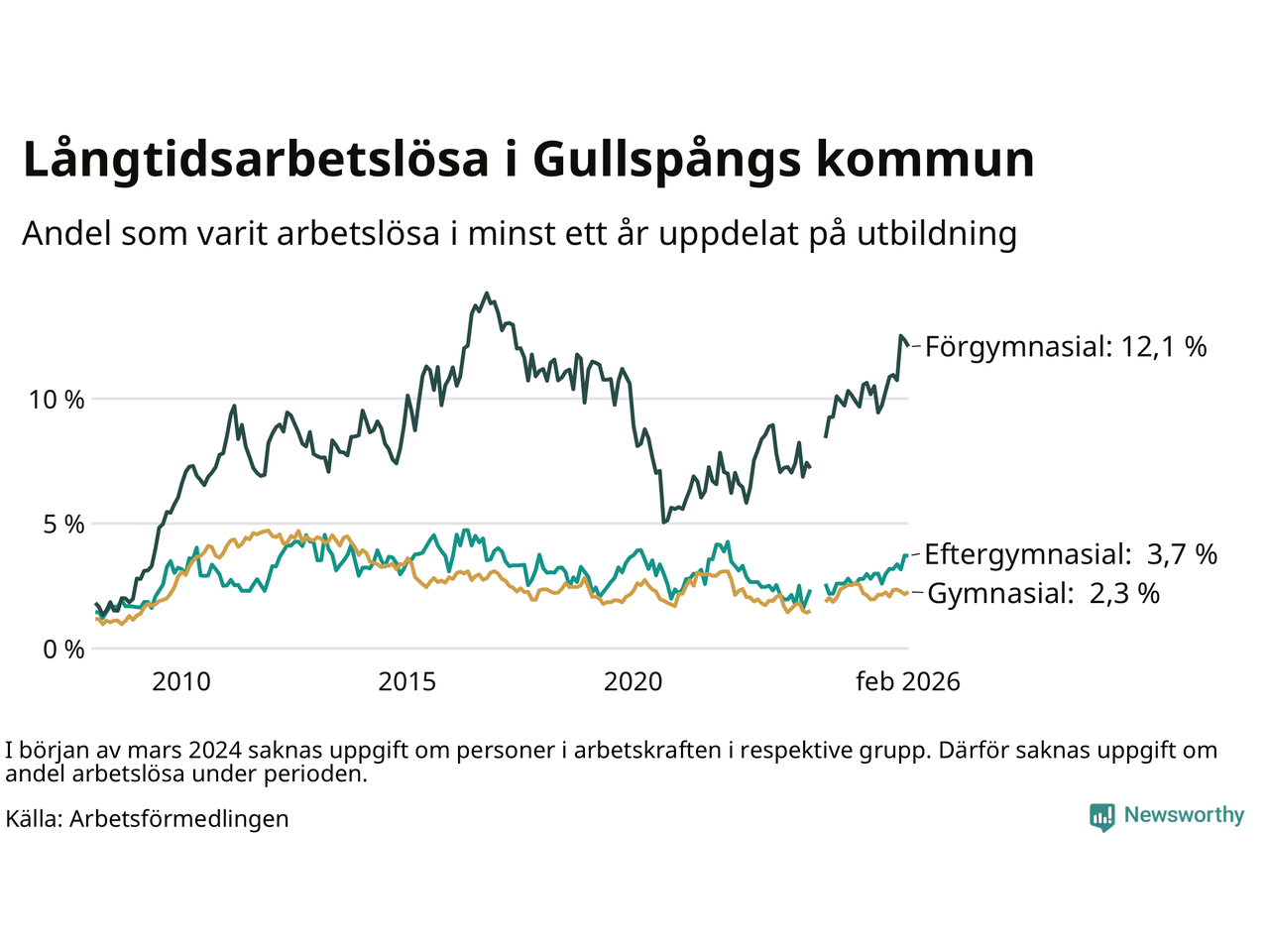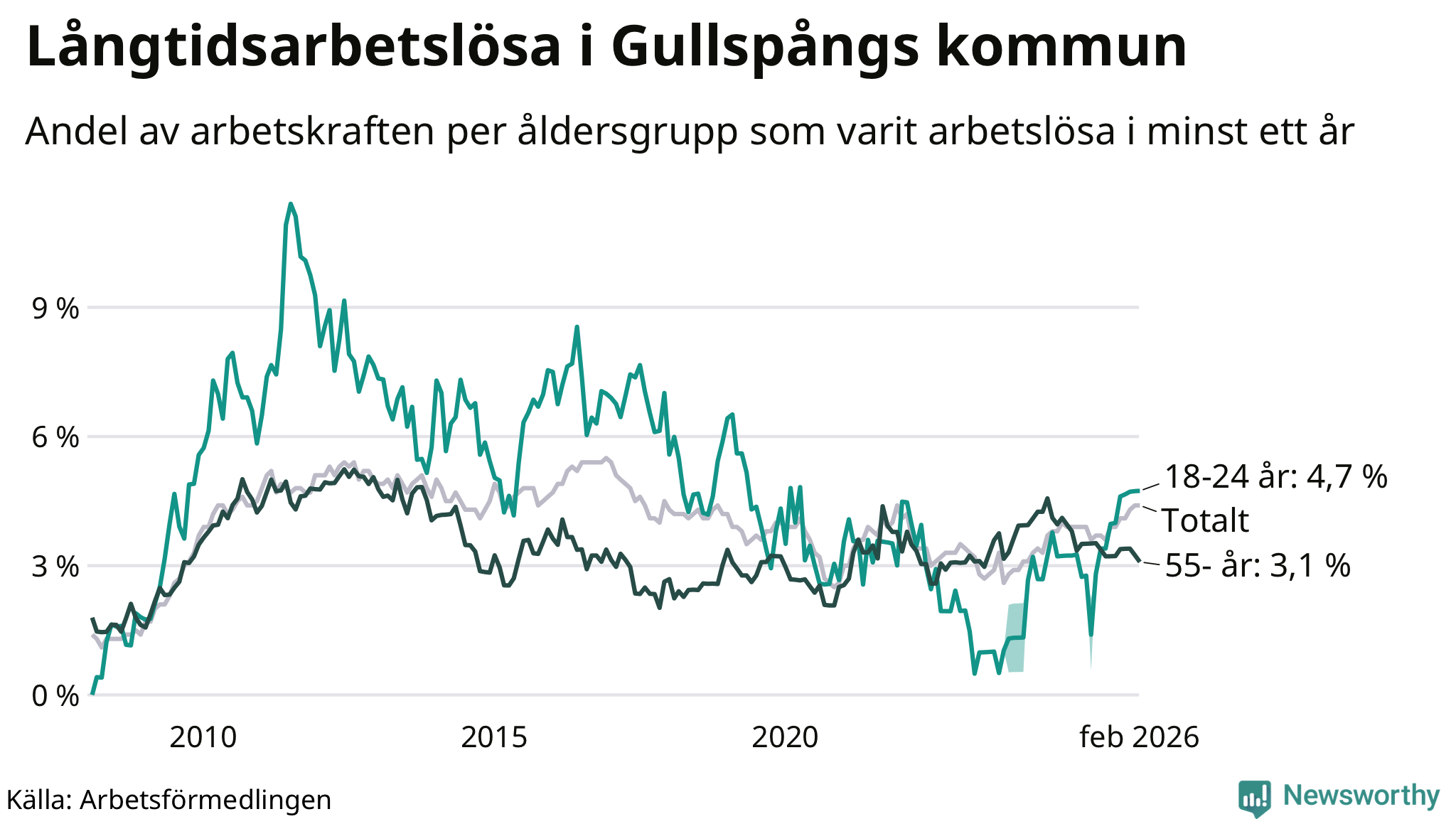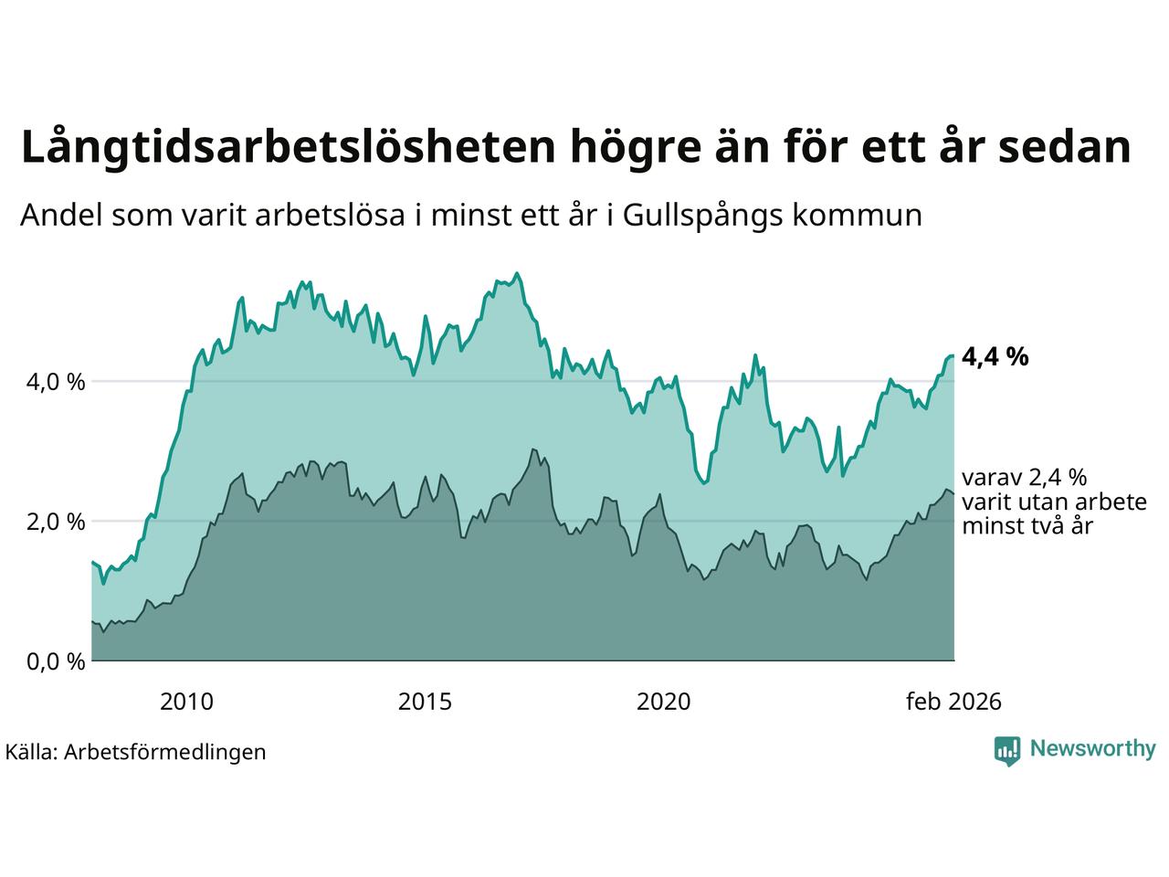 Inte sedan december 2021 har andelen långtidsarbetslösa varit så hög i Gullspång. Det visar Arbetsförmedlingens senaste månadsstatistik.