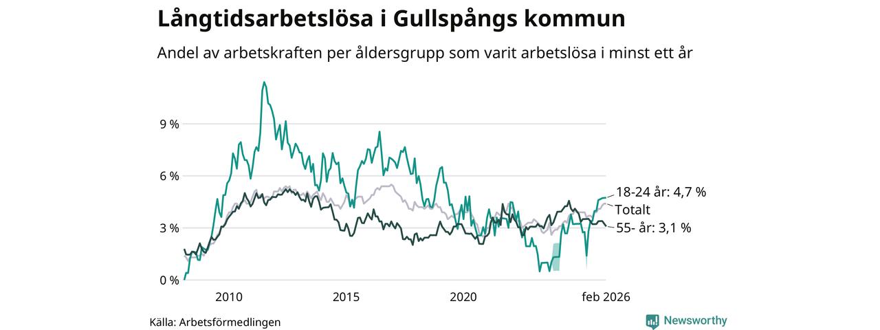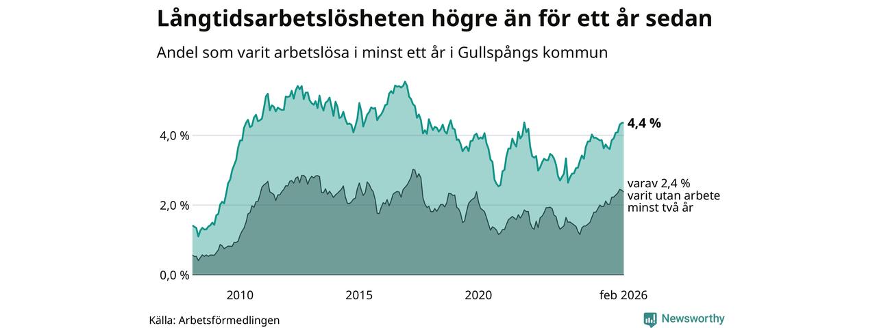 I februari hade 88 Gullspångsbor varit arbetslösa i minst ett år, vilket är lika många som månaden innan. Det är den sjunde månaden i rad med ökande eller oförändrat antal långtidsarbetslösa. 88 personer motsvarar 4,4 procent av arbetskraften i kommunen – andelen långtidsarbetslösa är 0,5 procentenheter högre än samma månad för ett år sedan. Gullspång tillhör de kommuner som har högst andel långtidsarbetslösa i hela landet just nu.