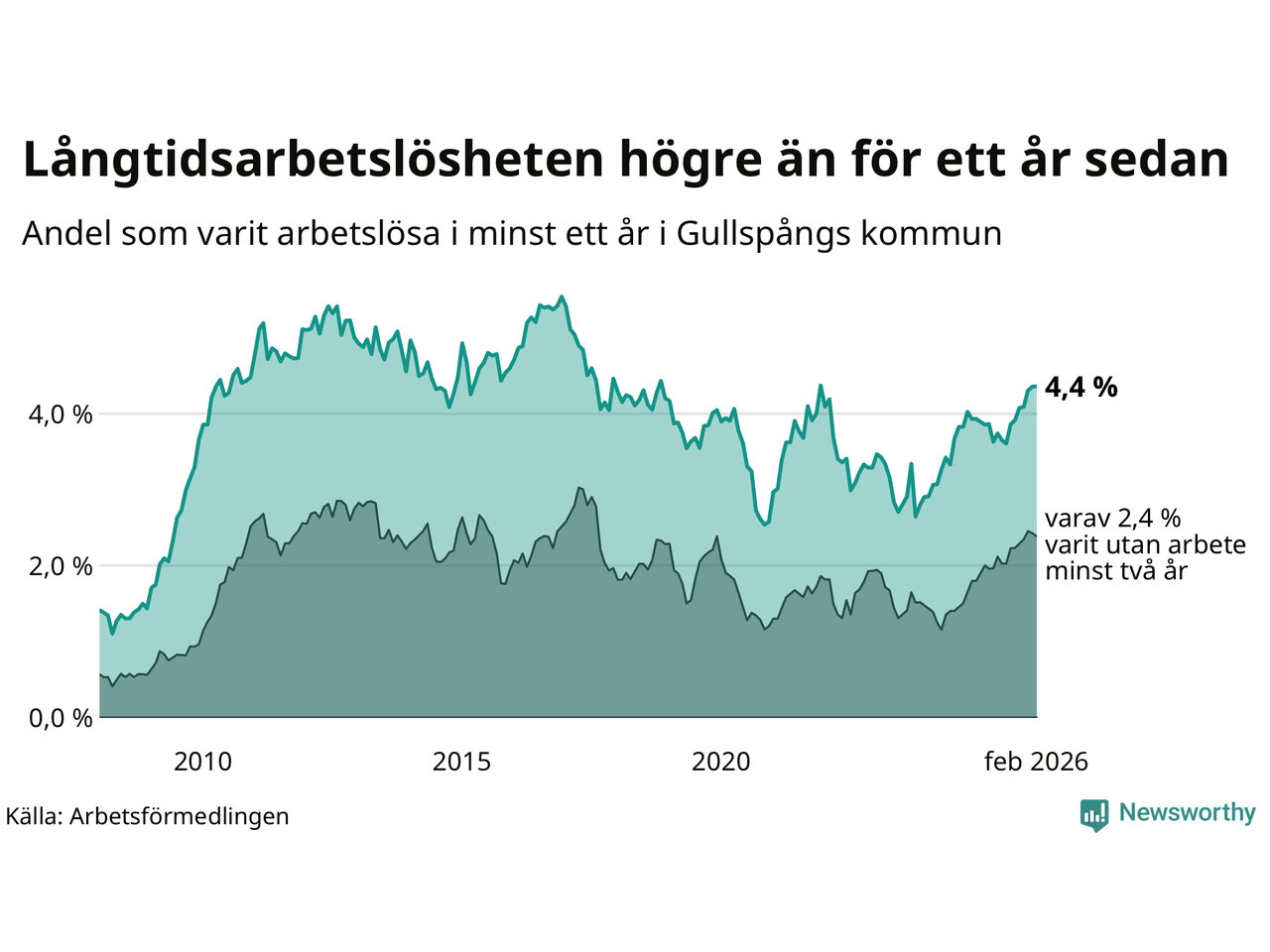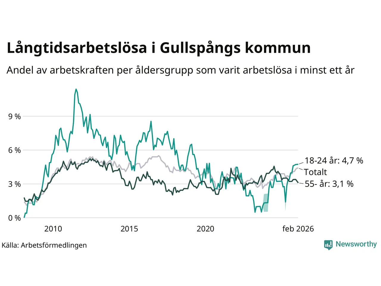 | Andel arbetslösa i minst ett år | 4,4 % | 2,5 % | 2,9 % |