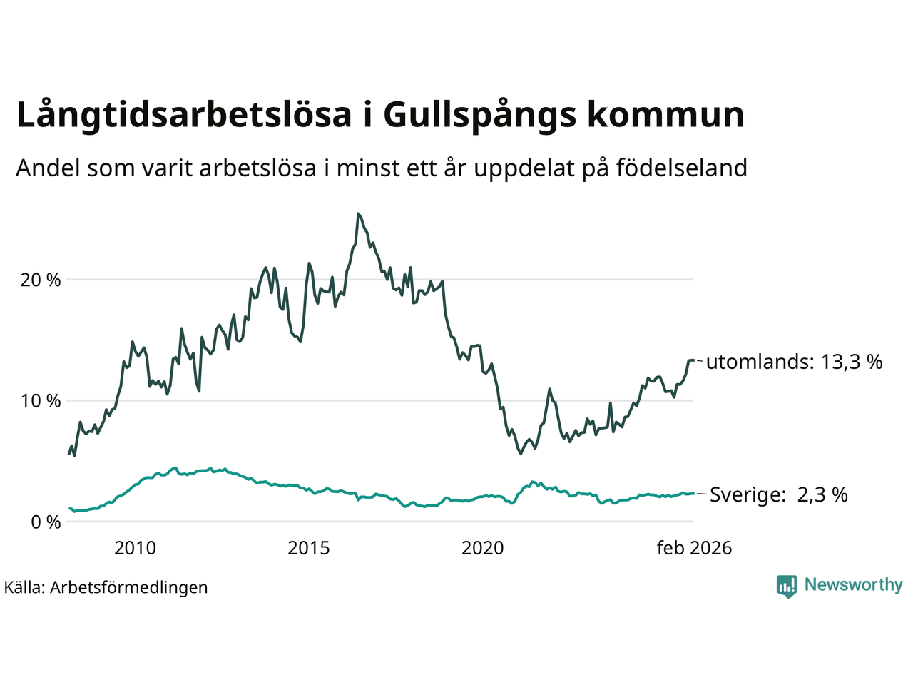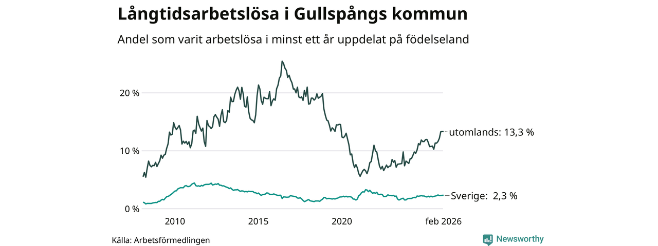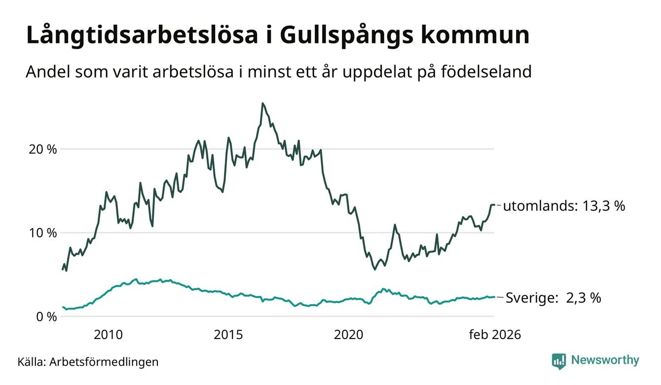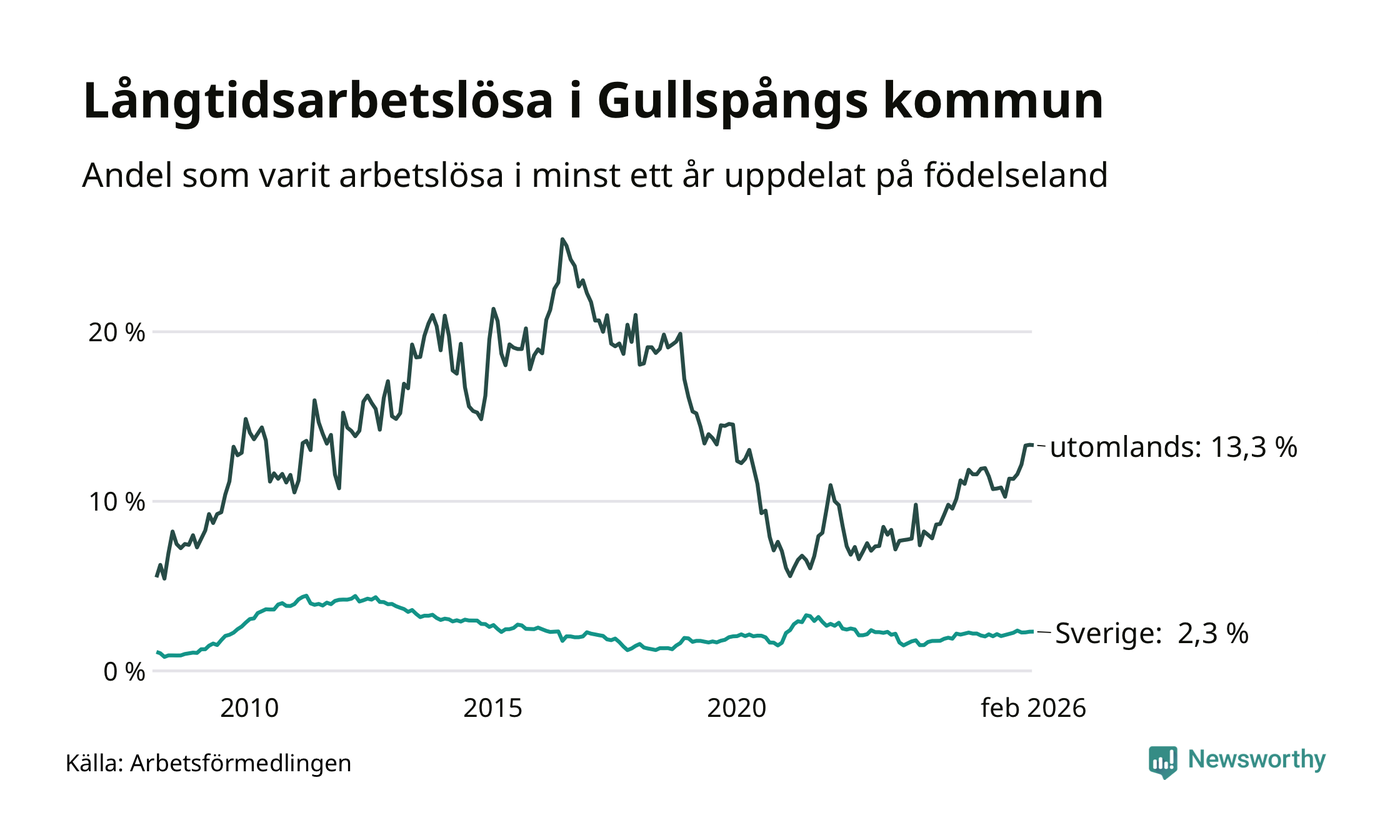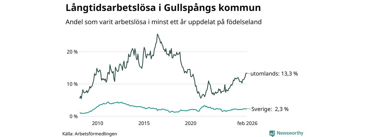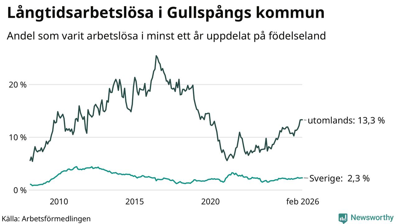 38 av de långtidsarbetslösa i Gullspång är födda i Sverige, medan 50 är födda utomlands. Det innebär att långtidsarbetslösheten bland Sverigefödda är 2,3 procent, medan den är sex gånger så hög – 13,3 procent – bland födda utomlands. Även i riket som helhet är arbetslösheten högre bland utrikesfödda.