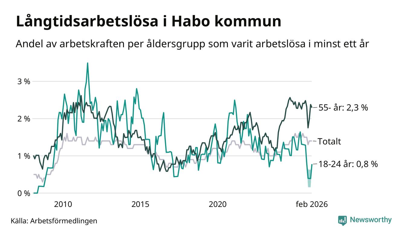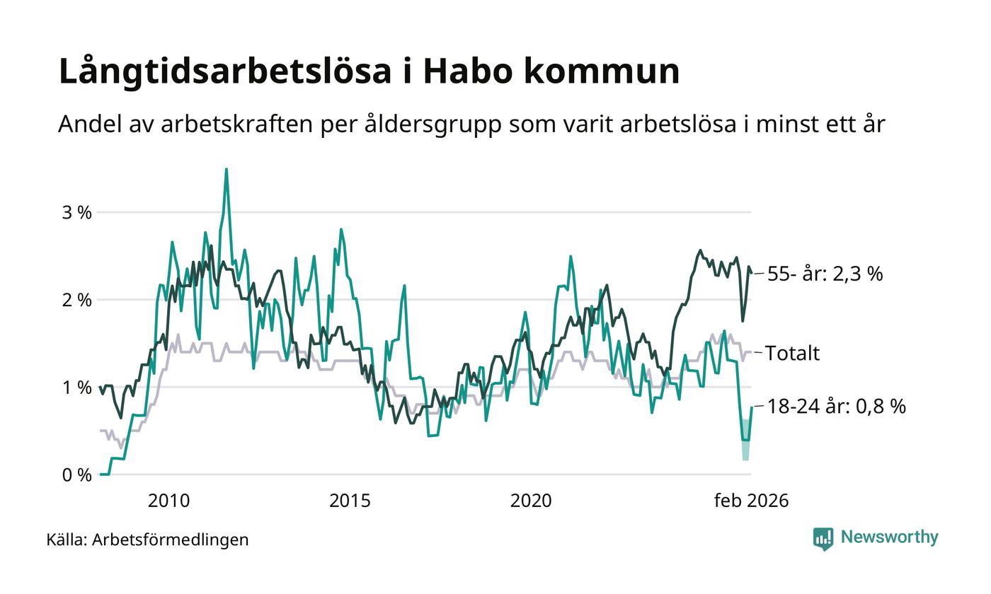 Av de 97 personerna som varit arbetslösa i mer än ett år i Habo kommun är 29 personer mellan 55 och 661 år och fem är mellan 18 och 24 år. För den äldre gruppen är andelen arbetslösa 2,3 procent medan den i den yngre gruppen är 0,8 procent. Även i riket som helhet är långtidsarbetslösheten högre i gruppen äldre.