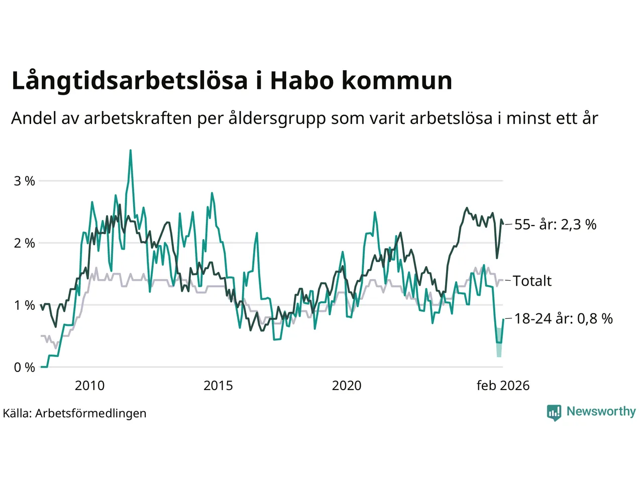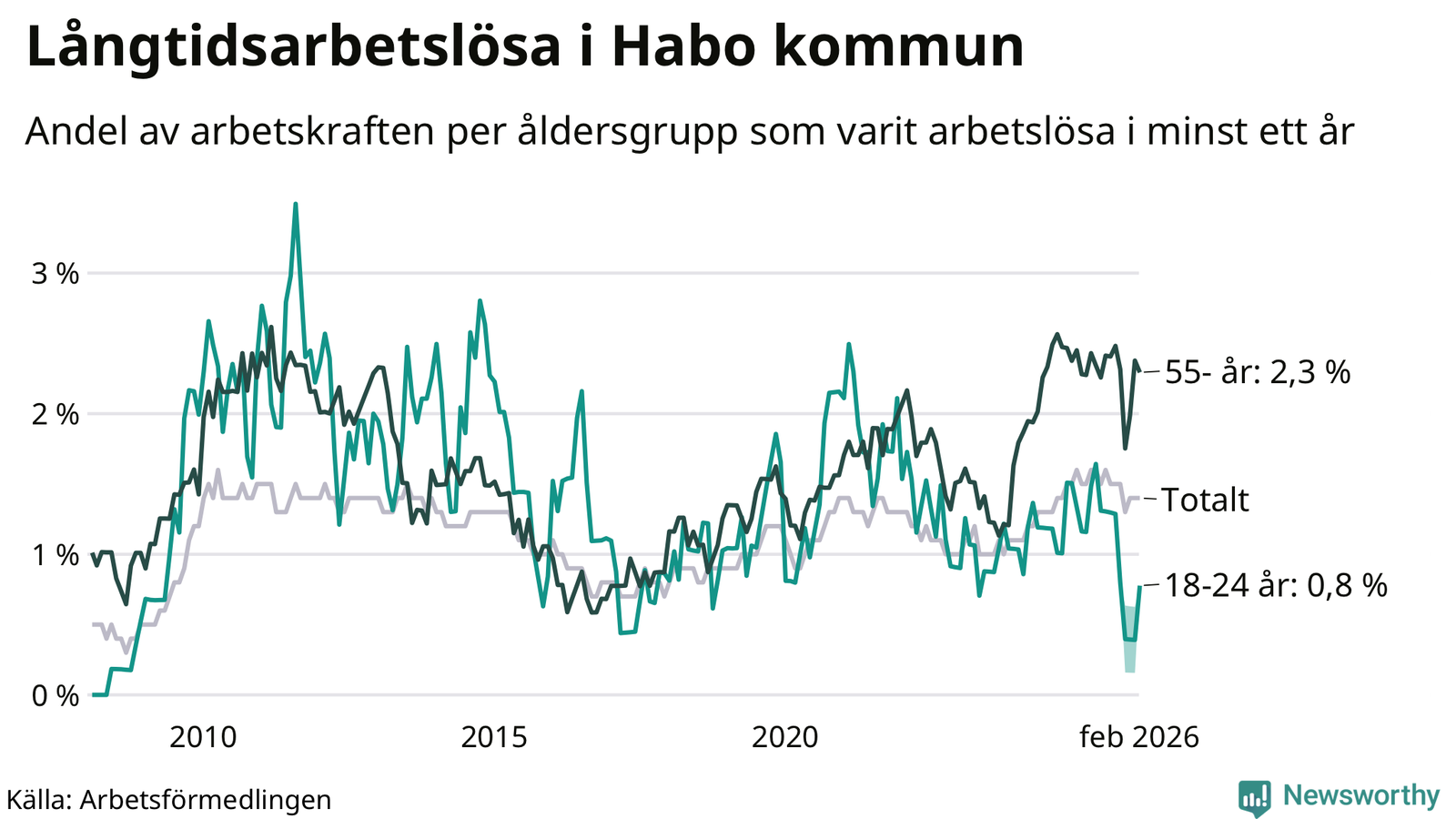 Graf: Andel arbetslösa uppdelat i åldersgrupper i Habo