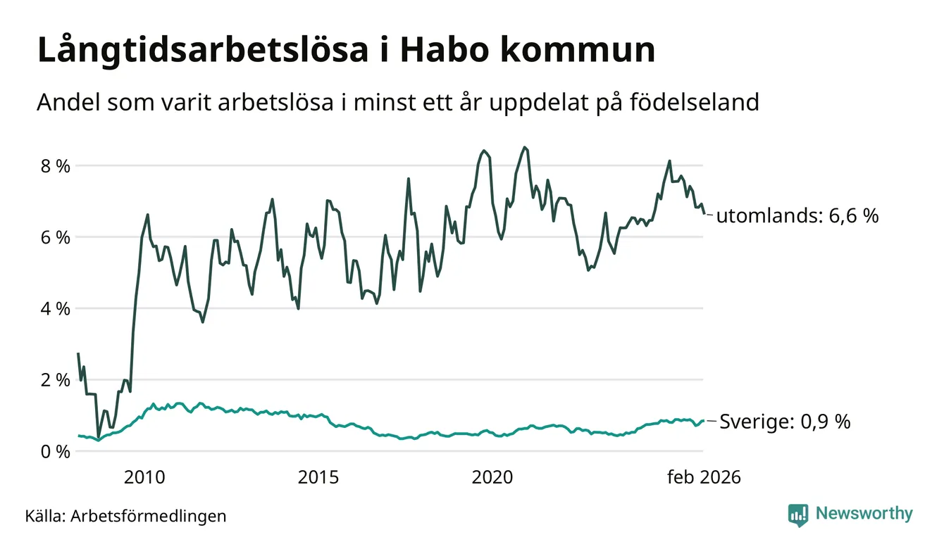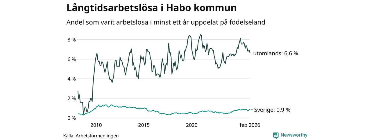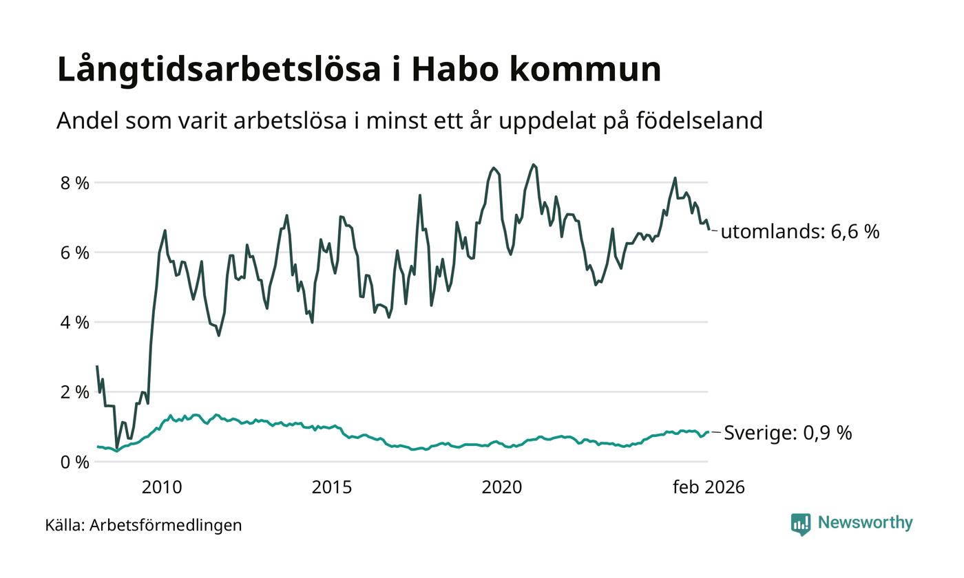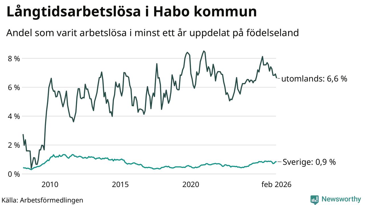 52 av de långtidsarbetslösa i Habo är födda i Sverige, medan 45 är födda utomlands. Det innebär att långtidsarbetslösheten bland Sverigefödda är 0,9 procent, medan den är sju gånger så hög – 6,6 procent – bland födda utomlands. Även i riket som helhet är arbetslösheten högre bland utrikesfödda.