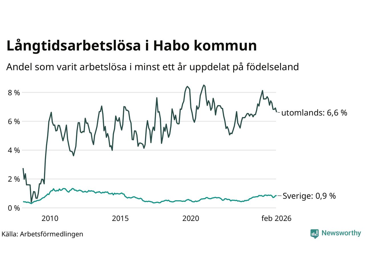 Graf: Andel arbetslösa uppdelat på födelseland i Habo