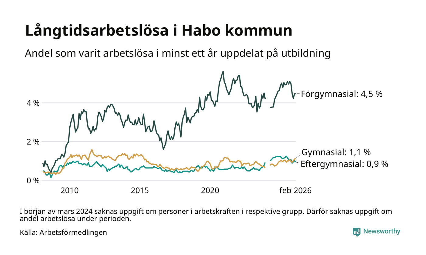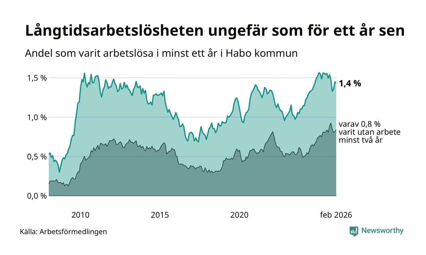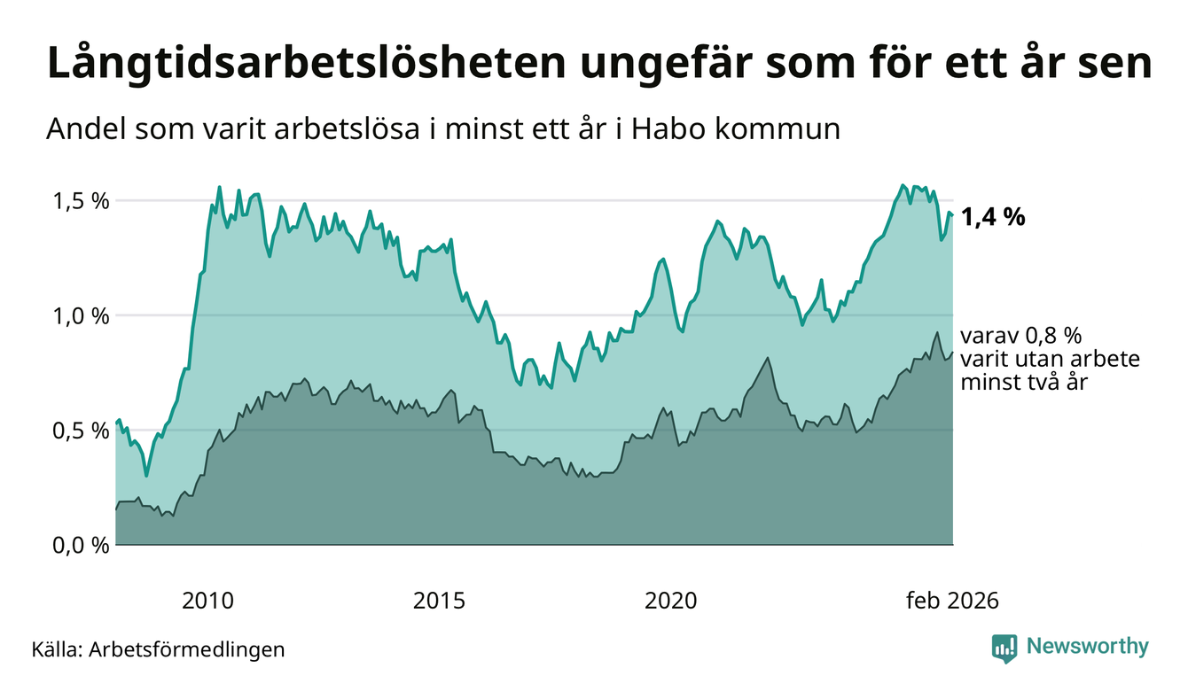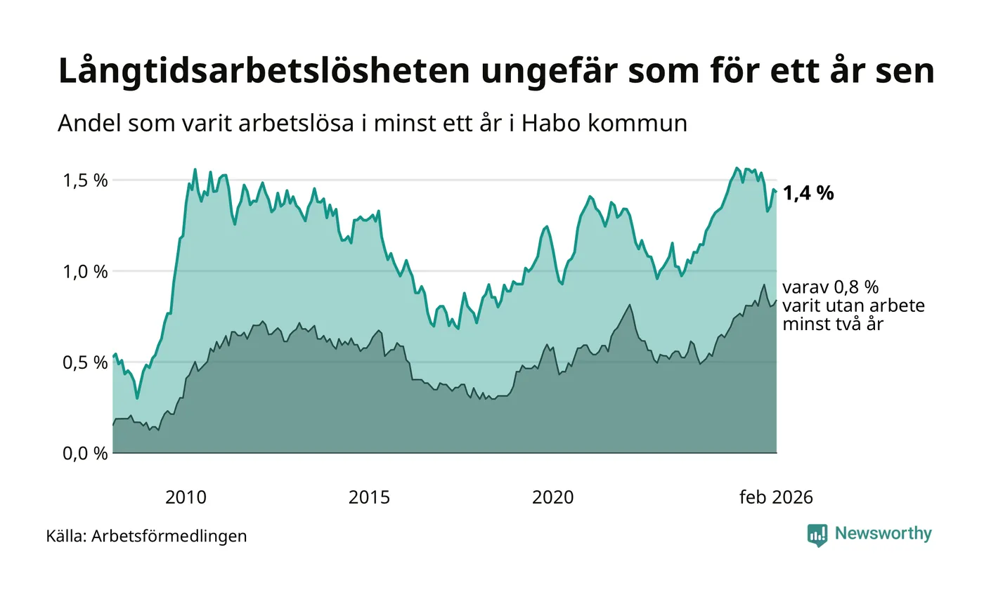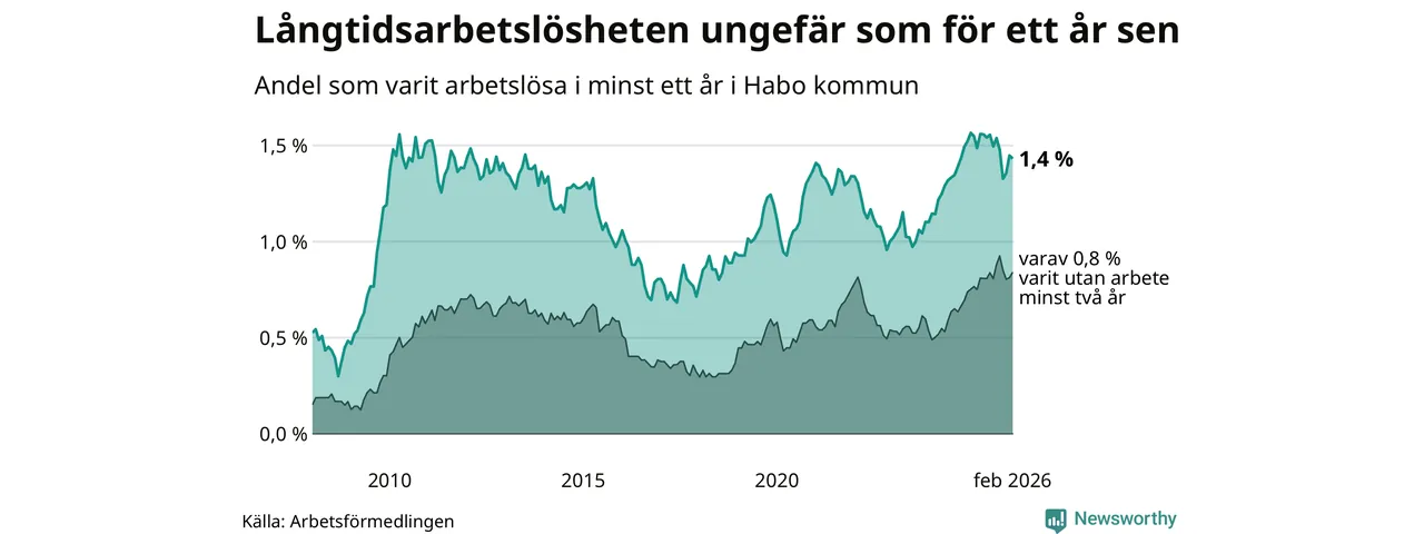 Andelen som varit utan arbete i minst ett år i Habo var ungefär lika stor i februari jämfört med samma månad för ett år sedan. Det visar Arbetsfömedlingens senaste månadsstatistik.