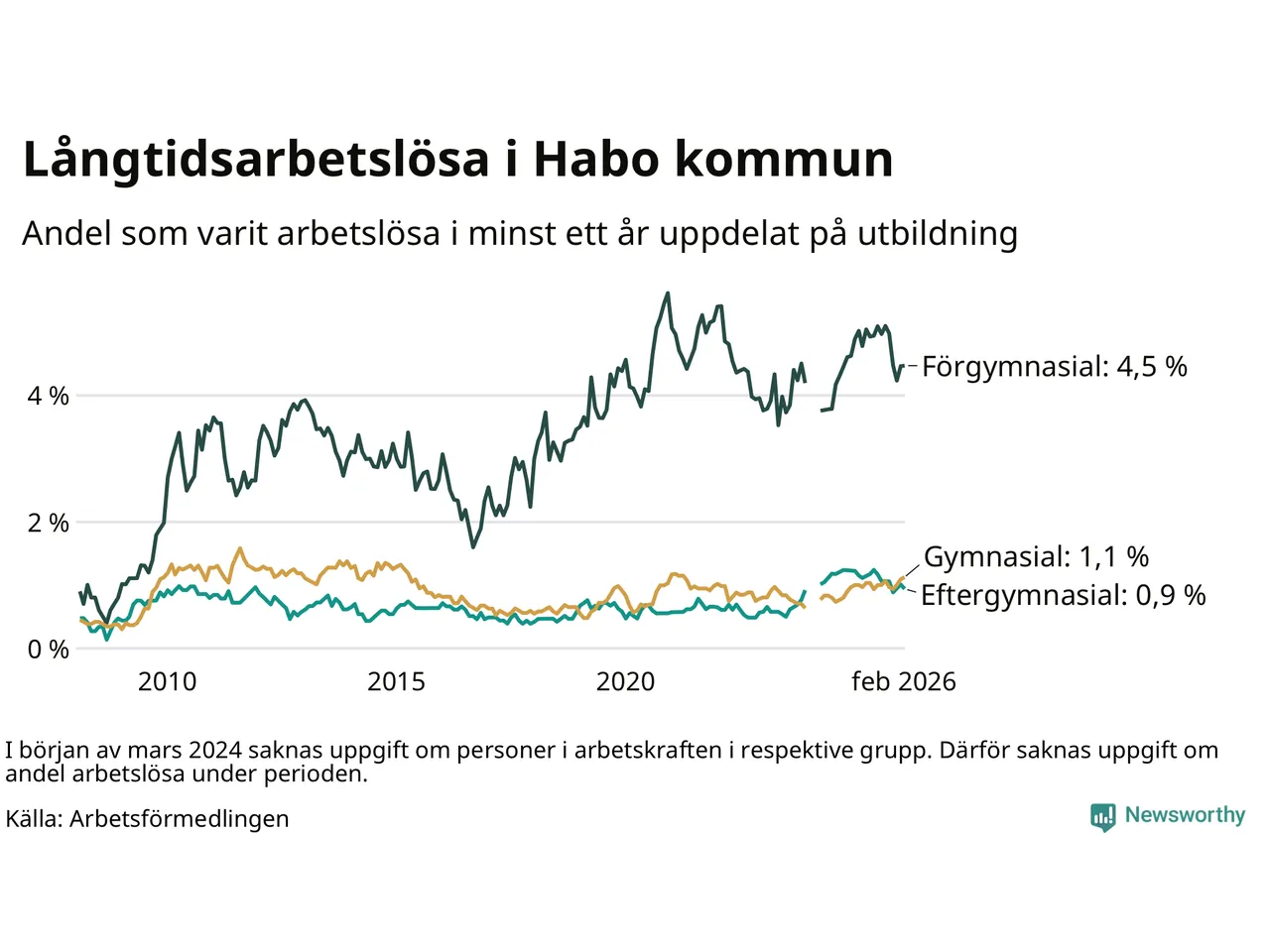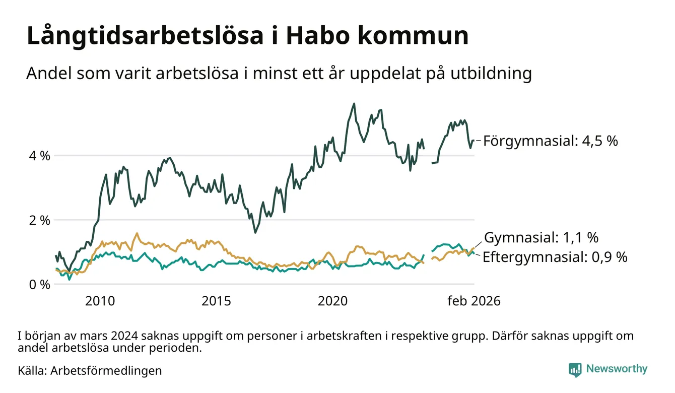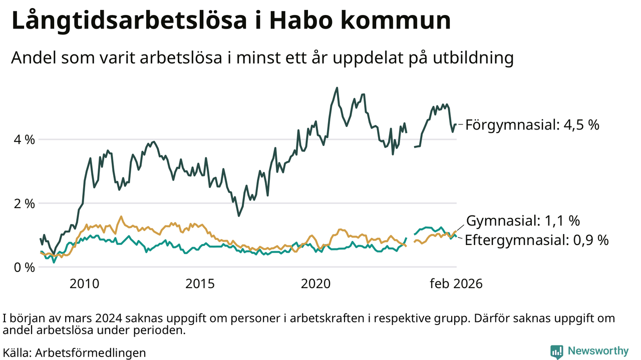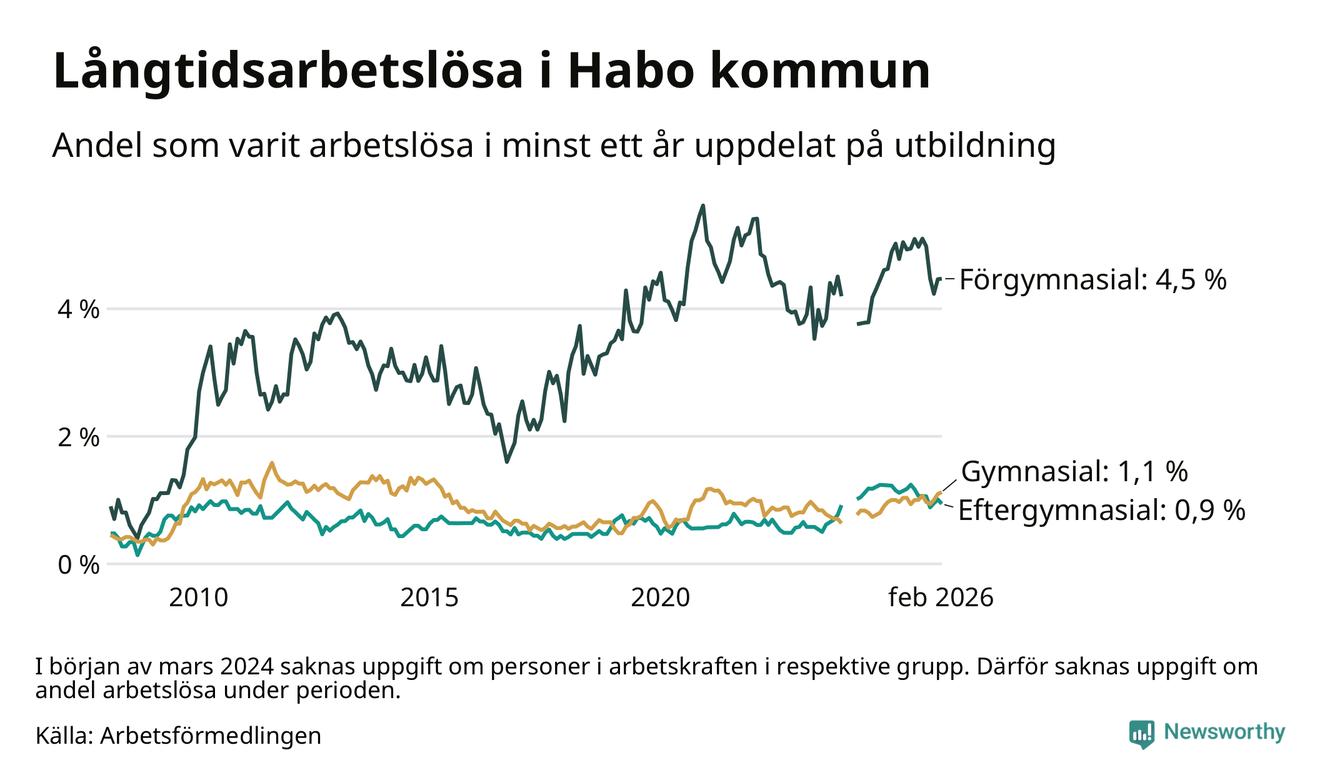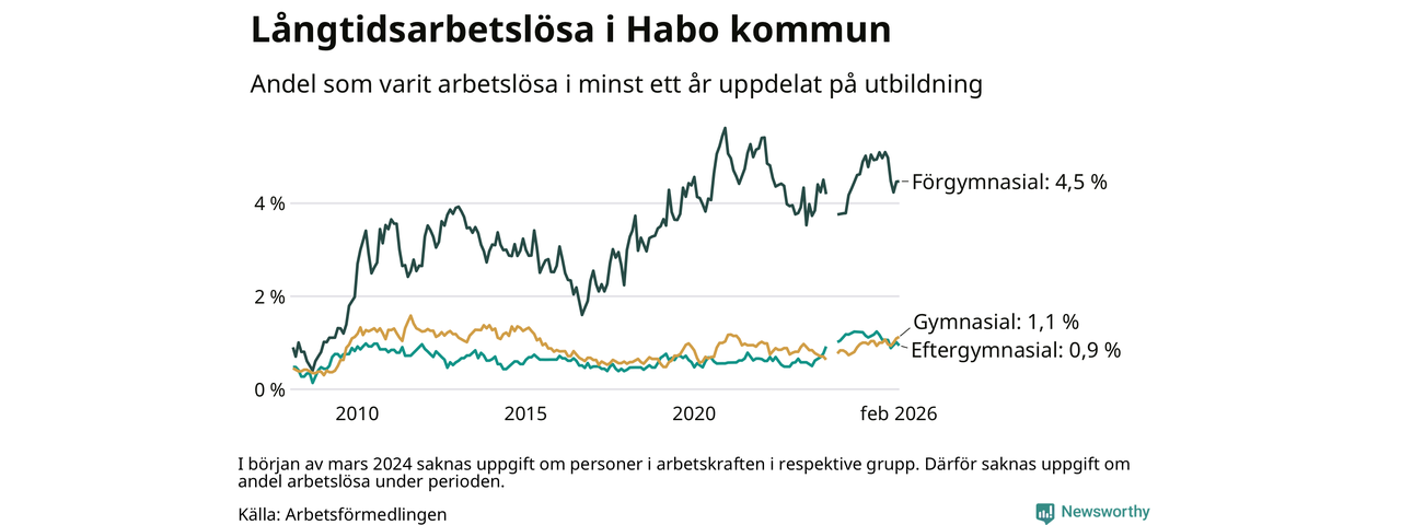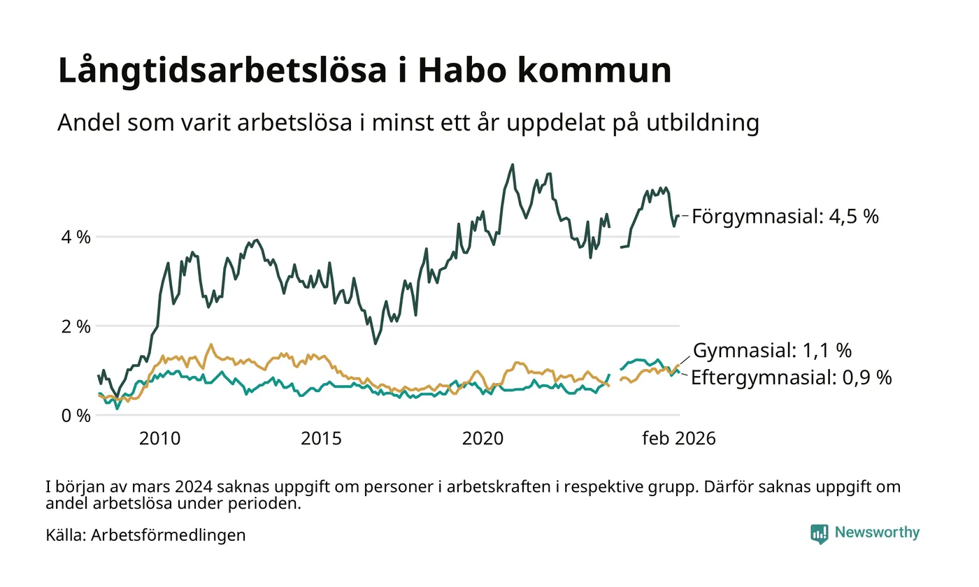 Andelen som varit utan arbete i minst ett år i Habo var ungefär lika stor i februari jämfört med samma månad för ett år sedan. Det visar Arbetsfömedlingens senaste månadsstatistik.
