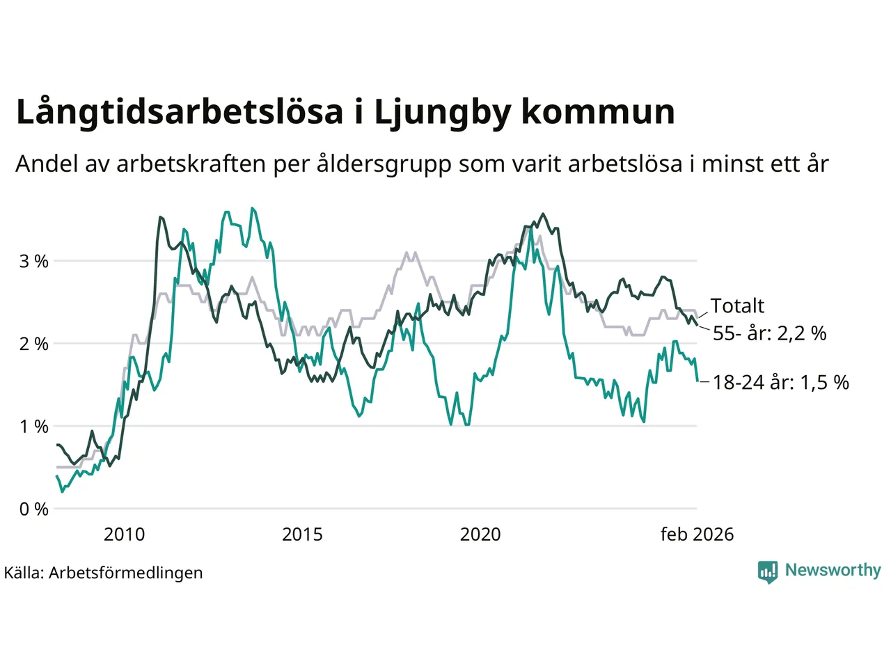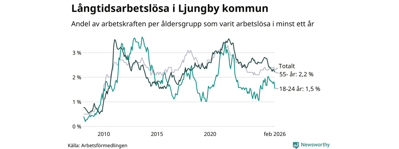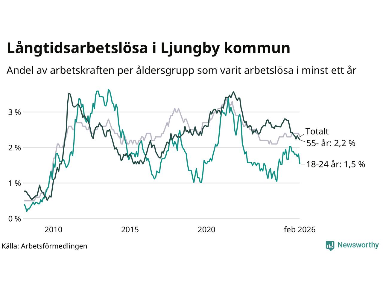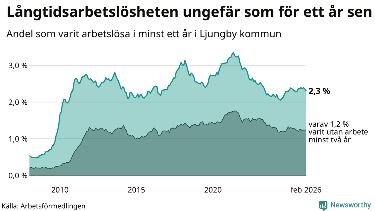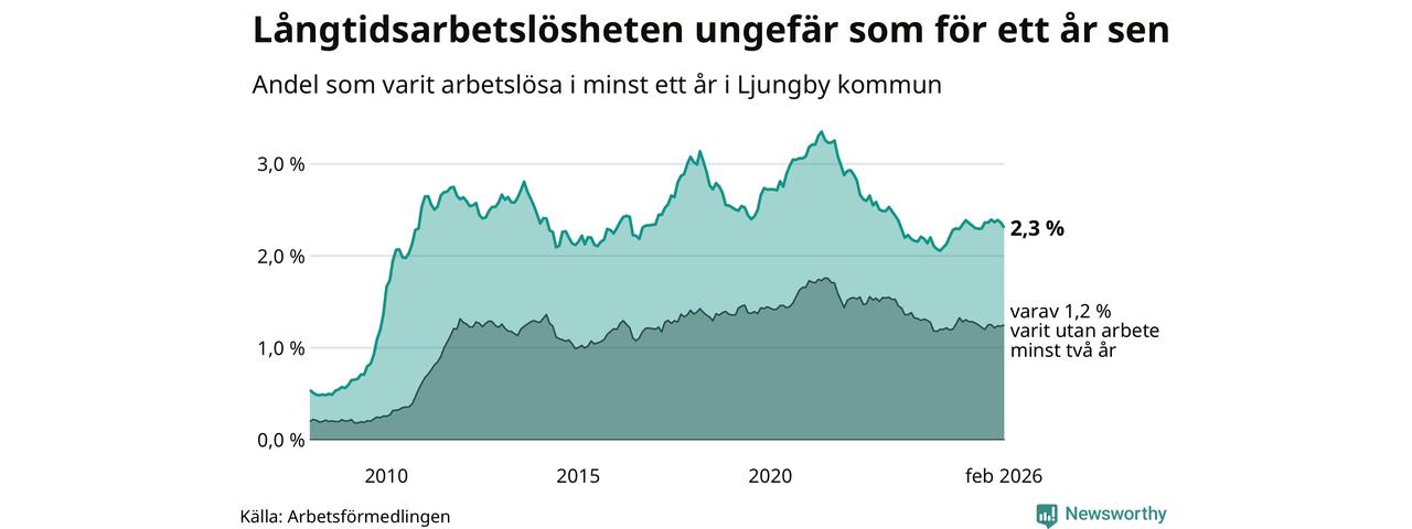 I februari hade 321 Ljungbybor varit arbetslösa i minst ett år, vilket är åtta färre än månaden innan. 321 personer motsvarar 2,3 procent av arbetskraften i kommunen – andelen långtidsarbetslösa är ungefär på samma nivå som för ett år sedan.