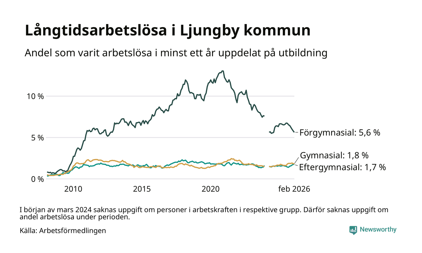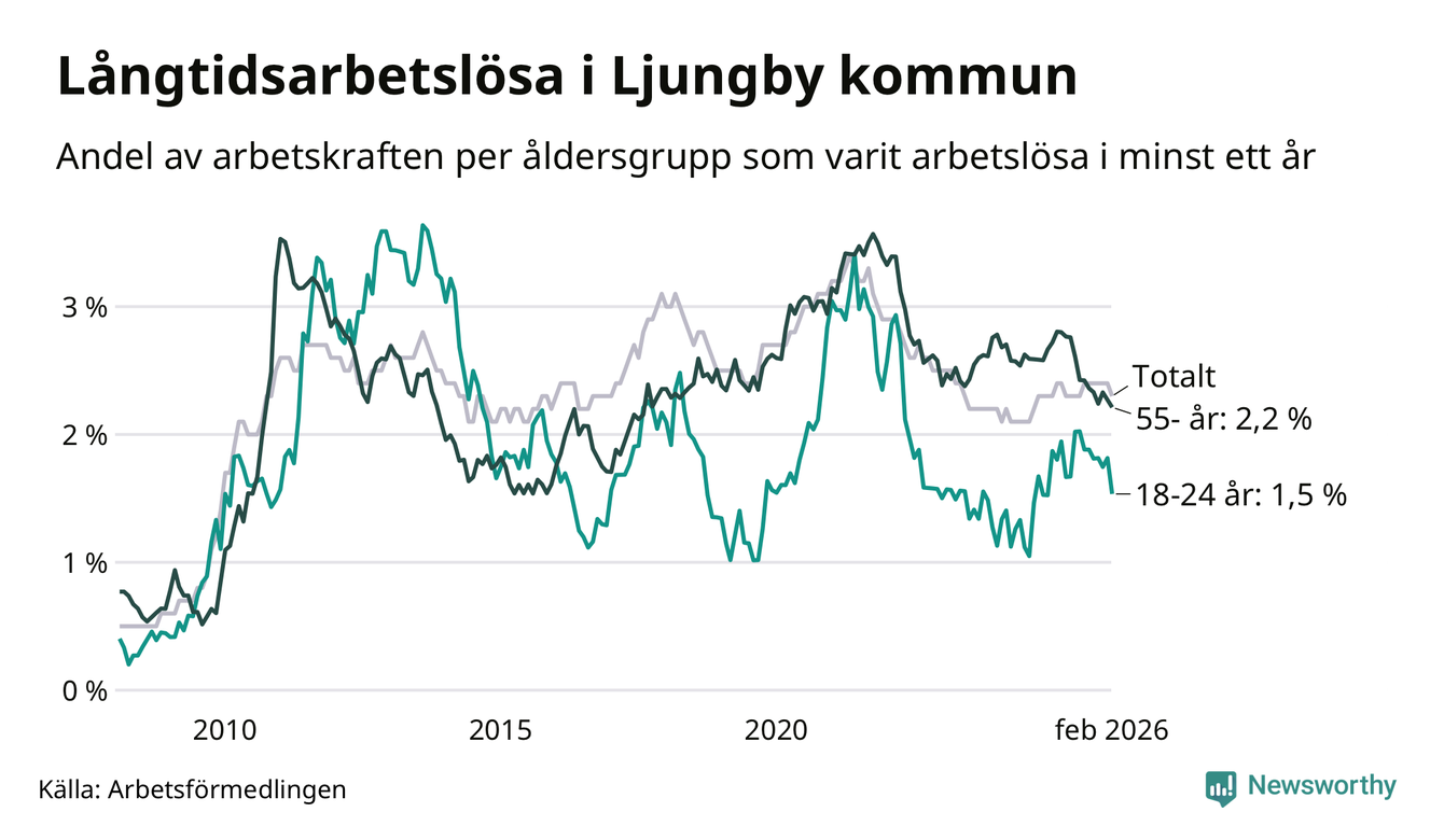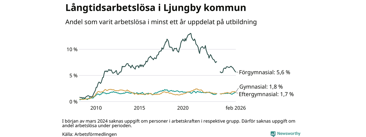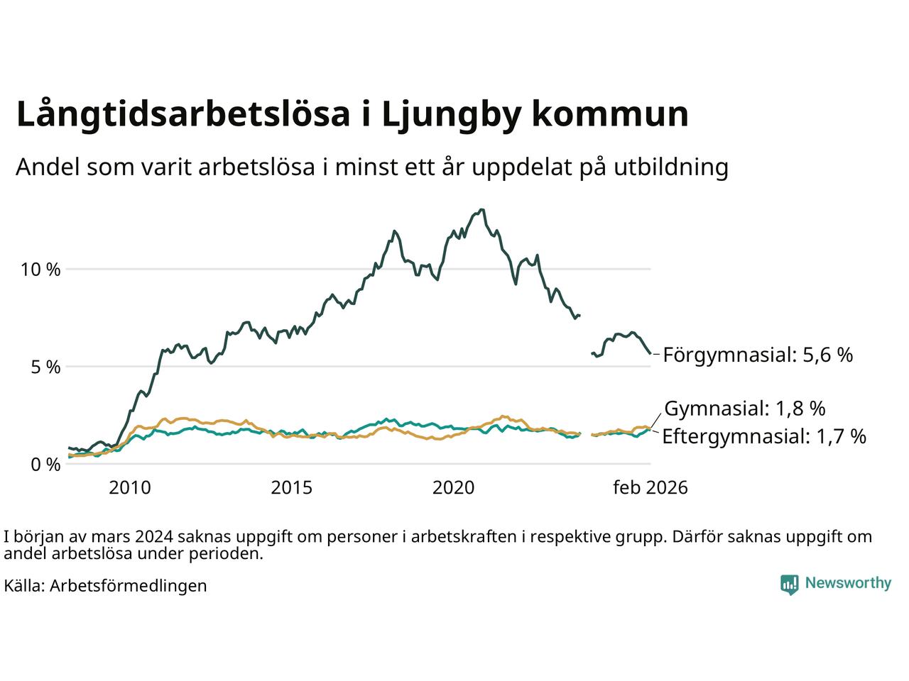 I februari hade 321 Ljungbybor varit arbetslösa i minst ett år, vilket är åtta färre än månaden innan. 321 personer motsvarar 2,3 procent av arbetskraften i kommunen – andelen långtidsarbetslösa är ungefär på samma nivå som för ett år sedan.