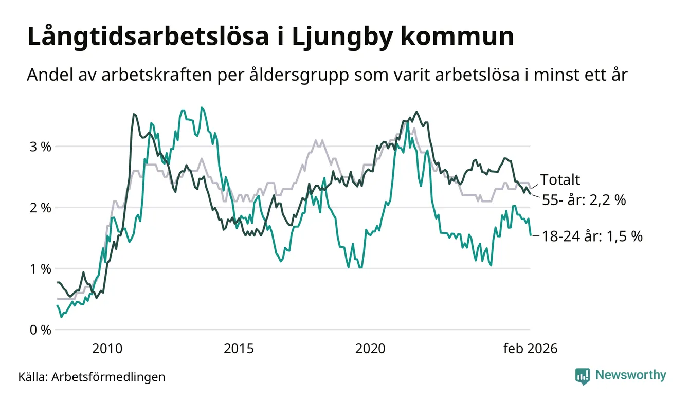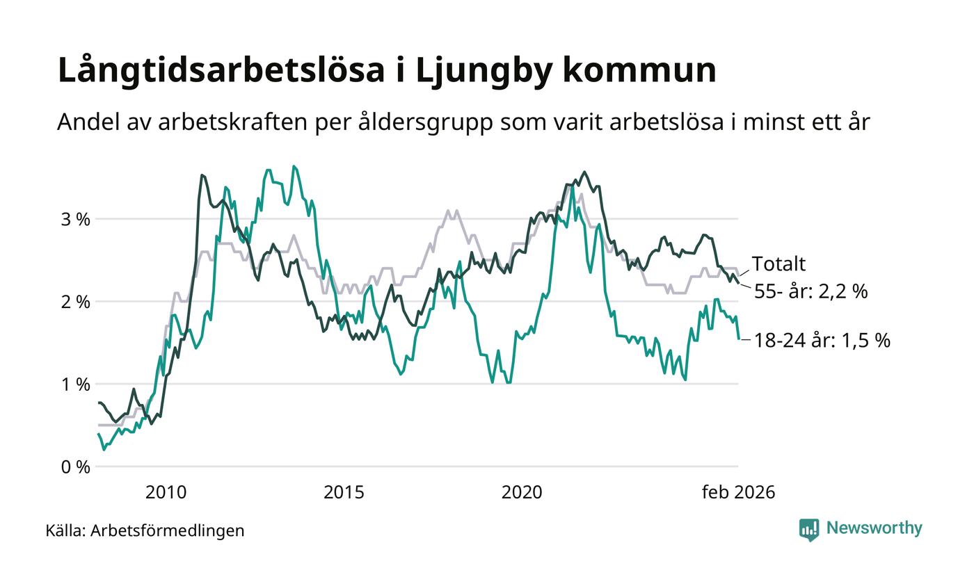 Av de 321 personerna som varit arbetslösa i mer än ett år i Ljungby kommun är 75 personer mellan 55 och 661 år och 22 är mellan 18 och 24 år. Som andel av arbetskraften innebär det att långtidsarbetslöheten är lägre i de båda grupperna än i arbetskraften totalt. I riket som helhet är andelen långtidsarbetslösa högre i den äldre gruppen.