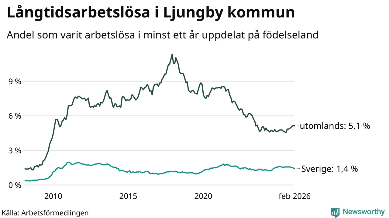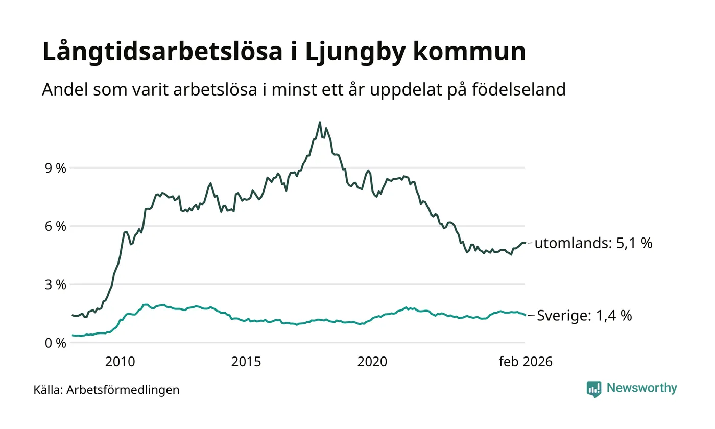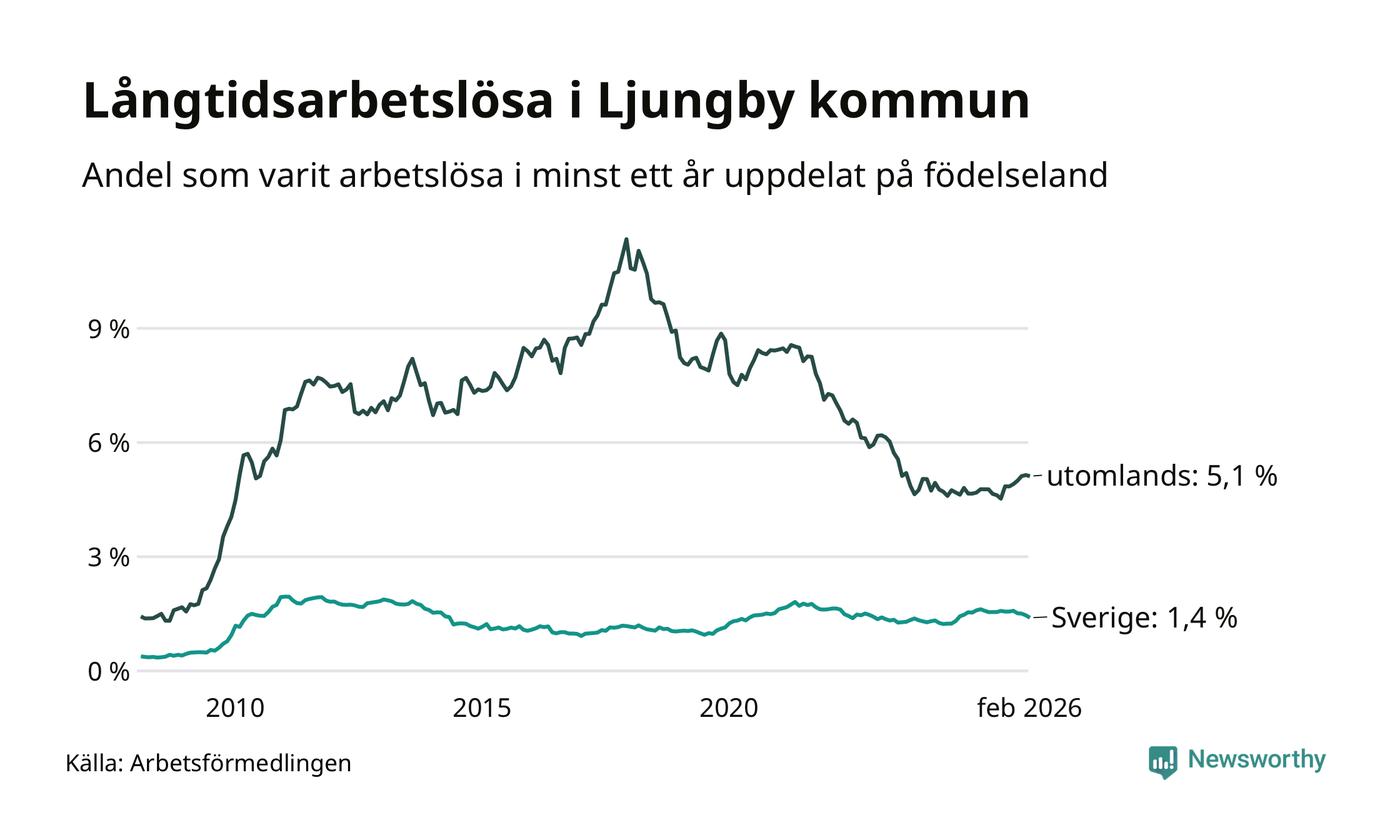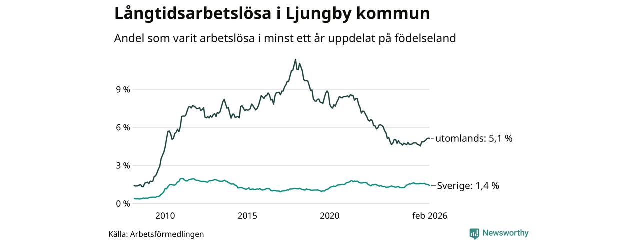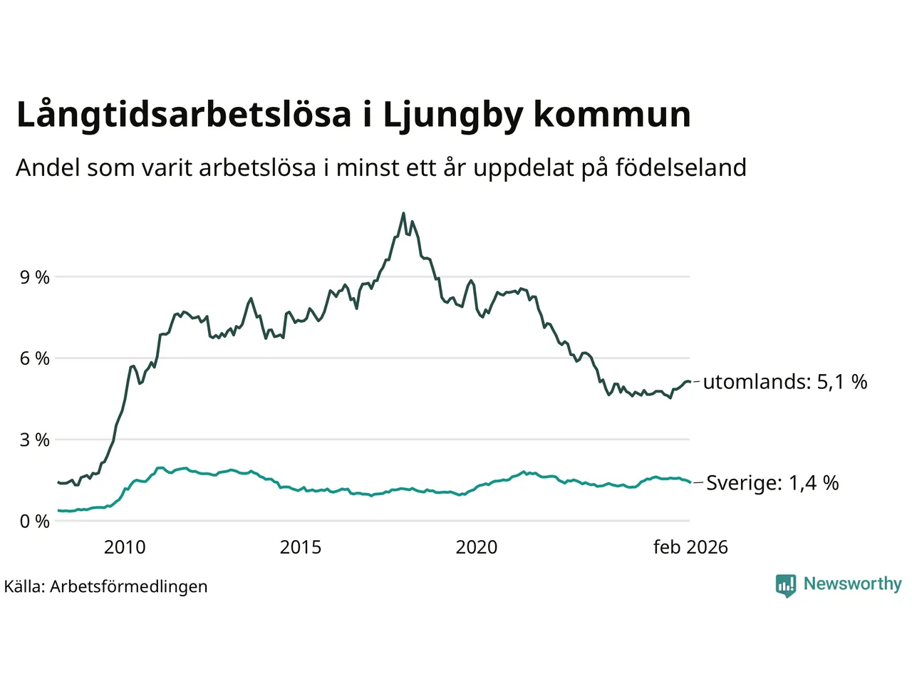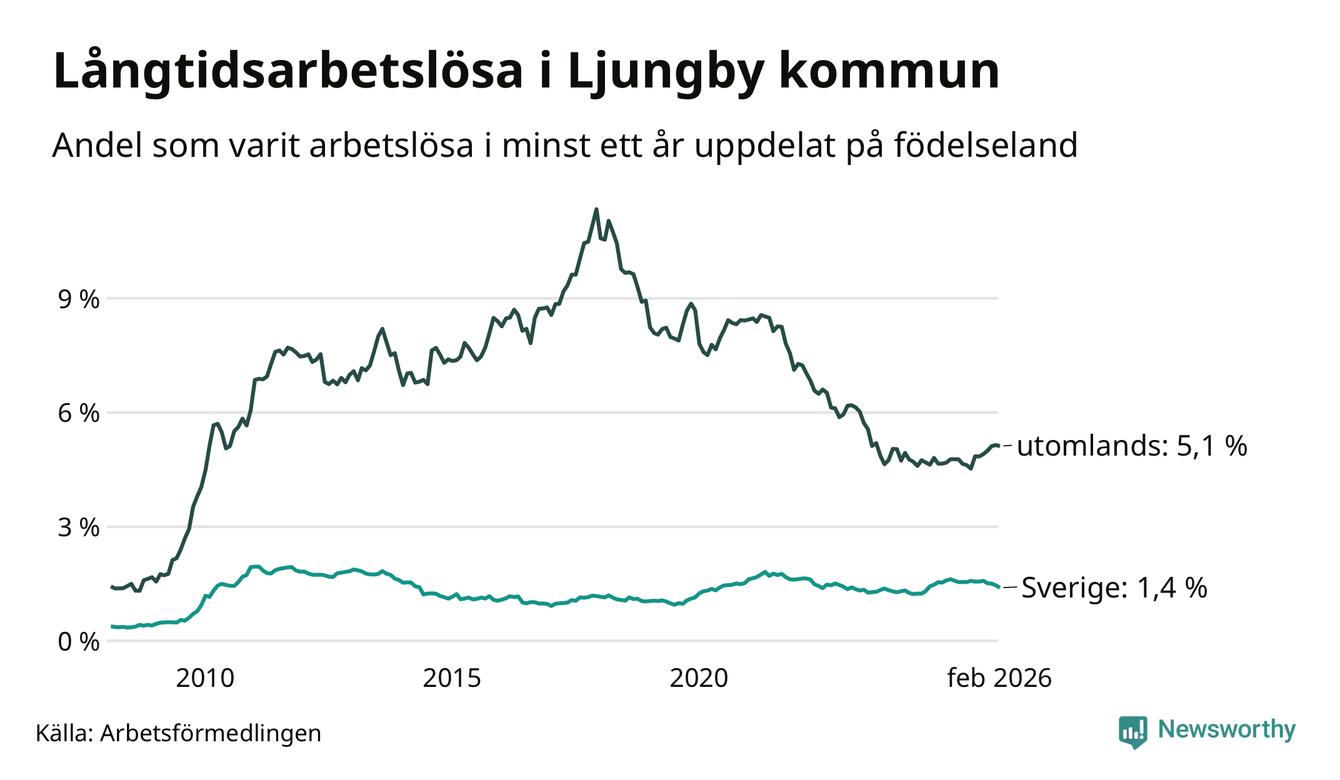 147 av de långtidsarbetslösa i Ljungby är födda i Sverige, medan 174 är födda utomlands. Det innebär att långtidsarbetslösheten bland Sverigefödda är 1,4 procent, medan den är fyra gånger så hög – 5,1 procent – bland födda utomlands. Även i riket som helhet är arbetslösheten högre bland utrikesfödda.