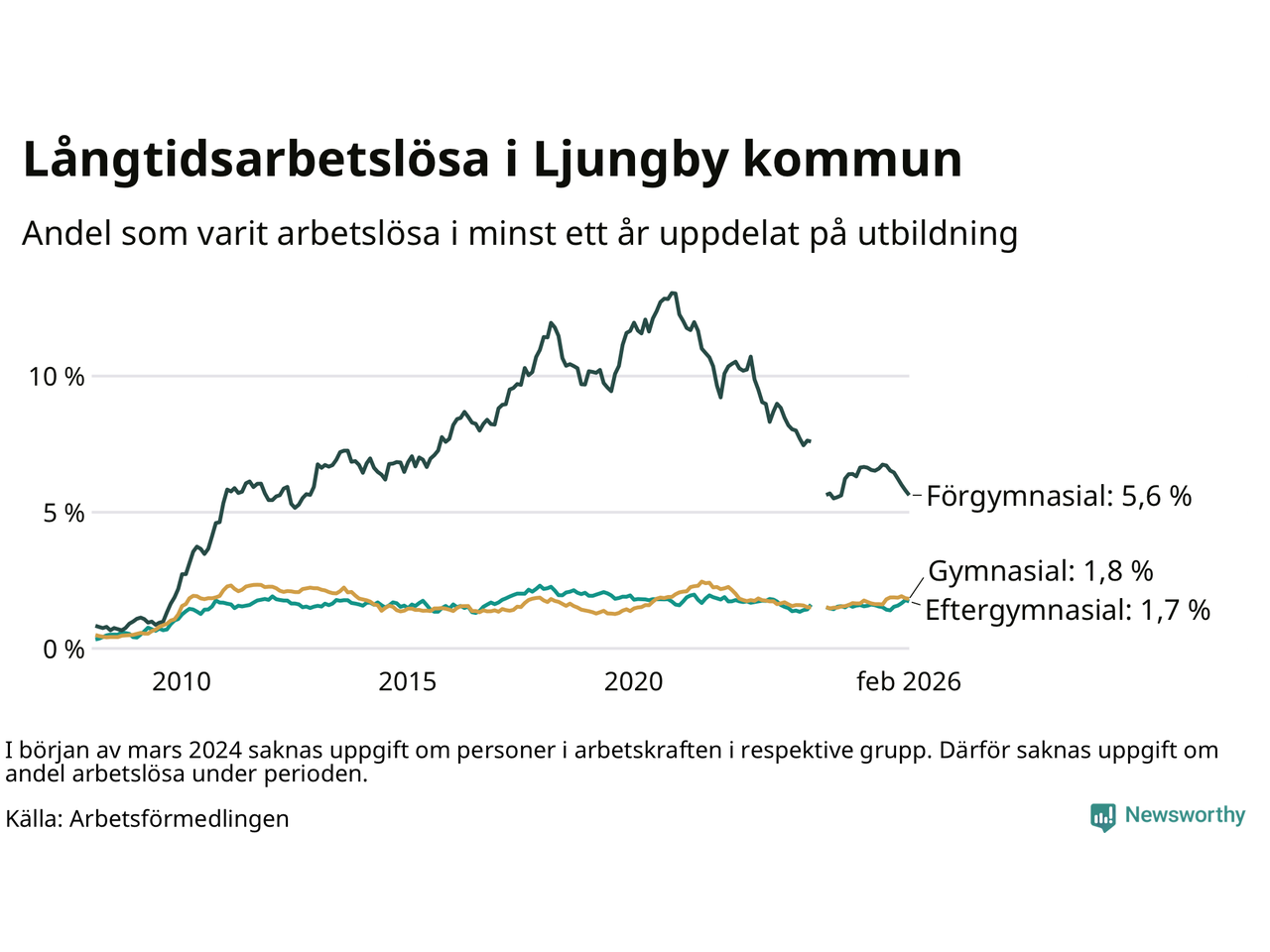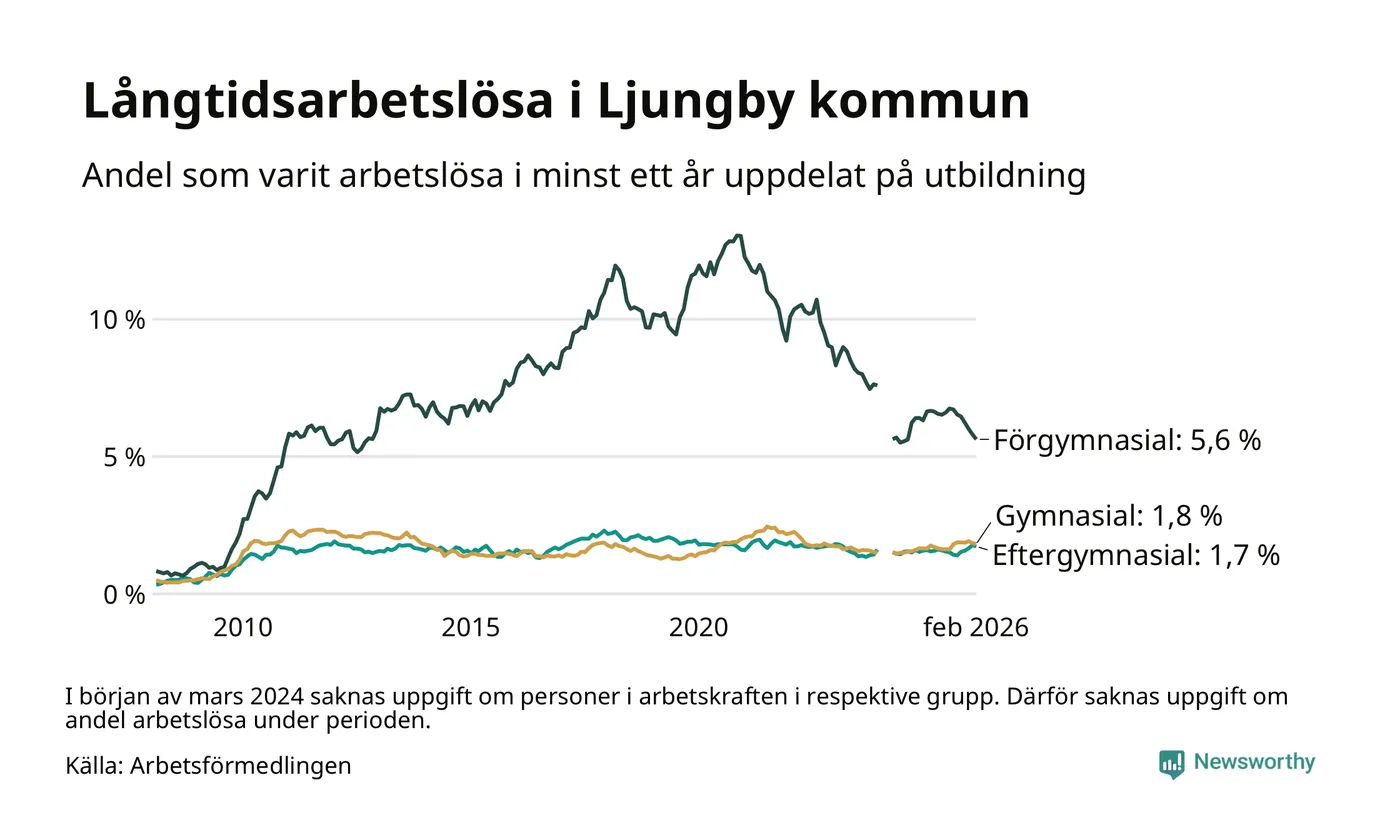 Graf: Andel arbetslösa i Ljungby som varit utan arbete i minst 12 månader