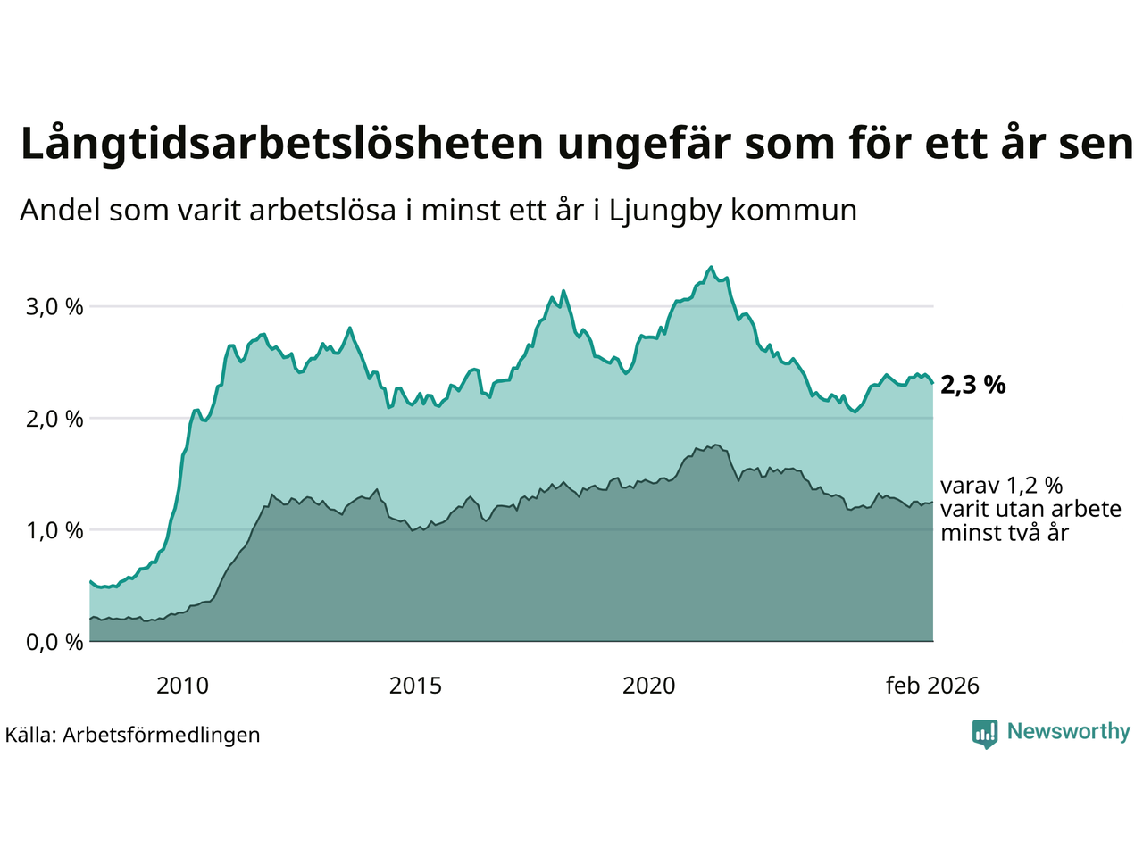 Andelen som varit utan arbete i minst ett år i Ljungby var ungefär lika stor i februari jämfört med samma månad för ett år sedan. Det visar Arbetsfömedlingens senaste månadsstatistik.