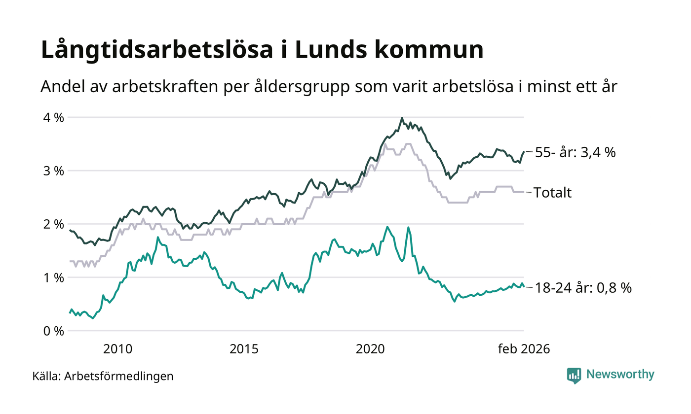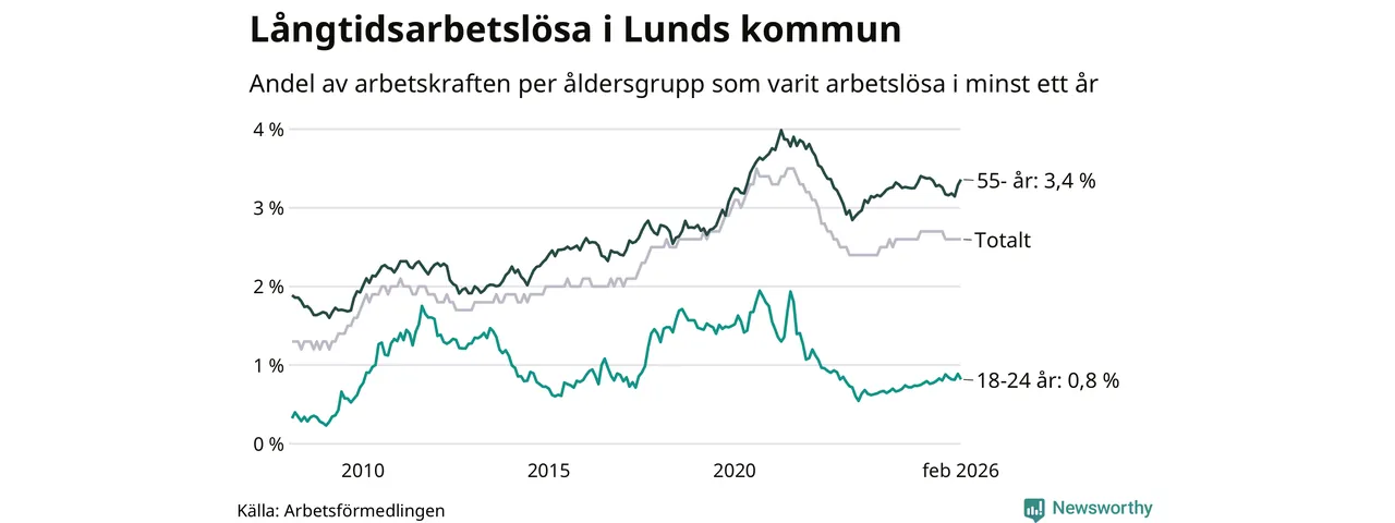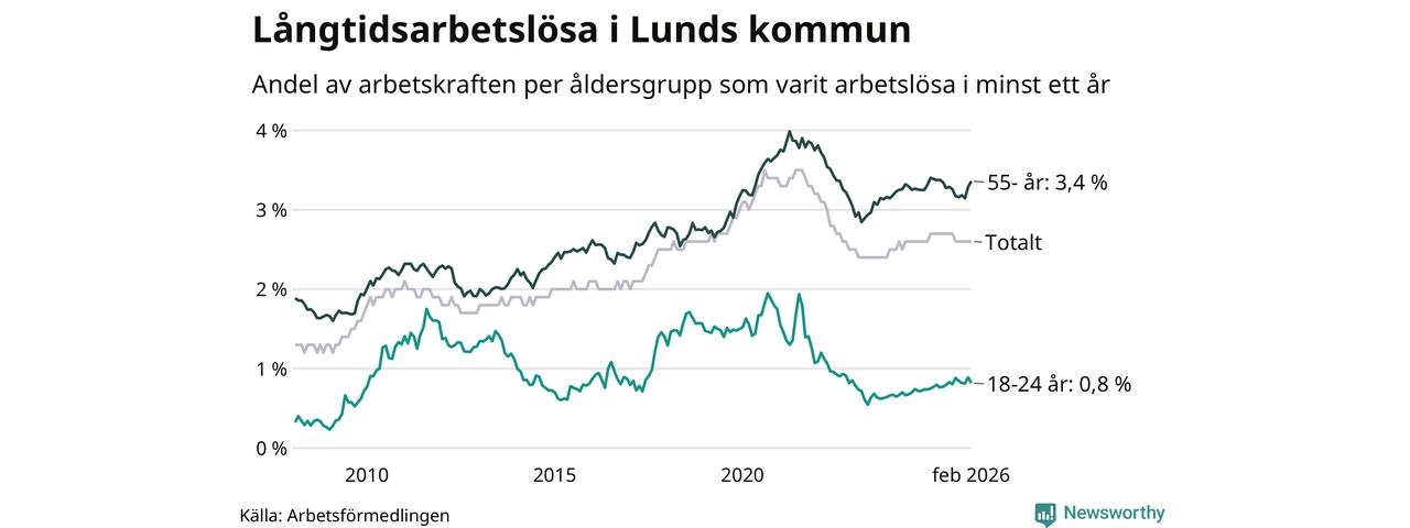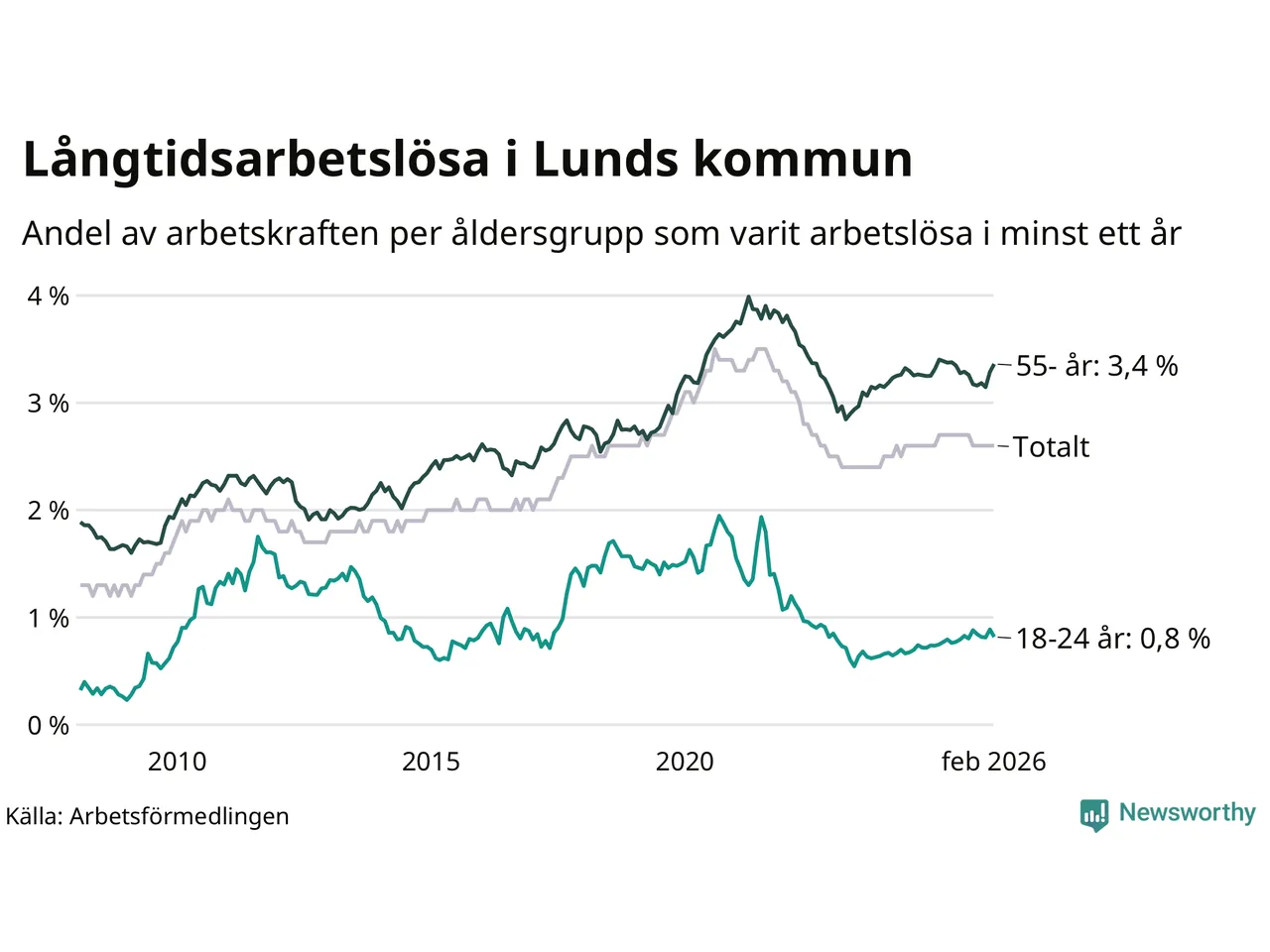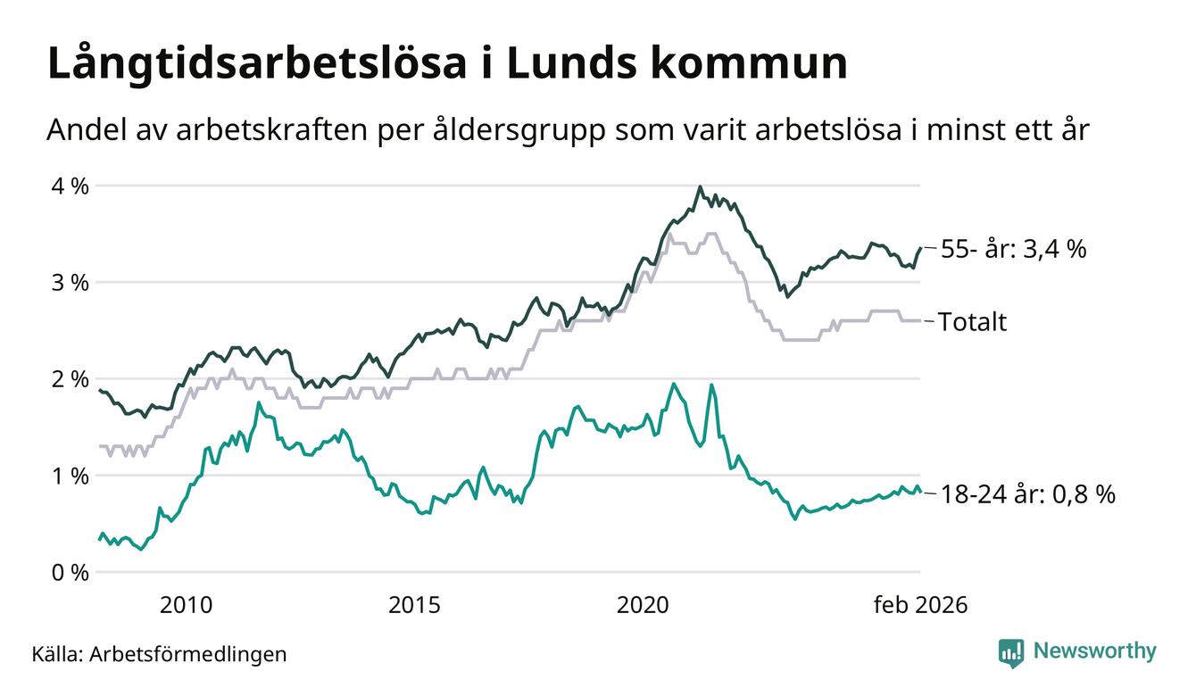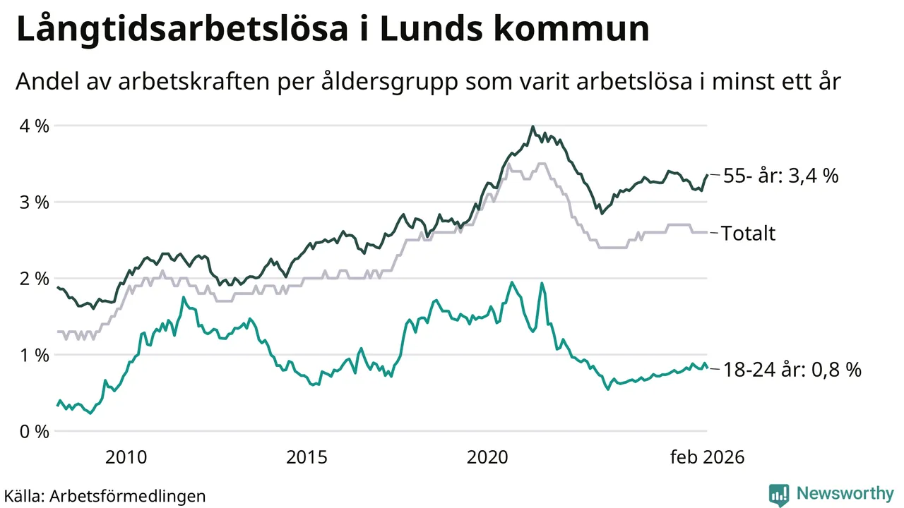 Av de 1 633 personerna som varit arbetslösa i mer än ett år i Lunds kommun är 395 personer mellan 55 och 661 år och 74 är mellan 18 och 24 år. För den äldre gruppen är andelen arbetslösa 3,4 procent medan den i den yngre gruppen är 0,8 procent. Även i riket som helhet är långtidsarbetslösheten högre i gruppen äldre.