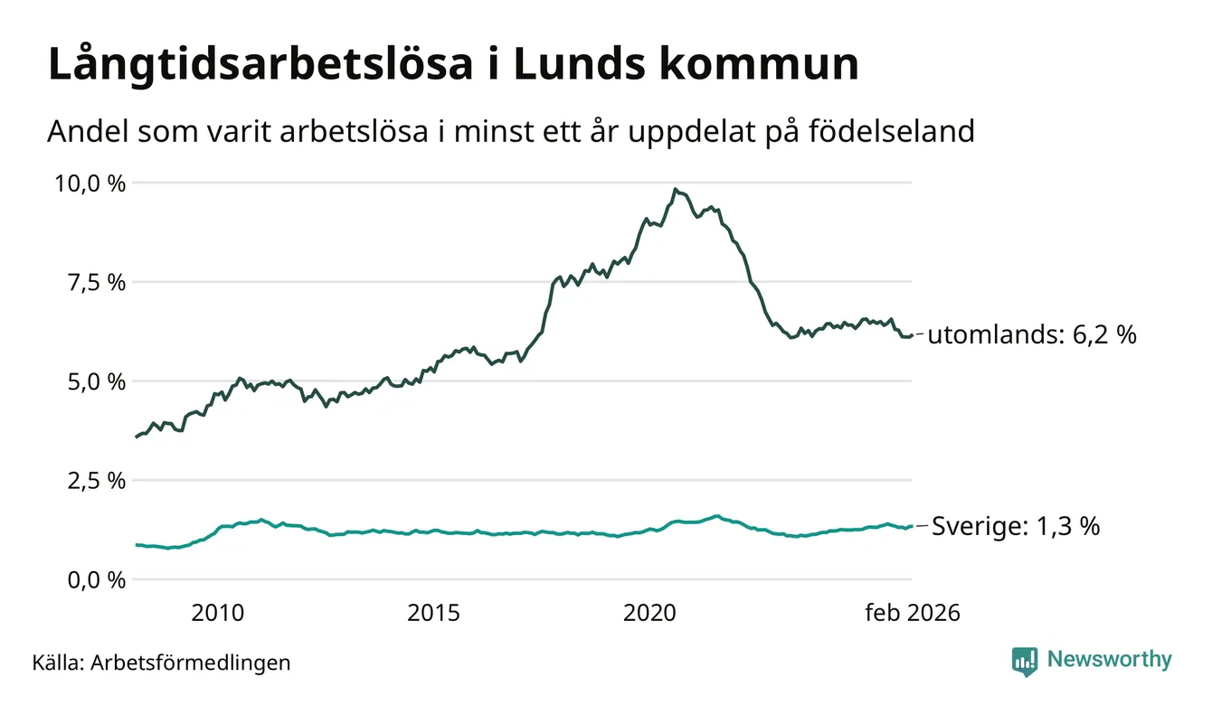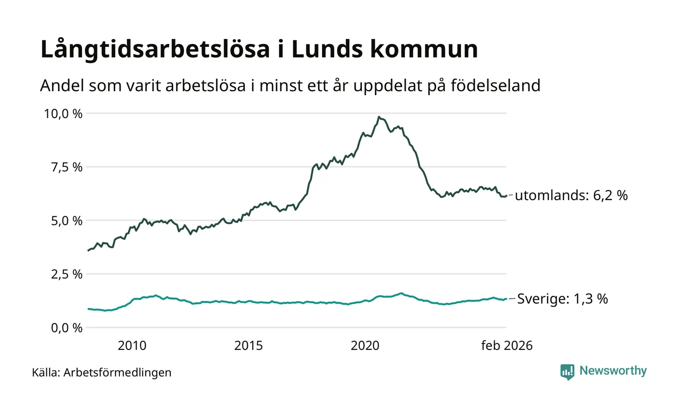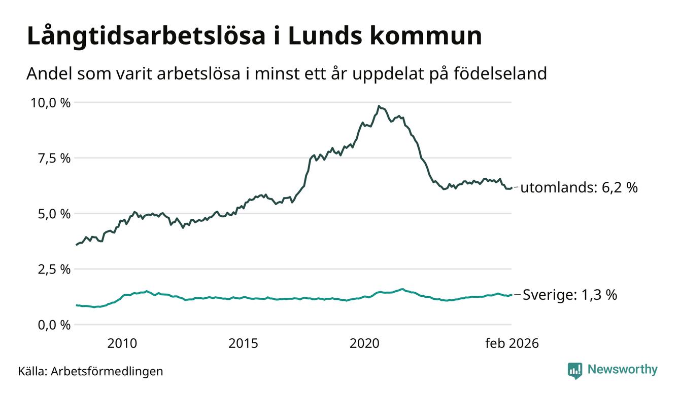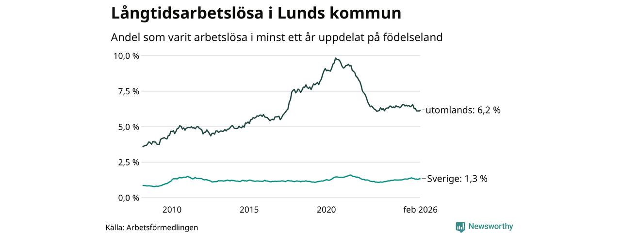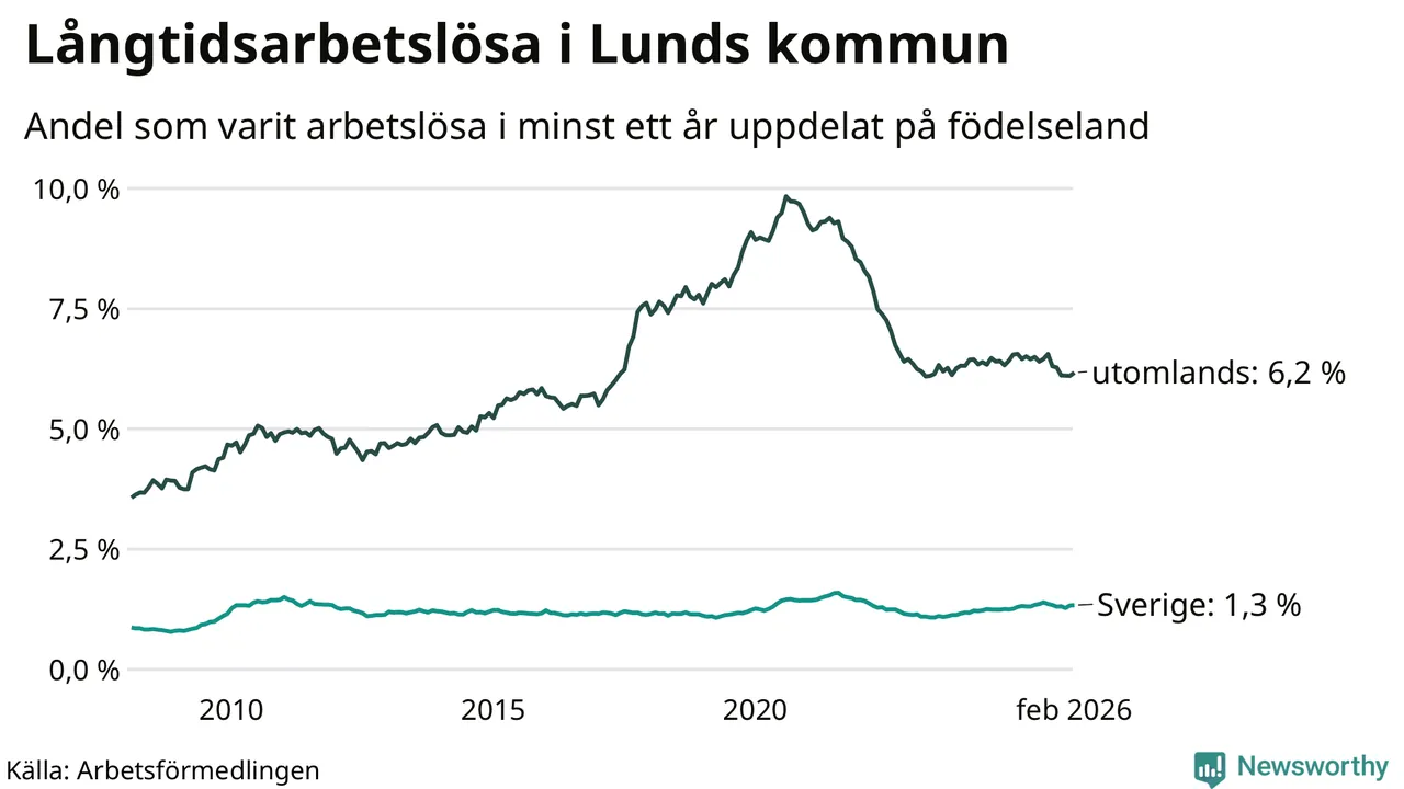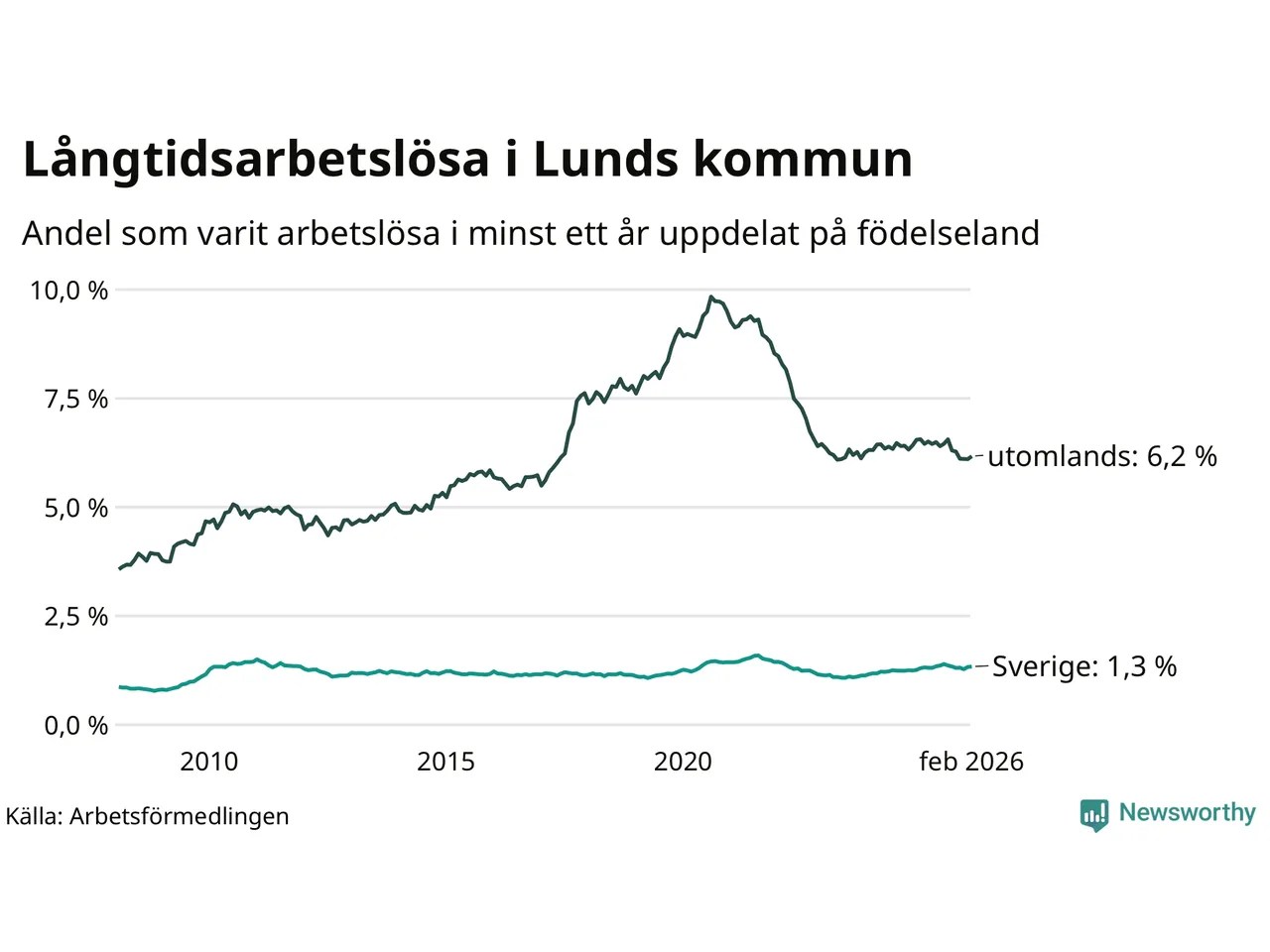 615 av de långtidsarbetslösa i Lund är födda i Sverige, medan 1 018 är födda utomlands. Det innebär att långtidsarbetslösheten bland Sverigefödda är 1,3 procent, medan den är fem gånger så hög – 6,2 procent – bland födda utomlands. Även i riket som helhet är arbetslösheten högre bland utrikesfödda.