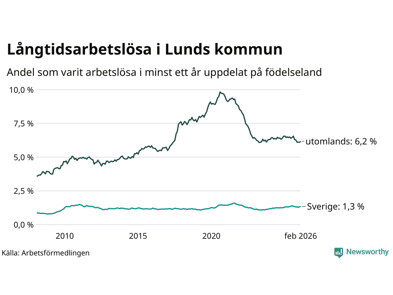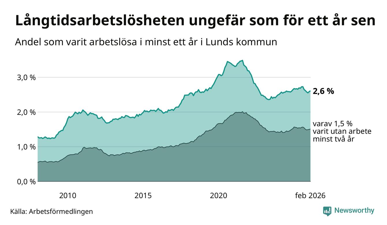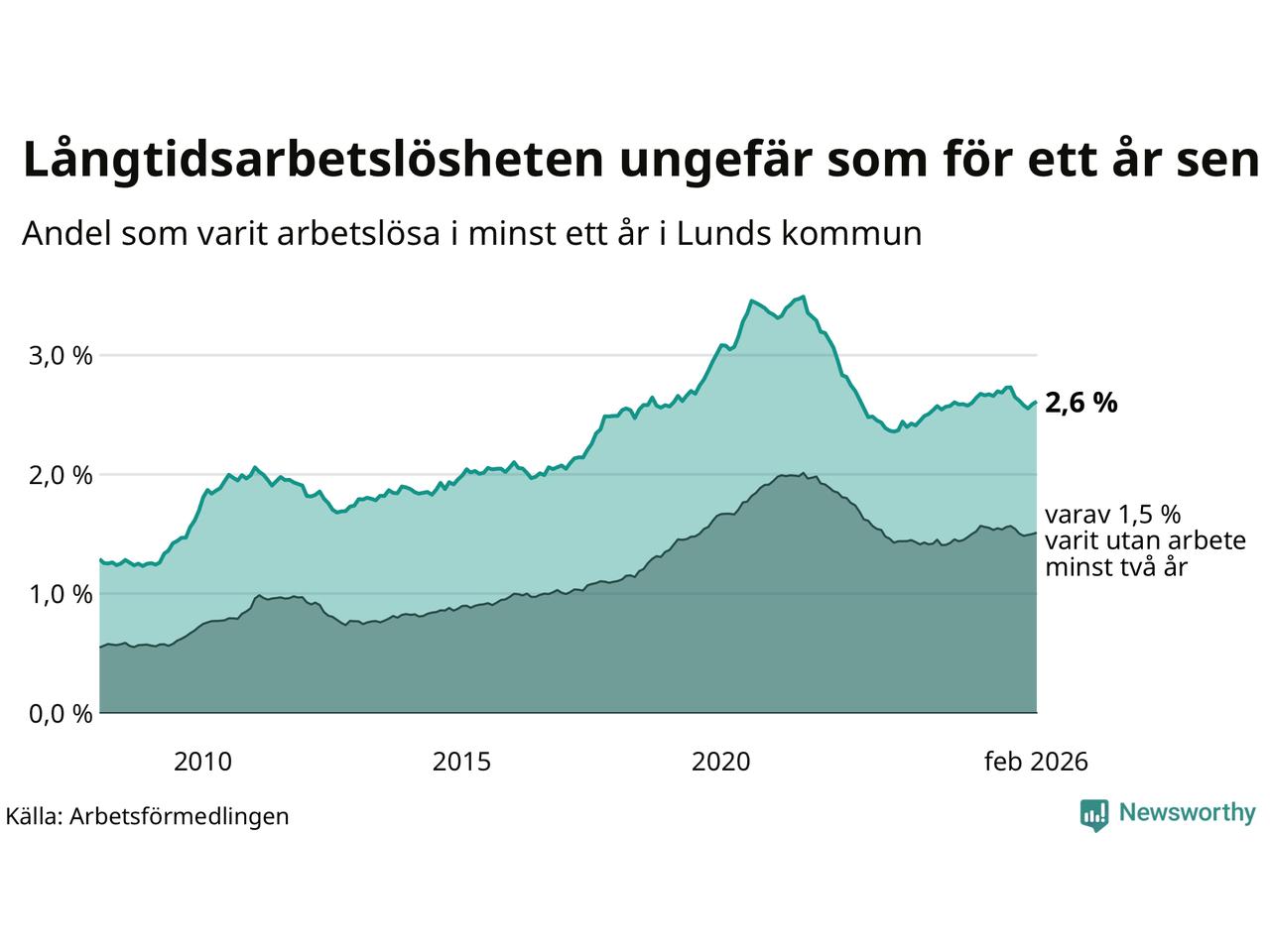 I februari hade 1 633 Lundabor varit arbetslösa i minst ett år, vilket är 16 fler än månaden innan. 1 633 personer motsvarar 2,6 procent av arbetskraften i kommunen – andelen långtidsarbetslösa är ungefär på samma nivå som för ett år sedan.