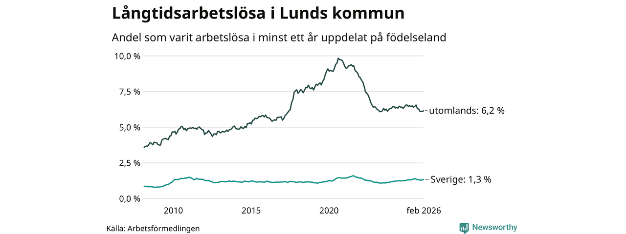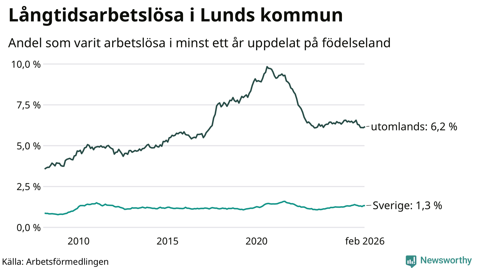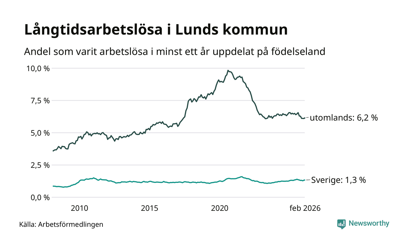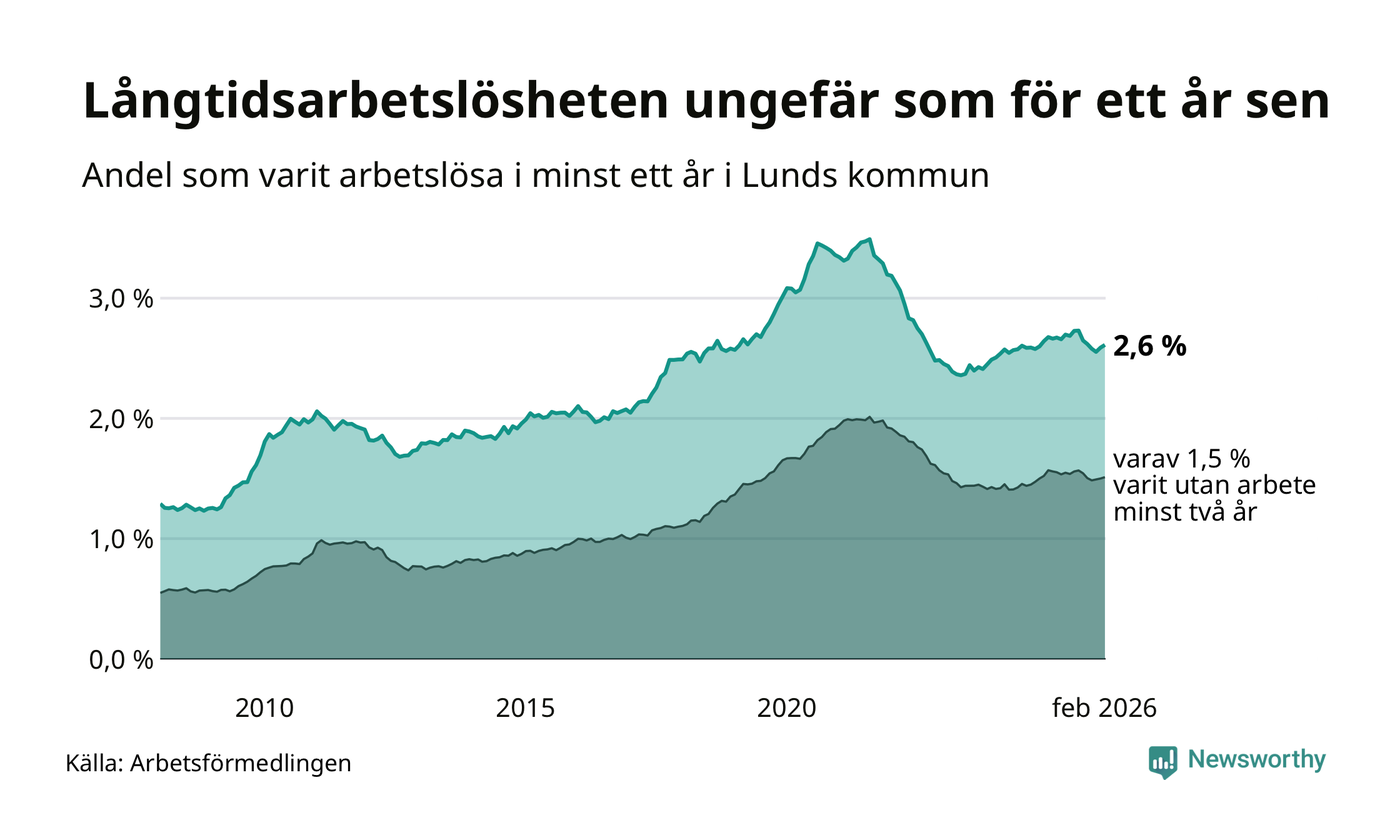 I februari hade 1 633 Lundabor varit arbetslösa i minst ett år, vilket är 16 fler än månaden innan. 1 633 personer motsvarar 2,6 procent av arbetskraften i kommunen – andelen långtidsarbetslösa är ungefär på samma nivå som för ett år sedan.