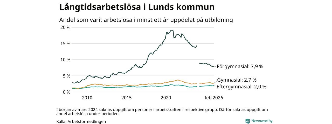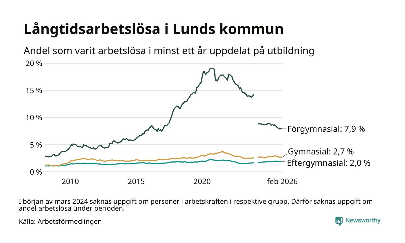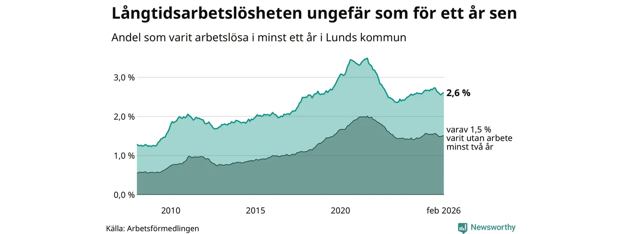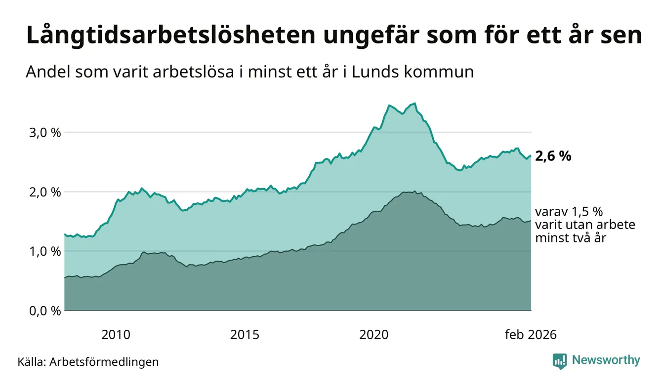 Andelen som varit utan arbete i minst ett år i Lund var ungefär lika stor i februari jämfört med samma månad för ett år sedan. Det visar Arbetsfömedlingens senaste månadsstatistik.