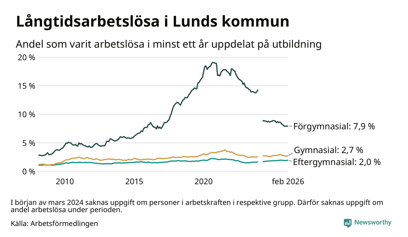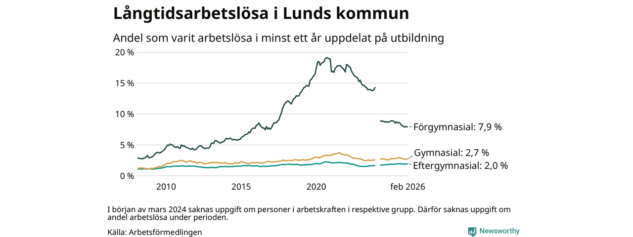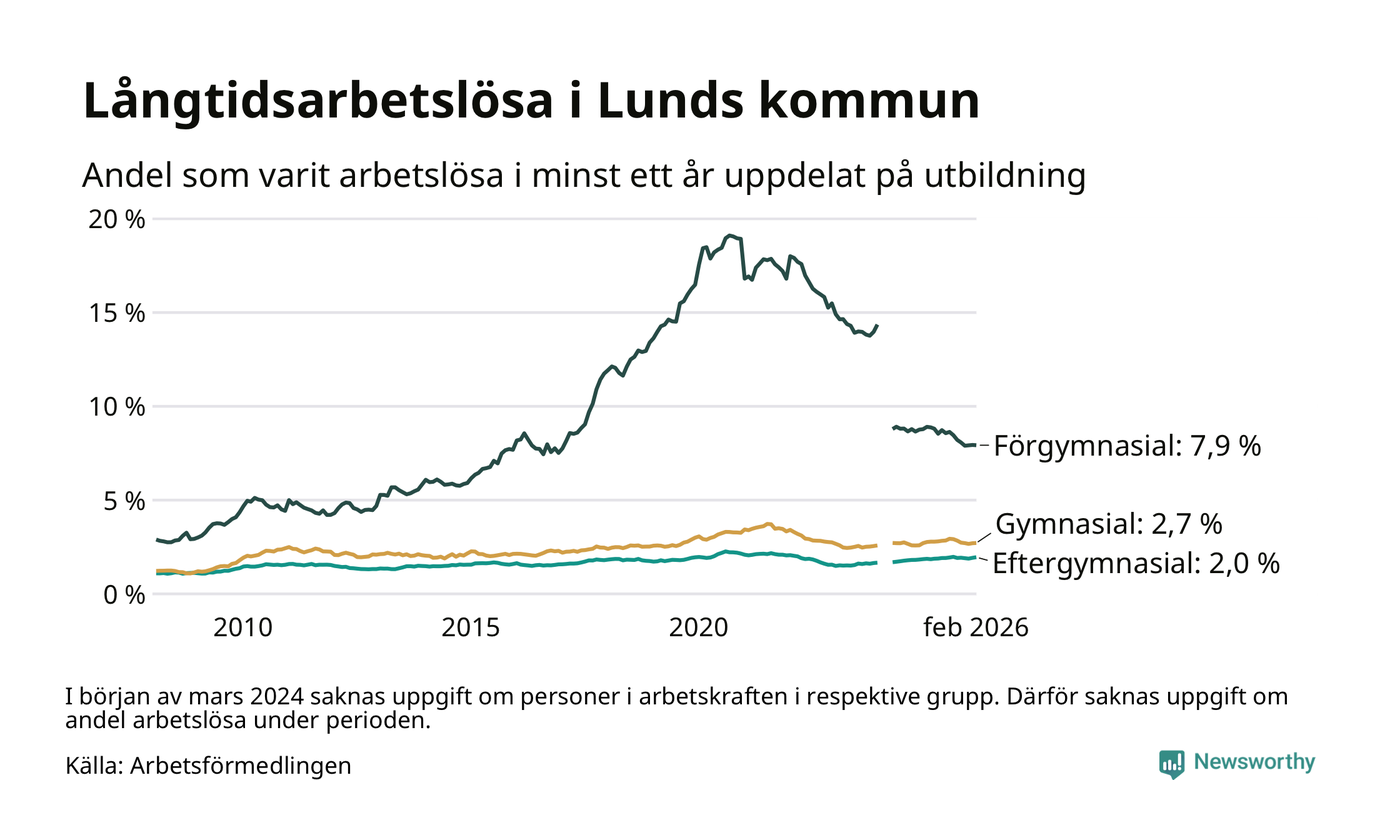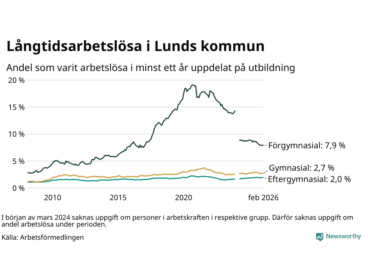 Andelen som varit utan arbete i minst ett år i Lund var ungefär lika stor i februari jämfört med samma månad för ett år sedan. Det visar Arbetsfömedlingens senaste månadsstatistik.