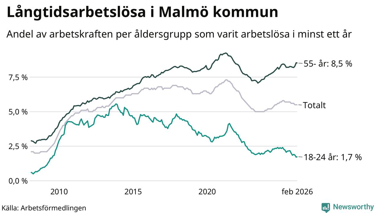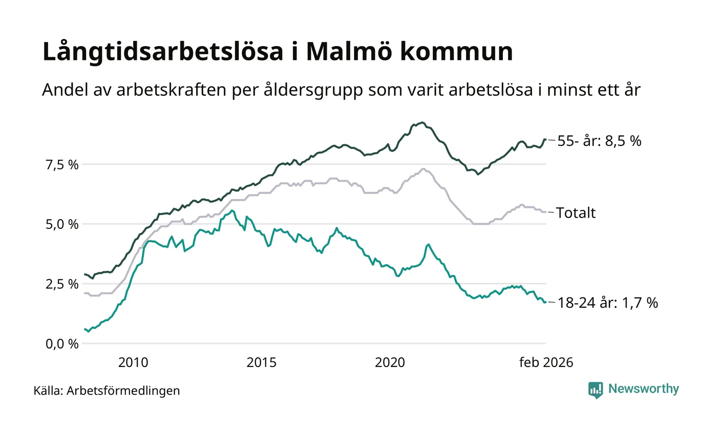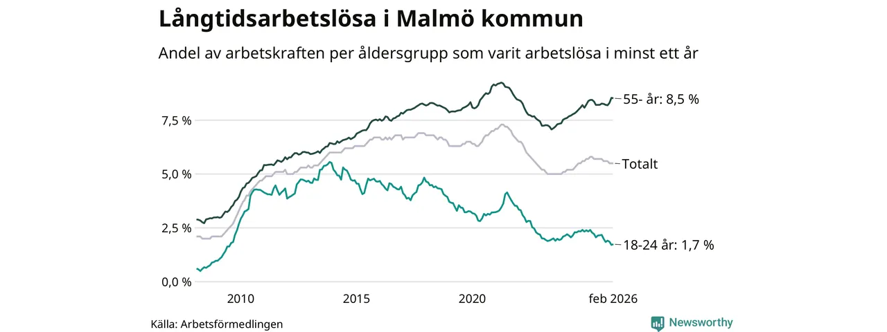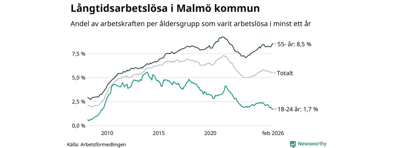 Av de 10 577 personerna som varit arbetslösa i mer än ett år i Malmö kommun är 2 673 personer mellan 55 och 661 år och 306 är mellan 18 och 24 år. För den äldre gruppen är andelen arbetslösa 8,5 procent medan den i den yngre gruppen är 1,7 procent. Även i riket som helhet är långtidsarbetslösheten högre i gruppen äldre.