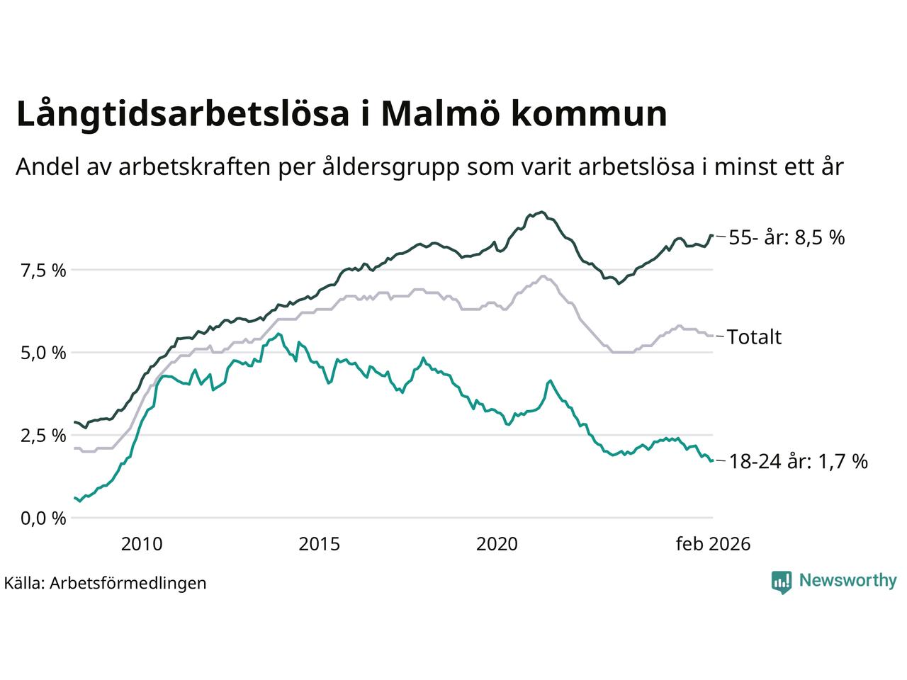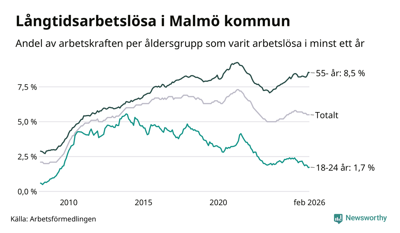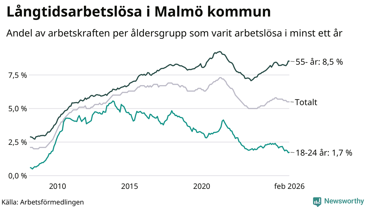 Av de 10 577 personerna som varit arbetslösa i mer än ett år i Malmö kommun är 2 673 personer mellan 55 och 661 år och 306 är mellan 18 och 24 år. För den äldre gruppen är andelen arbetslösa 8,5 procent medan den i den yngre gruppen är 1,7 procent. Även i riket som helhet är långtidsarbetslösheten högre i gruppen äldre.
