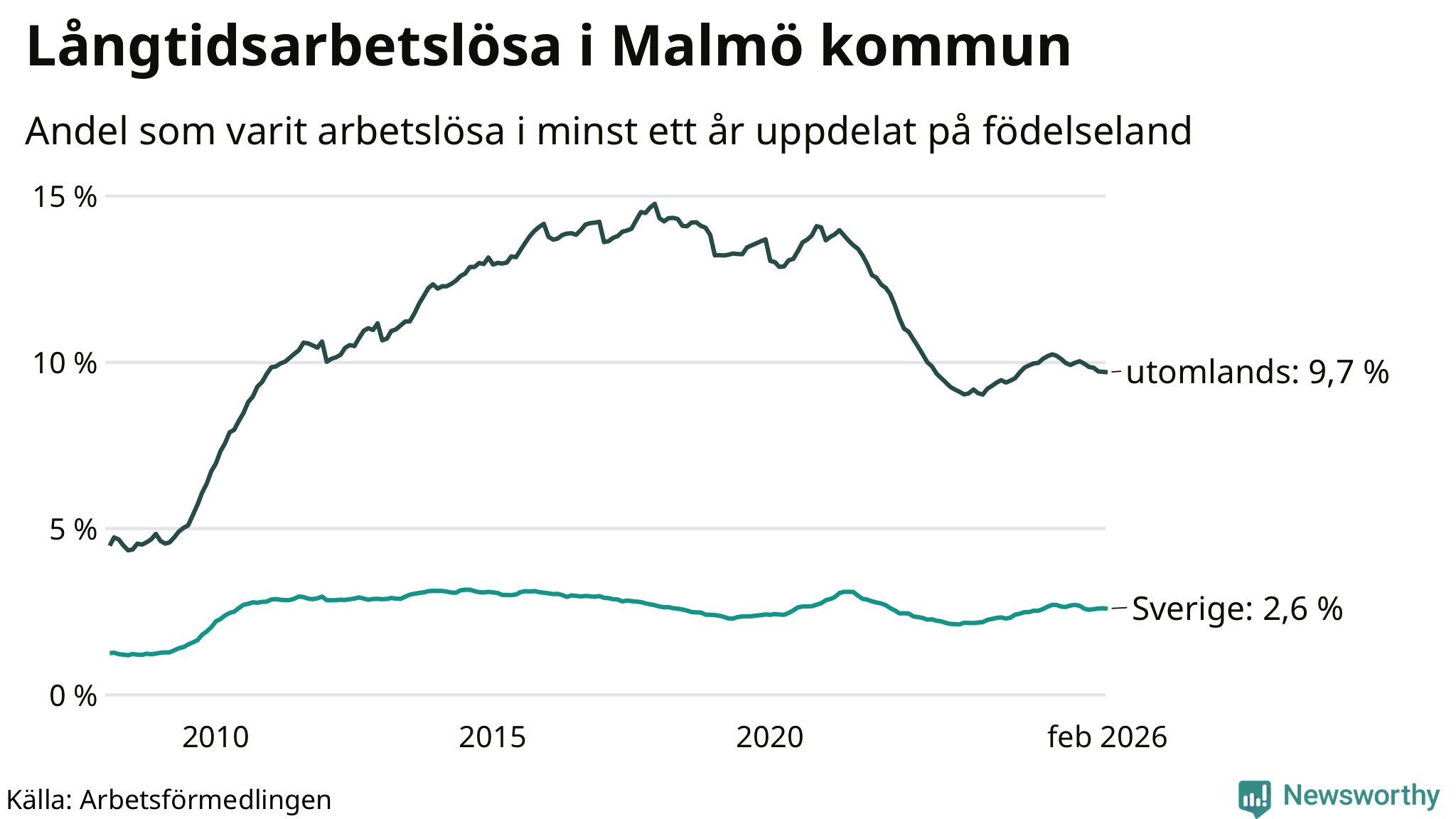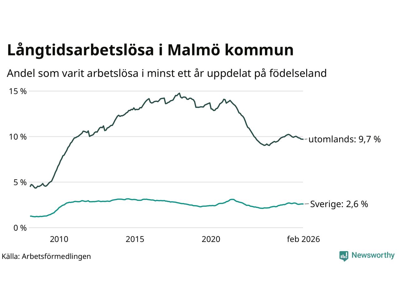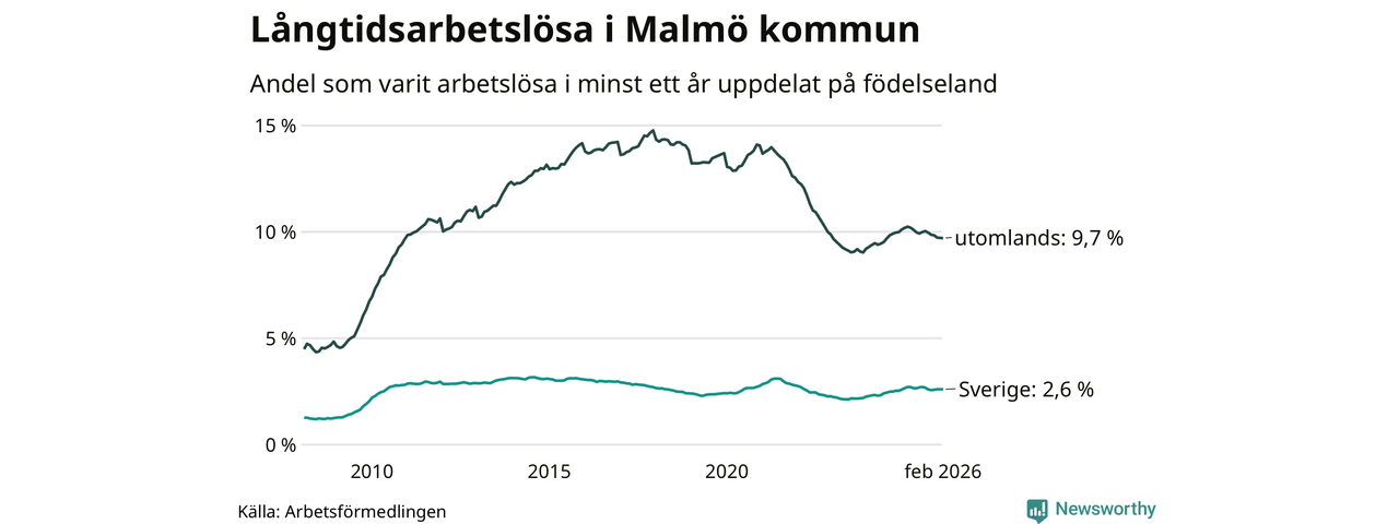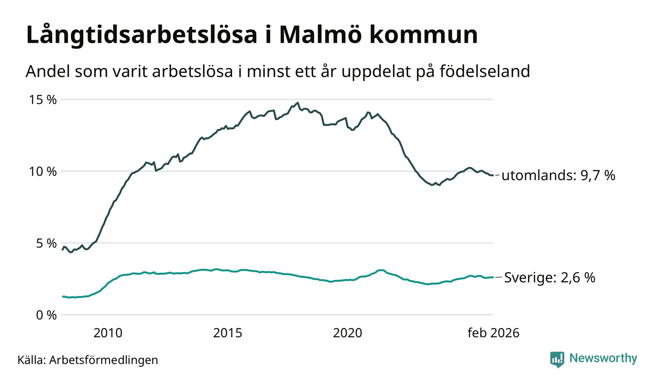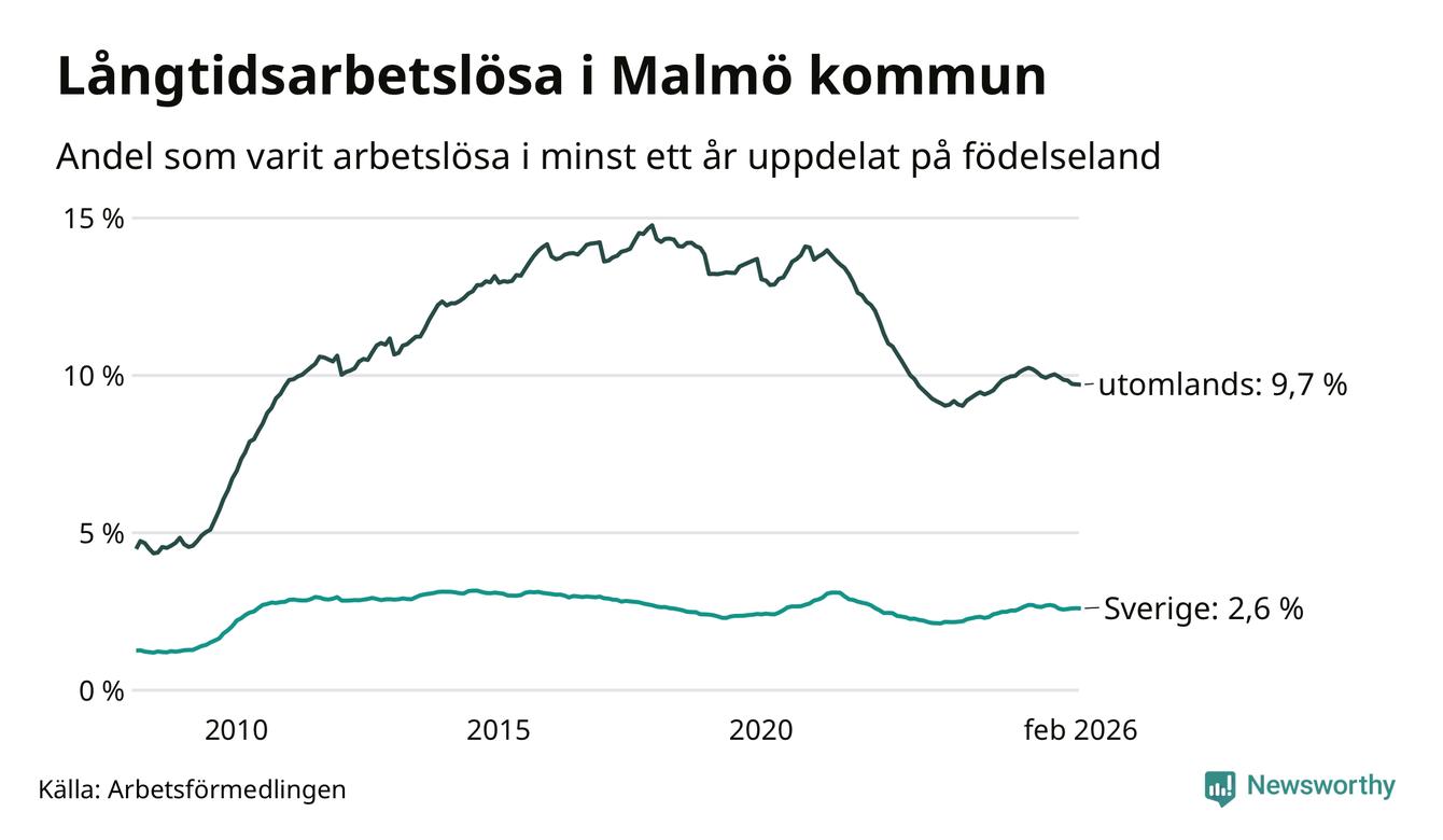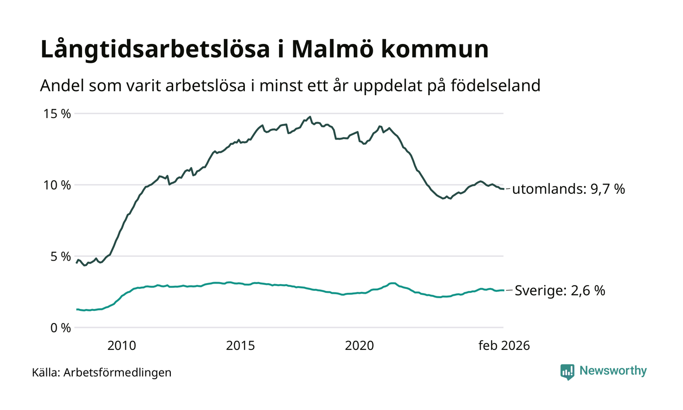 2 916 av de långtidsarbetslösa i Malmö är födda i Sverige, medan 7 661 är födda utomlands. Det innebär att långtidsarbetslösheten bland Sverigefödda är 2,6 procent, medan den är fyra gånger så hög – 9,7 procent – bland födda utomlands. Även i riket som helhet är arbetslösheten högre bland utrikesfödda.