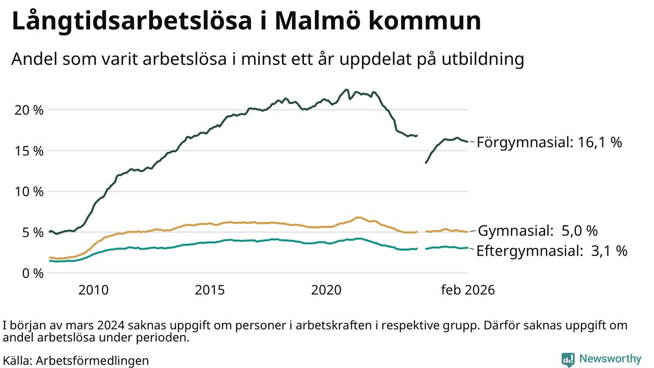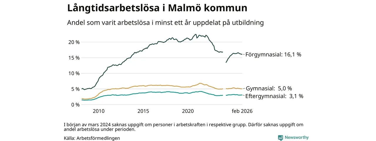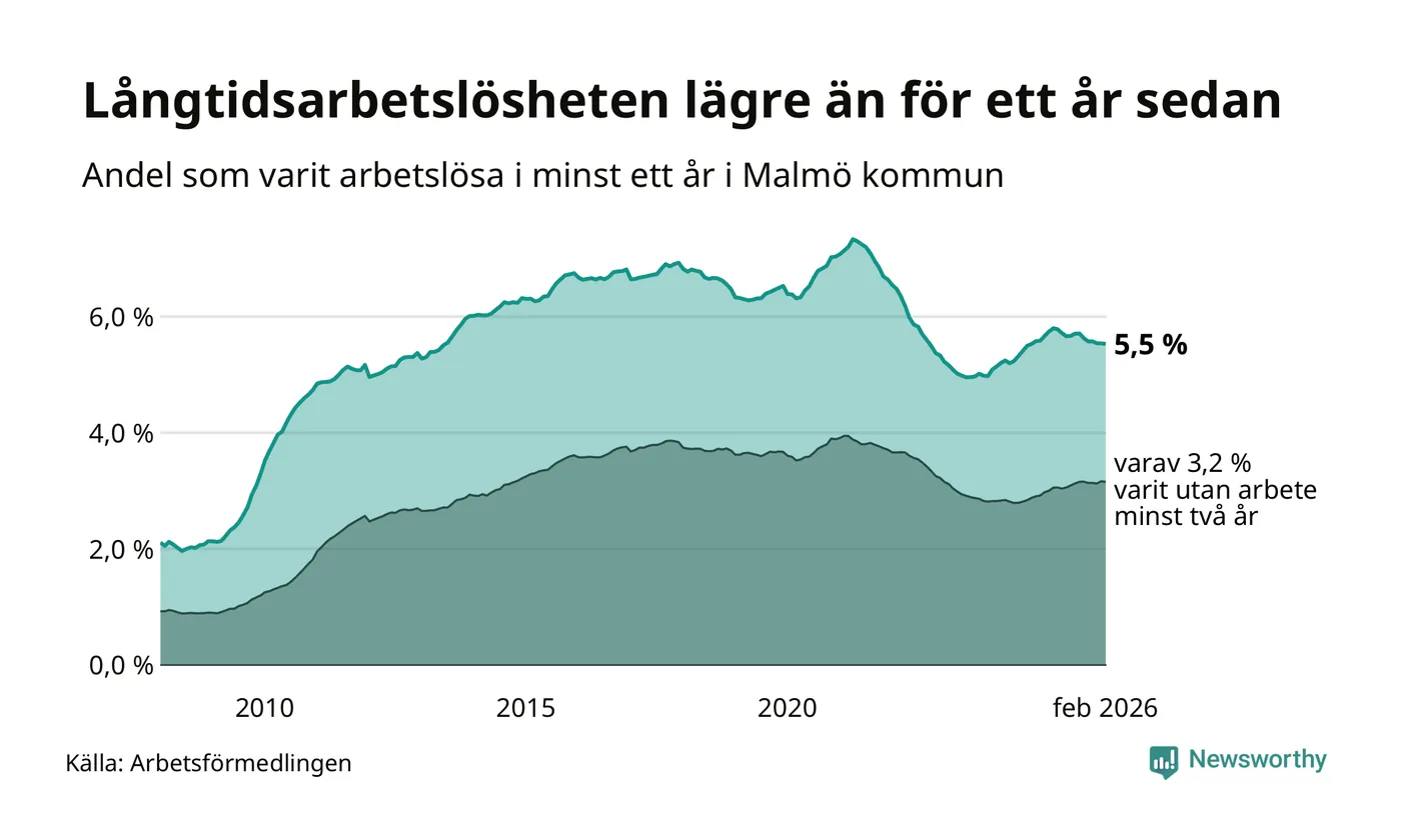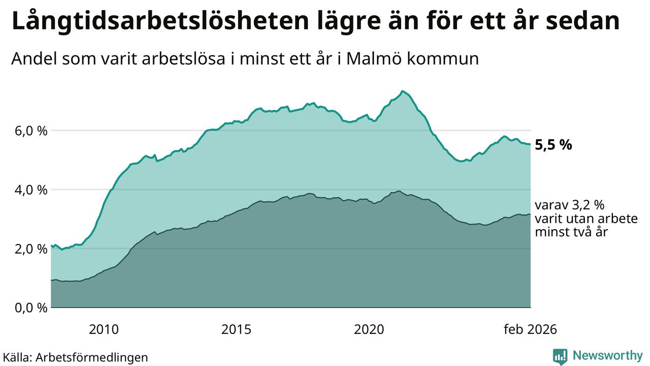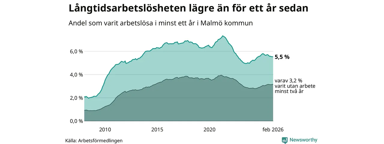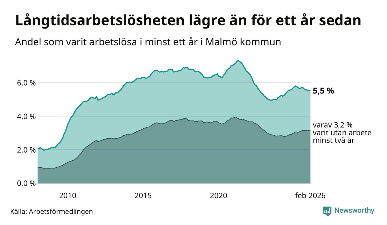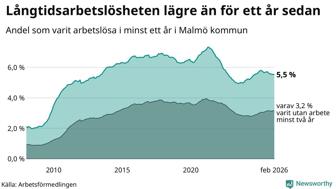 I februari hade 10 577 Malmöbor varit arbetslösa i minst ett år, vilket är sju färre än månaden innan. 10 577 personer motsvarar 5,5 procent av arbetskraften i kommunen – andelen långtidsarbetslösa är 0,3 procentenheter lägre än samma månad för ett år sedan. Malmö kommun hade näst högst andel långtidsarbetslösa i landet i februari.
