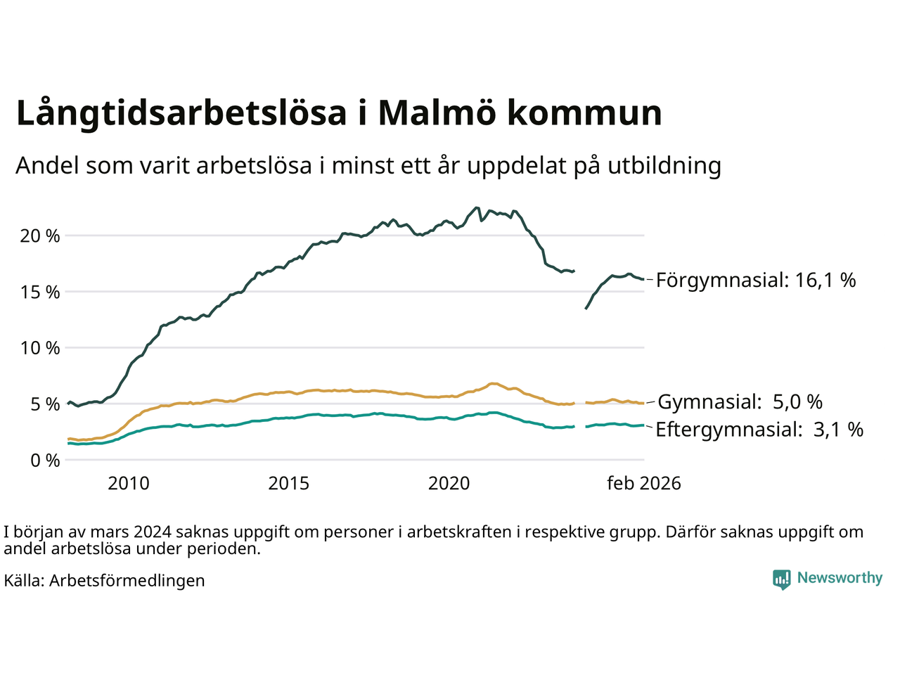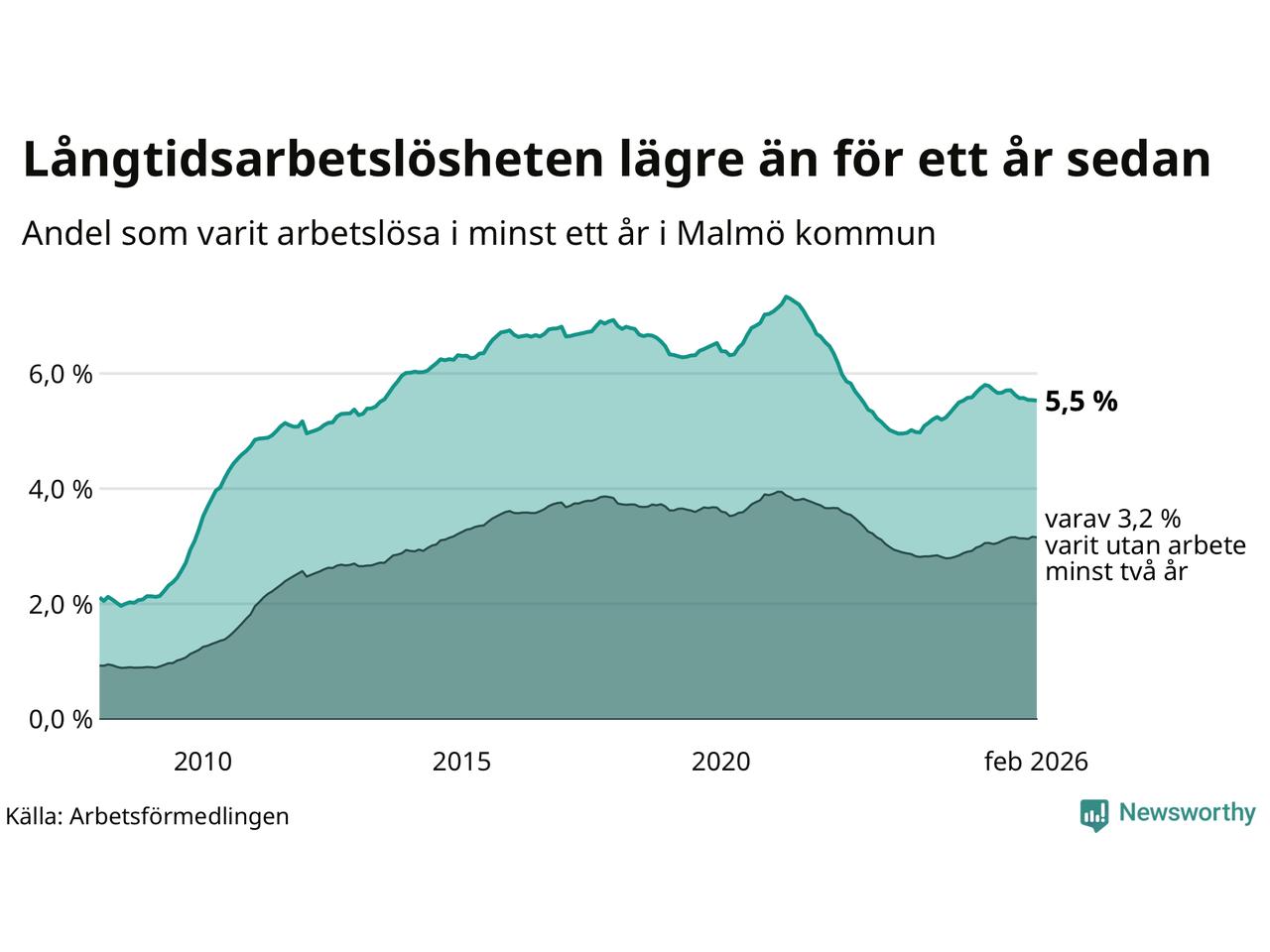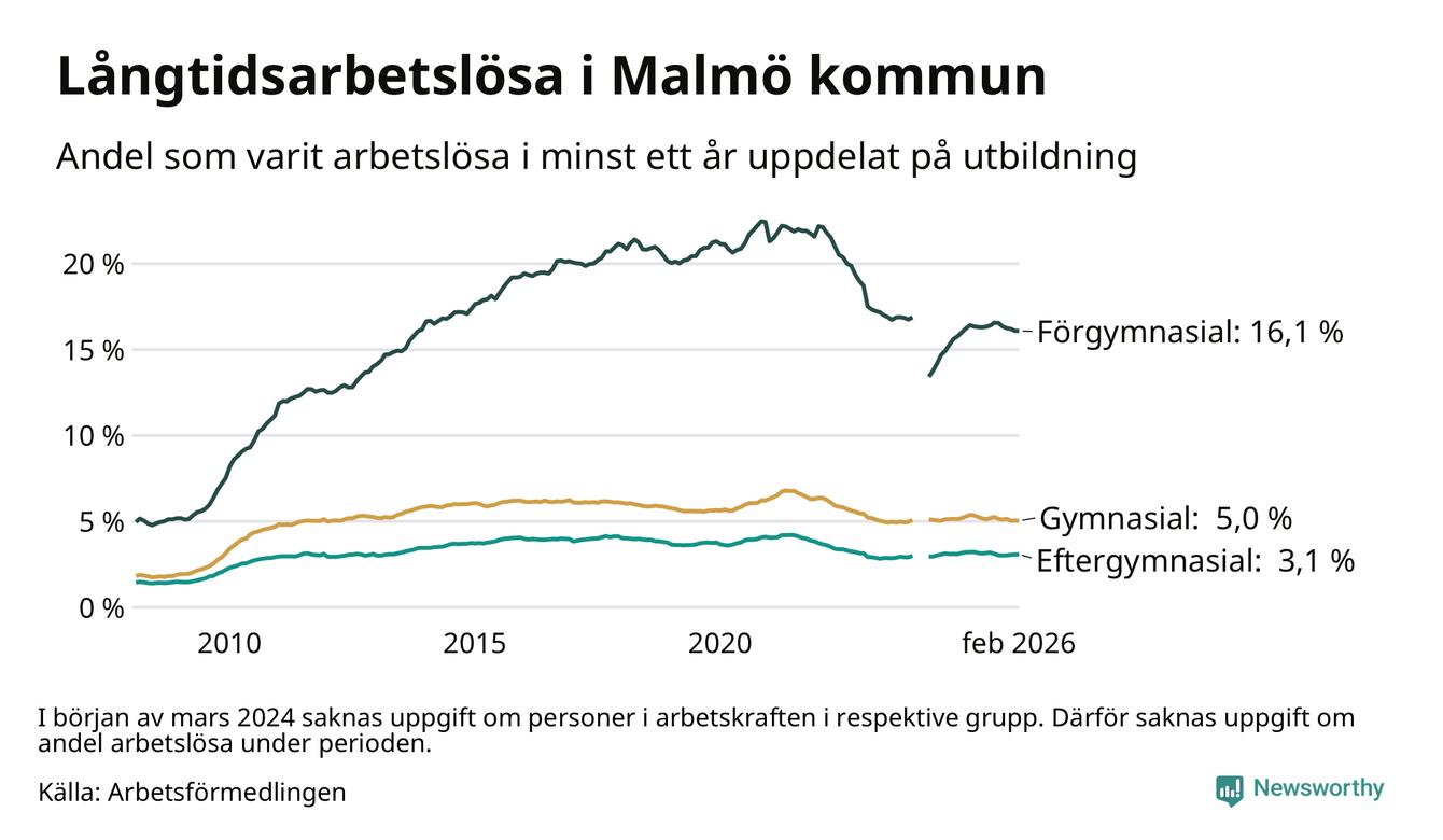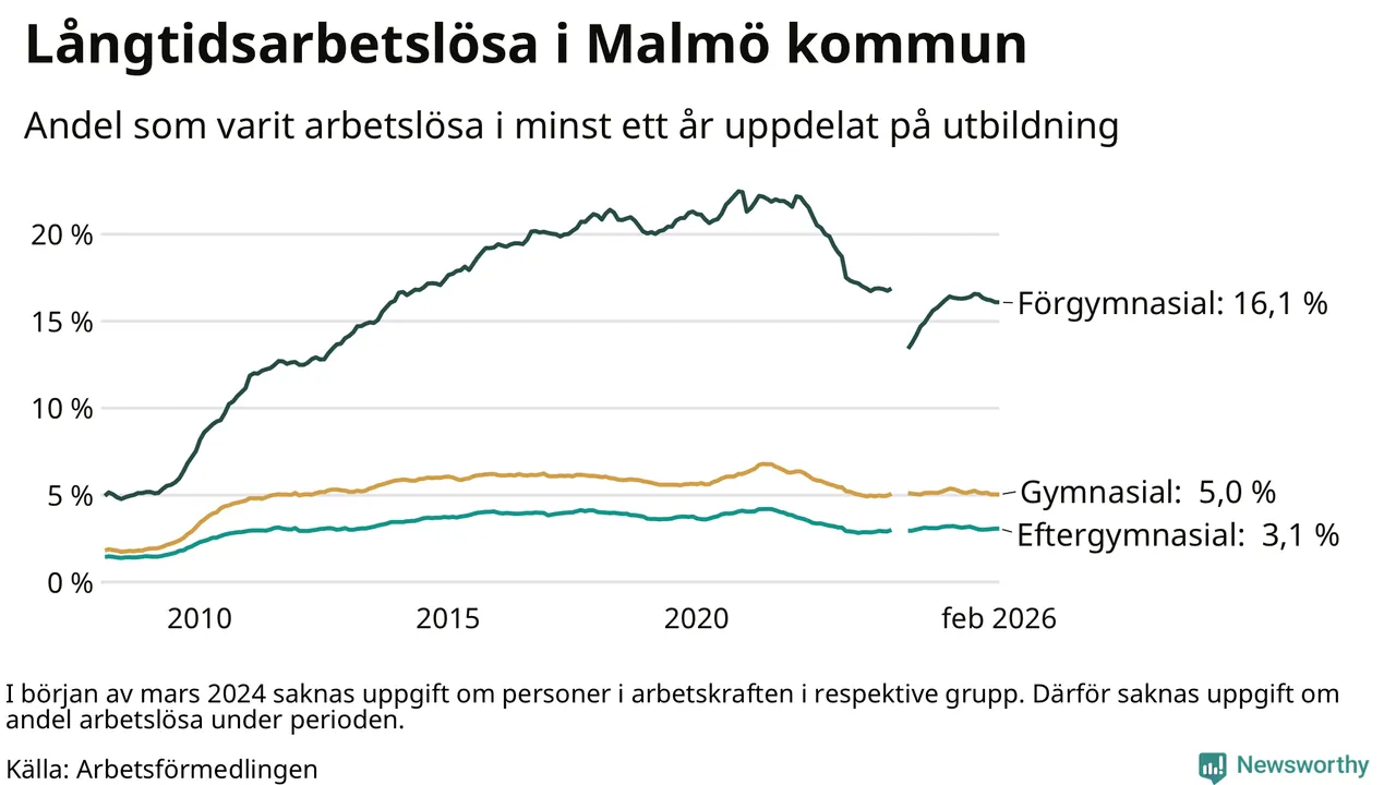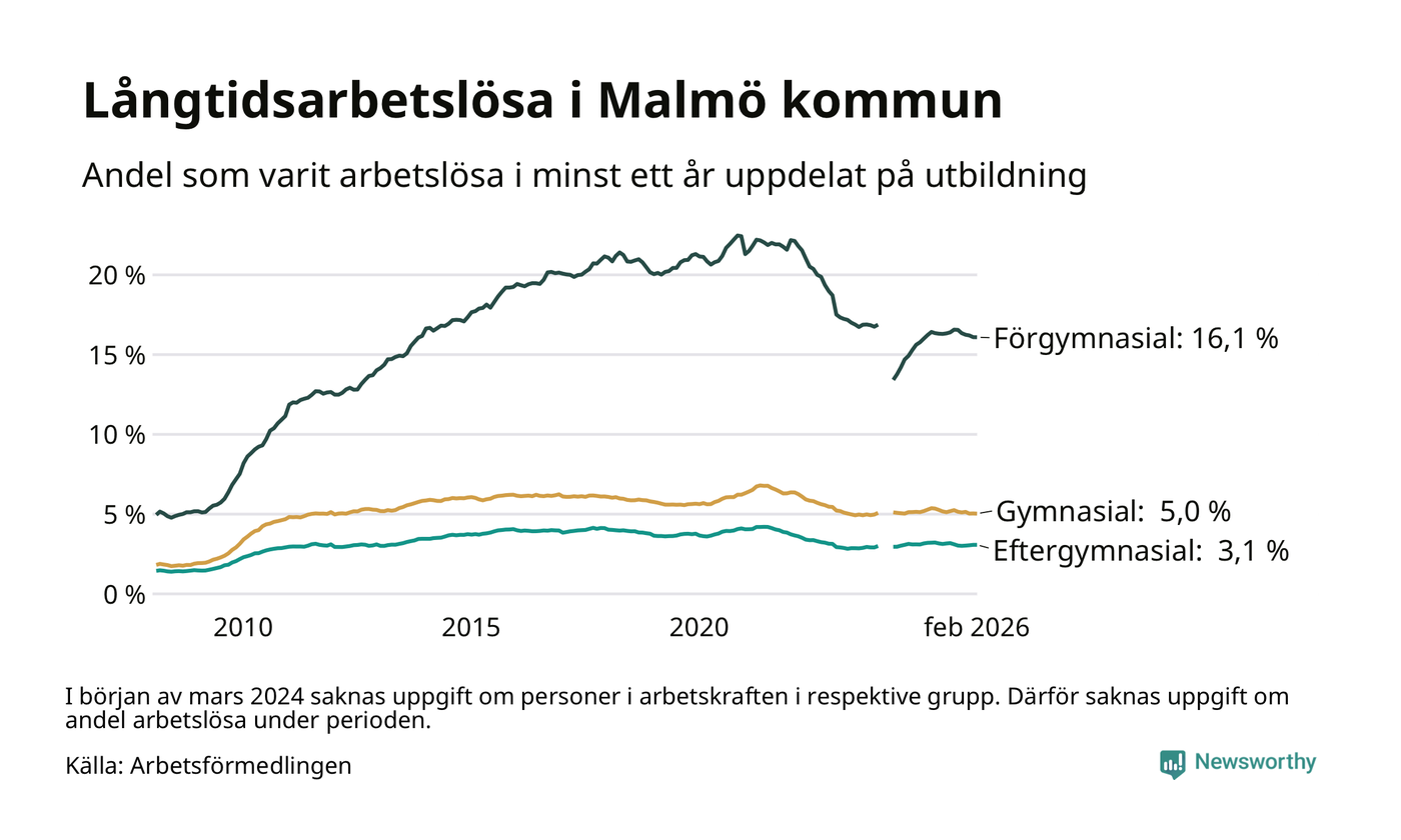 I februari hade 10 577 Malmöbor varit arbetslösa i minst ett år, vilket är sju färre än månaden innan. 10 577 personer motsvarar 5,5 procent av arbetskraften i kommunen – andelen långtidsarbetslösa är 0,3 procentenheter lägre än samma månad för ett år sedan. Malmö kommun hade näst högst andel långtidsarbetslösa i landet i februari.