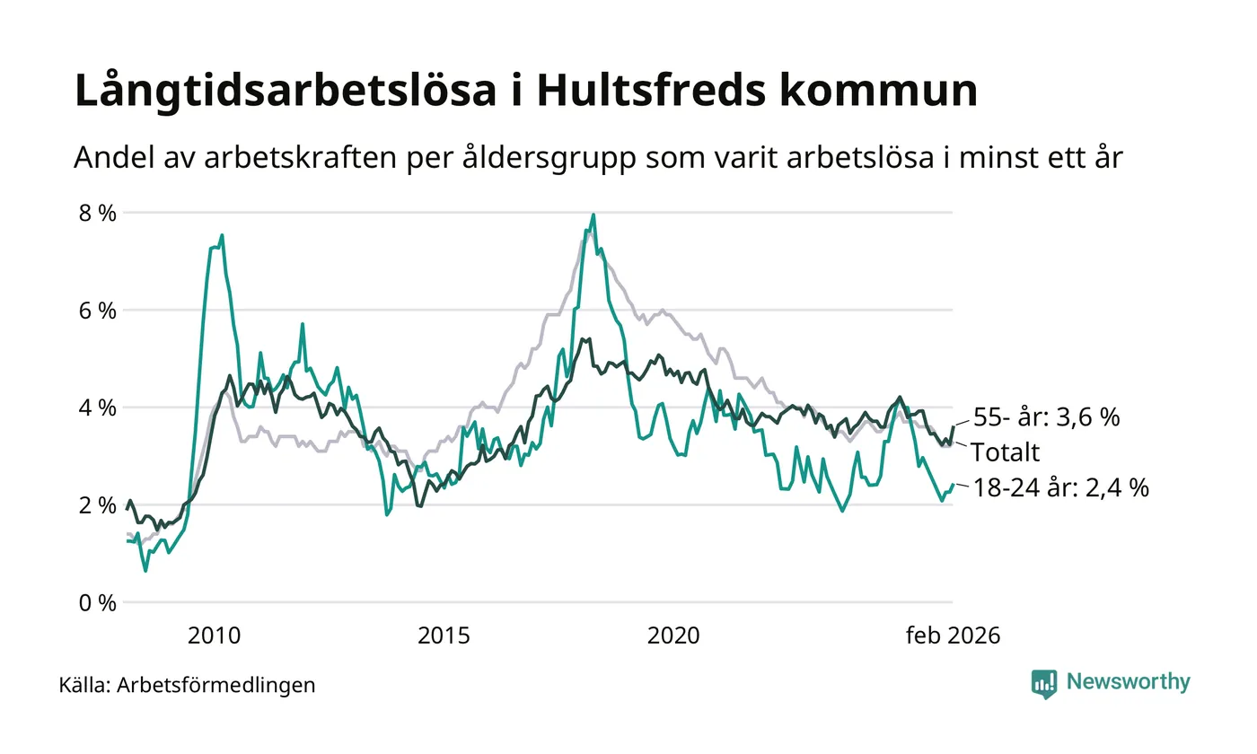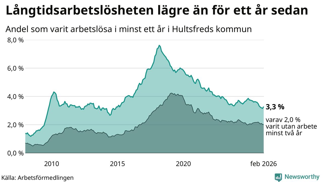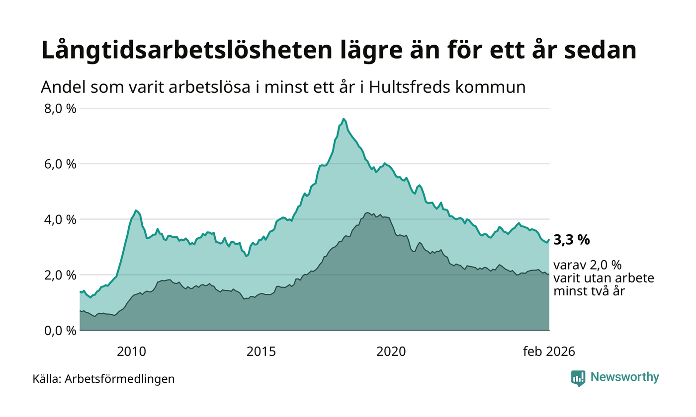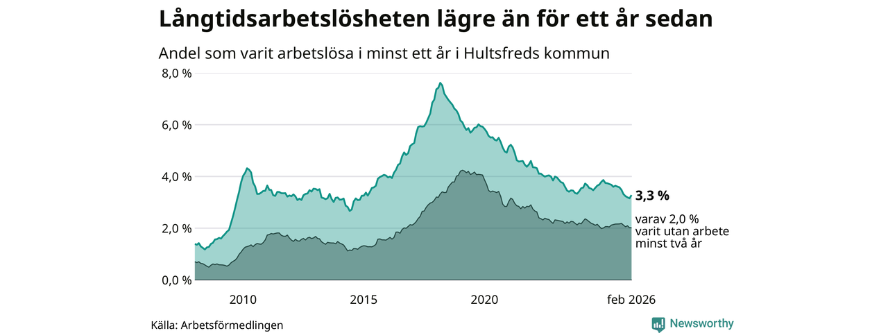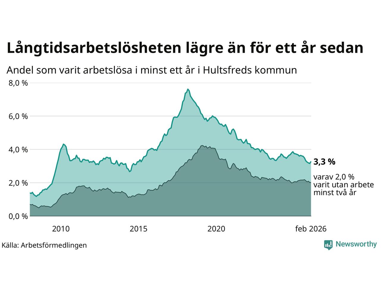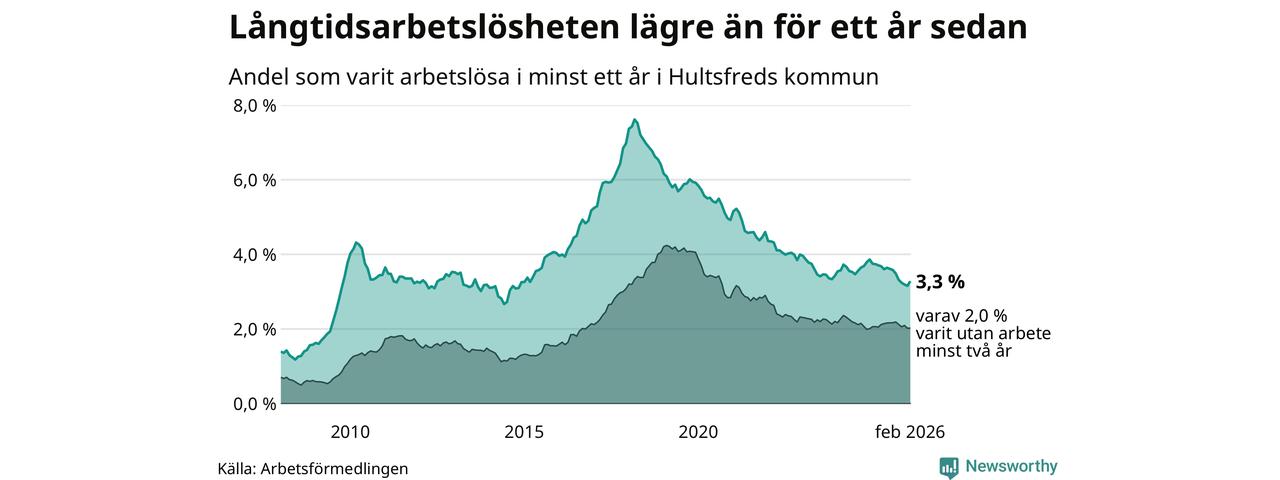 I februari hade 193 Hultsfredsbor varit arbetslösa i minst ett år, vilket är sju fler än månaden innan. Det är den första månaden sedan juni 2025 som antalet arbetslösa ökar. 193 personer motsvarar 3,3 procent av arbetskraften i kommunen – andelen långtidsarbetslösa är 0,4 procentenheter lägre än samma månad för ett år sedan.