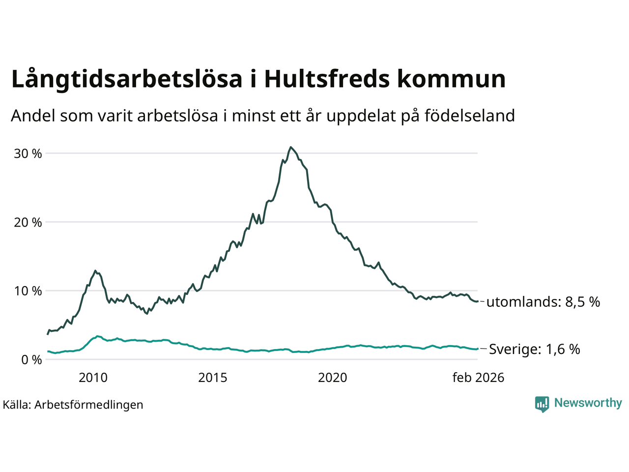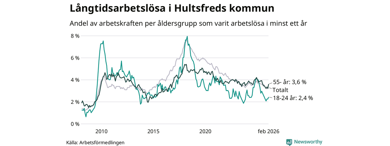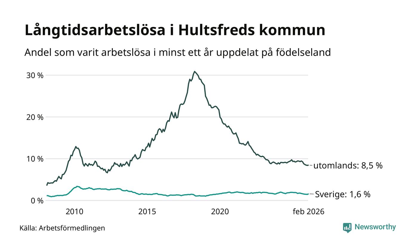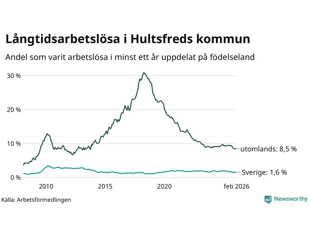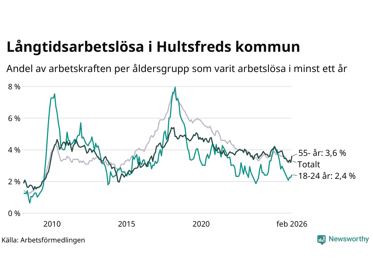 I februari hade 193 Hultsfredsbor varit arbetslösa i minst ett år, vilket är sju fler än månaden innan. Det är den första månaden sedan juni 2025 som antalet arbetslösa ökar. 193 personer motsvarar 3,3 procent av arbetskraften i kommunen – andelen långtidsarbetslösa är 0,4 procentenheter lägre än samma månad för ett år sedan.