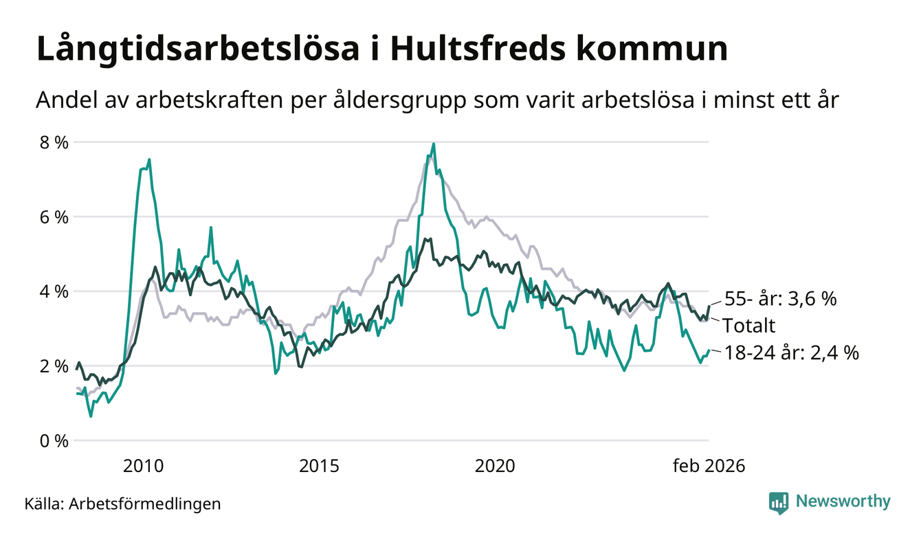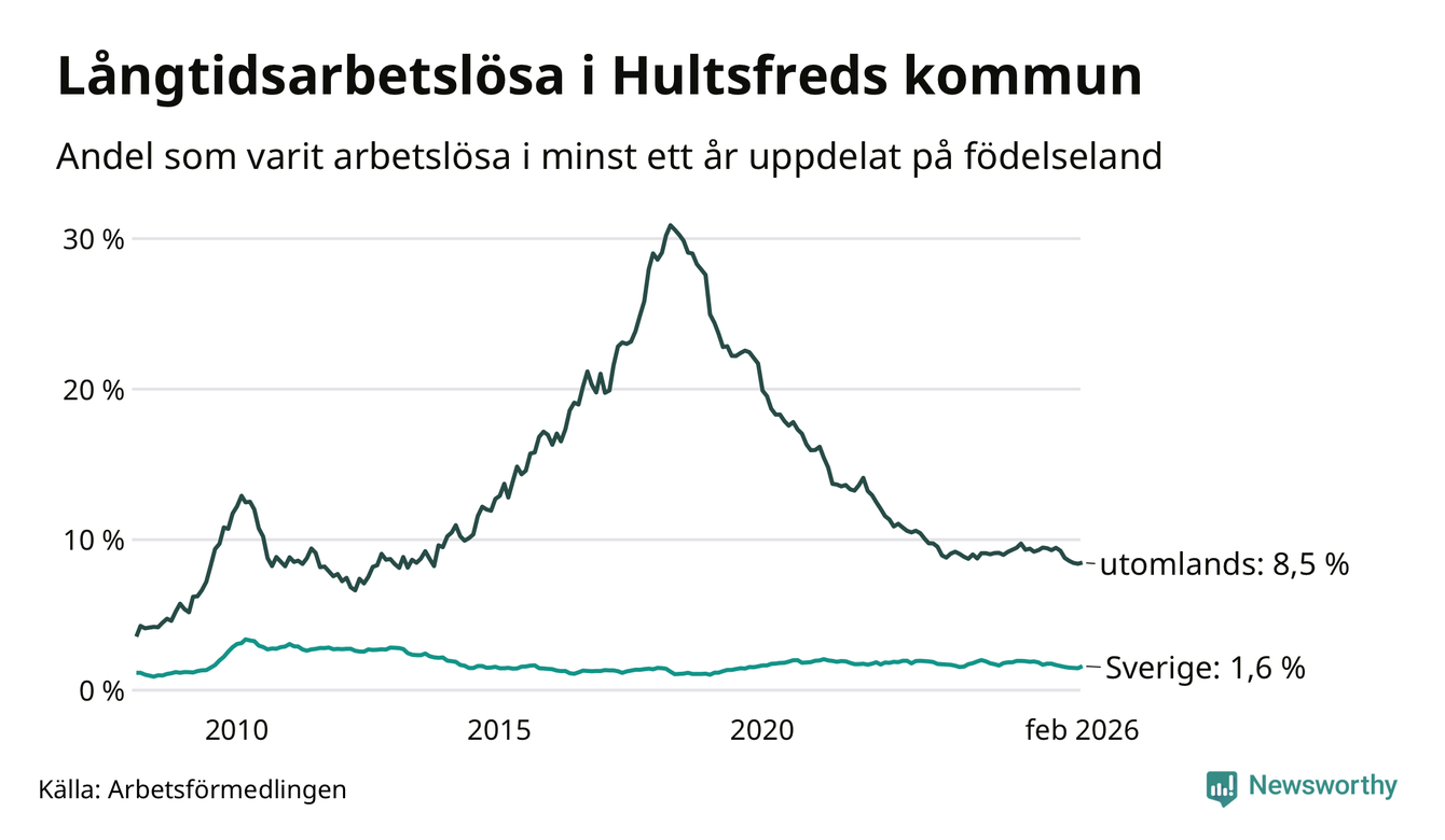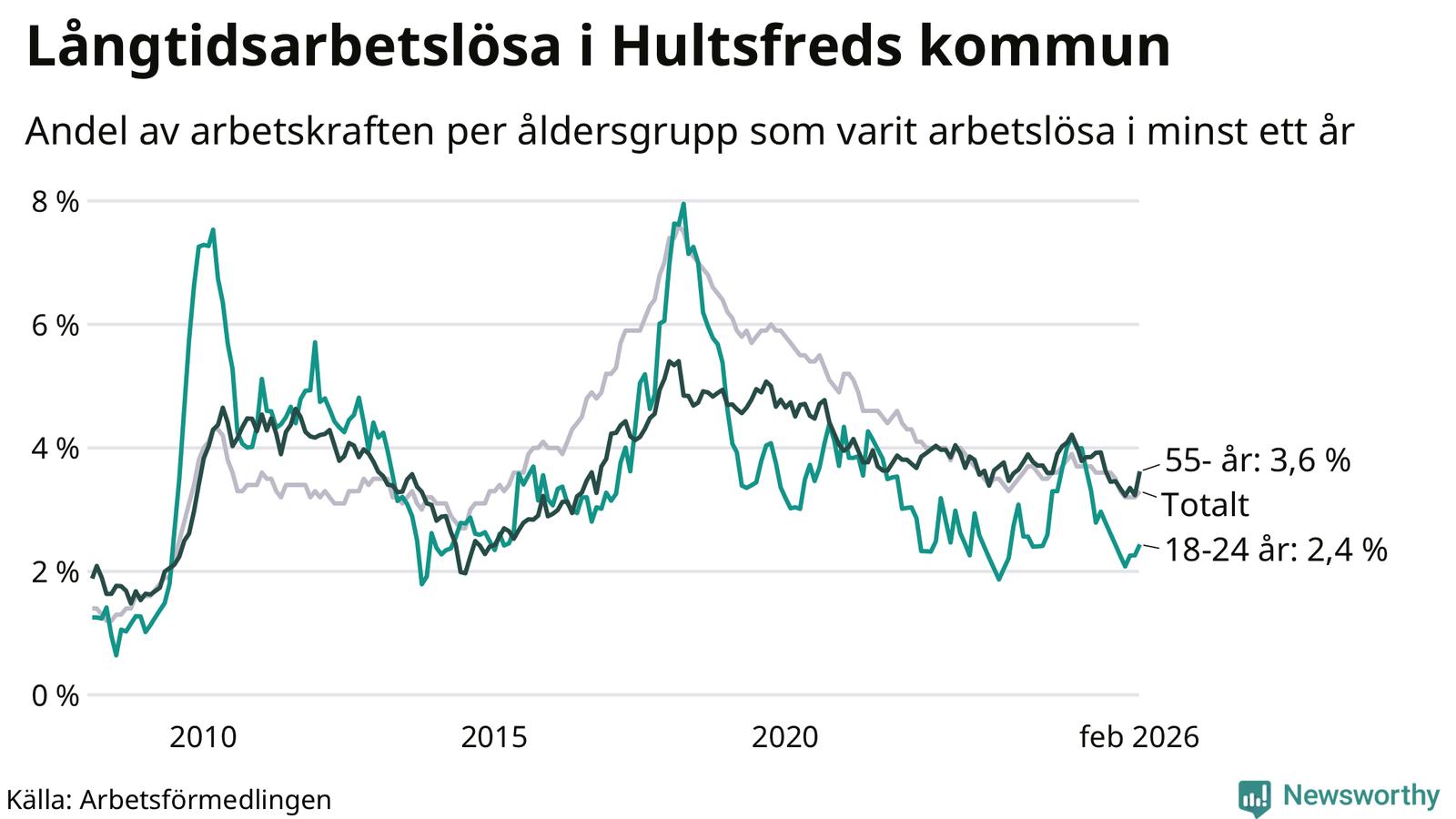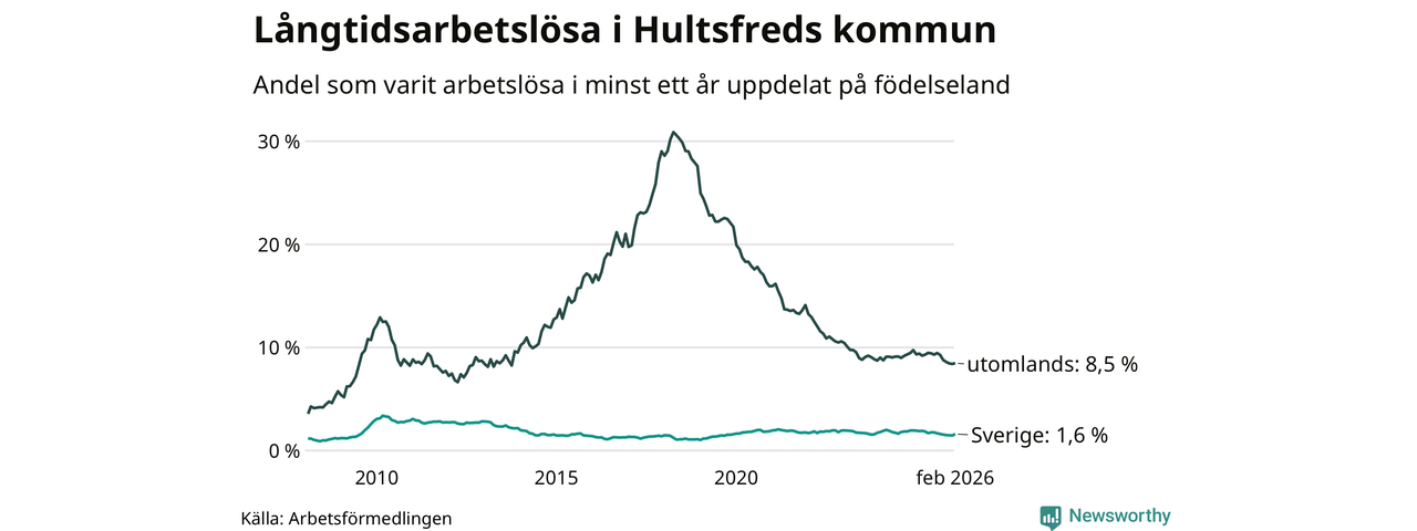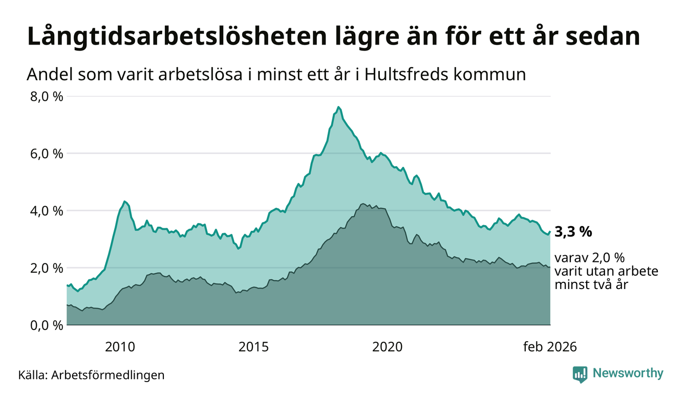 I februari hade 193 Hultsfredsbor varit arbetslösa i minst ett år, vilket är sju fler än månaden innan. Det är den första månaden sedan juni 2025 som antalet arbetslösa ökar. 193 personer motsvarar 3,3 procent av arbetskraften i kommunen – andelen långtidsarbetslösa är 0,4 procentenheter lägre än samma månad för ett år sedan.