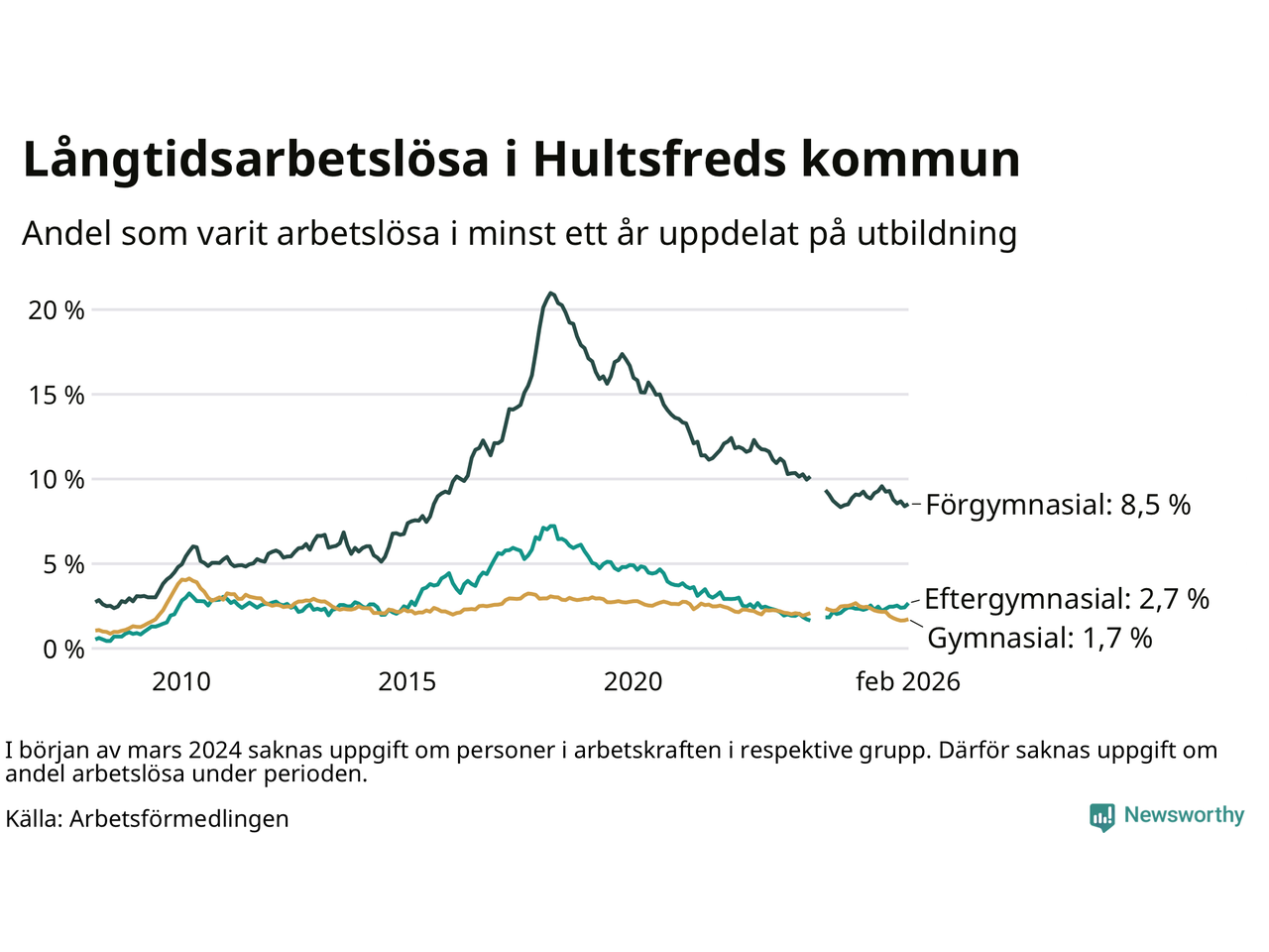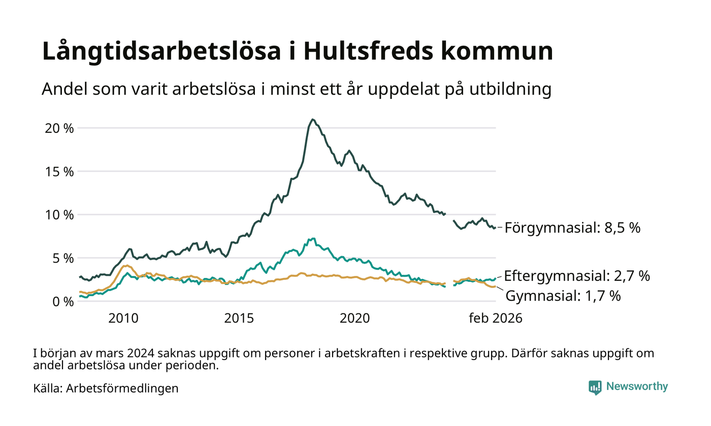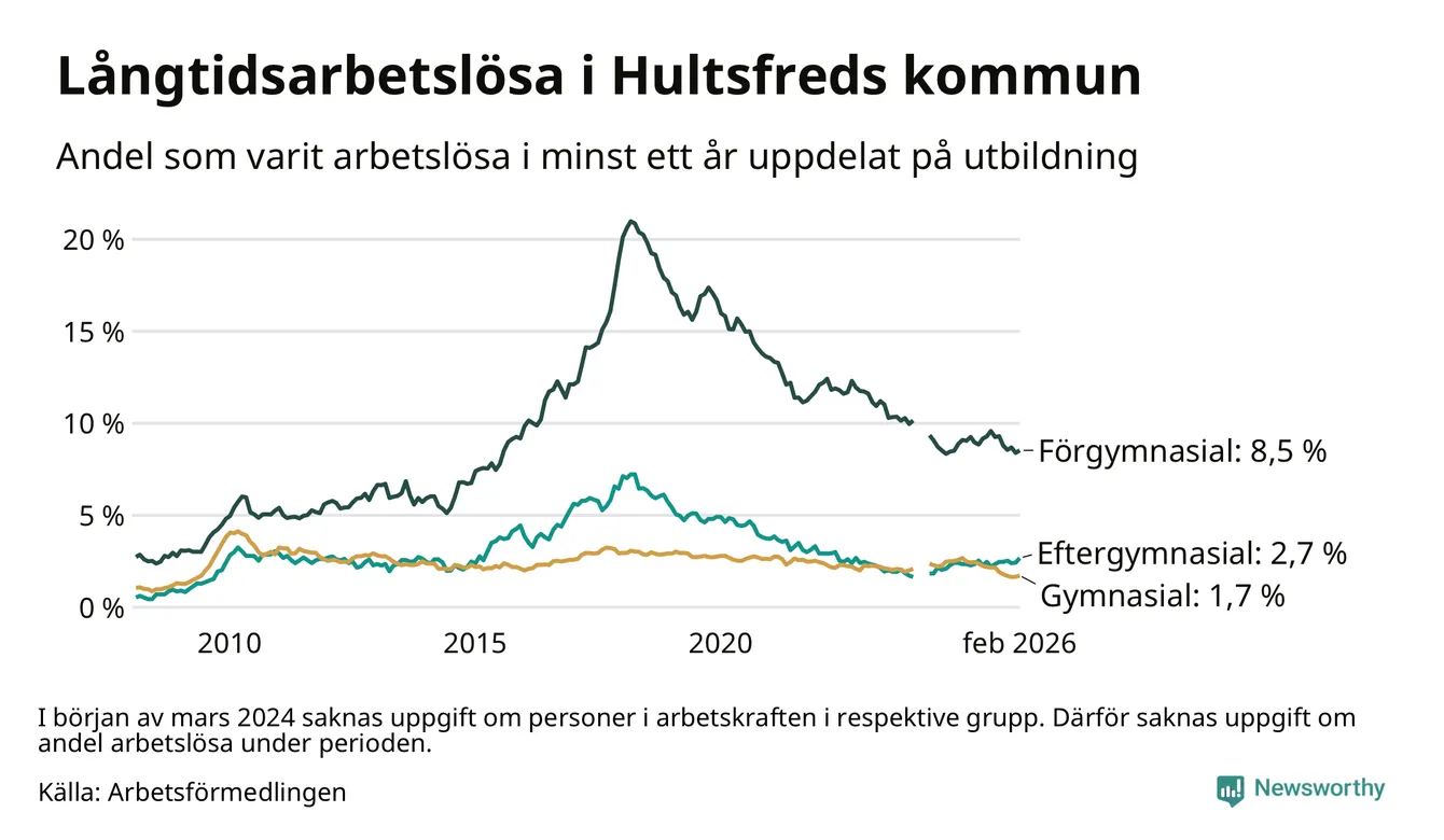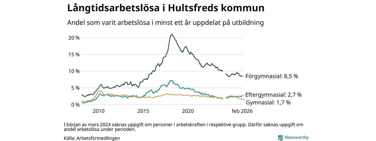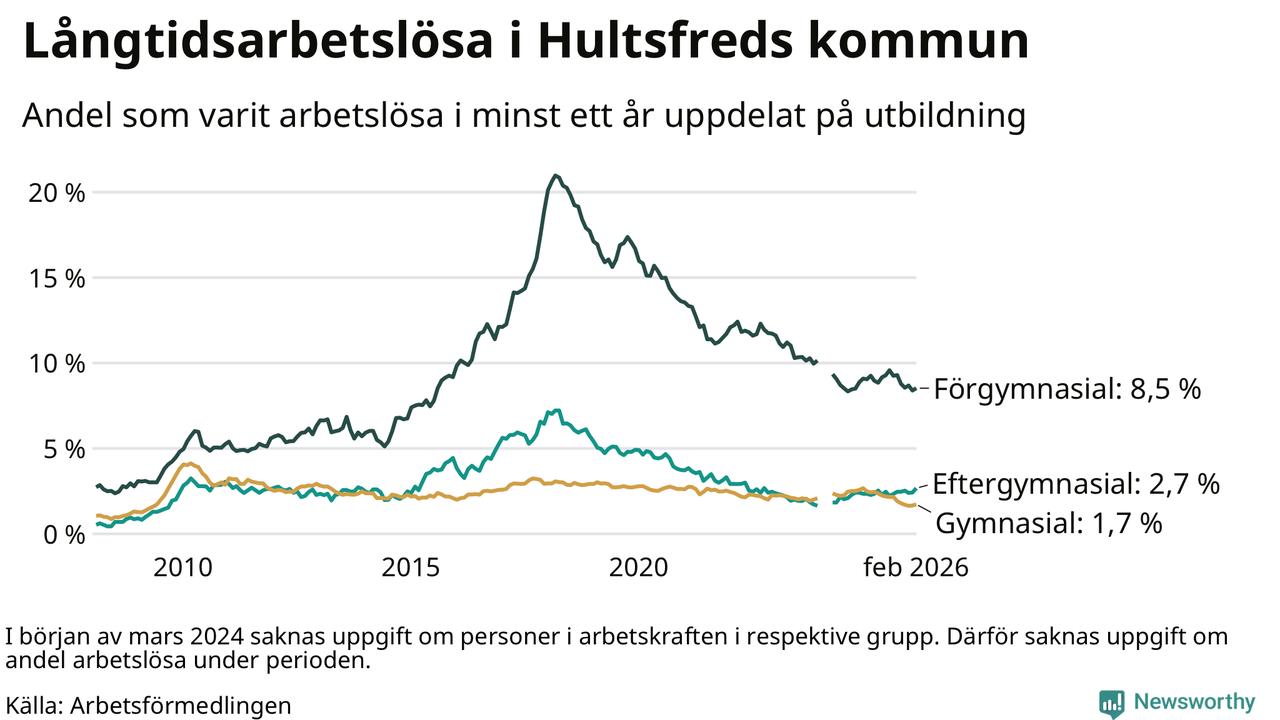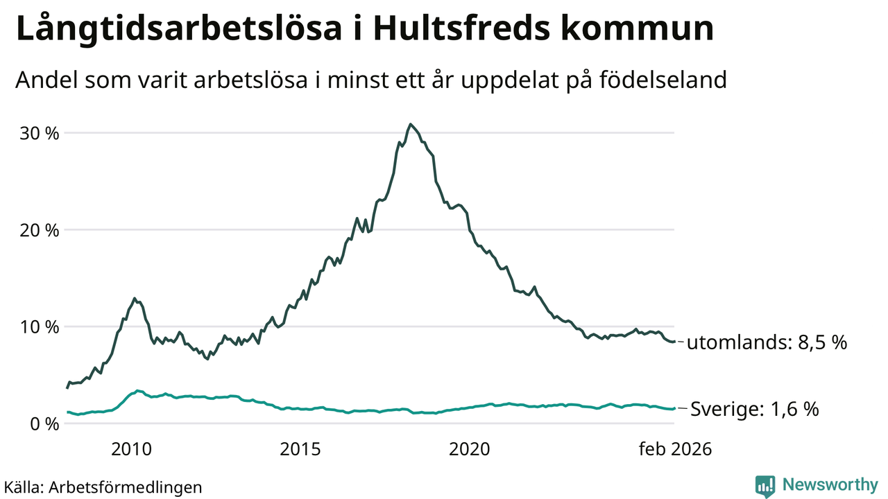 I februari hade 193 Hultsfredsbor varit arbetslösa i minst ett år, vilket är sju fler än månaden innan. Det är den första månaden sedan juni 2025 som antalet arbetslösa ökar. 193 personer motsvarar 3,3 procent av arbetskraften i kommunen – andelen långtidsarbetslösa är 0,4 procentenheter lägre än samma månad för ett år sedan.