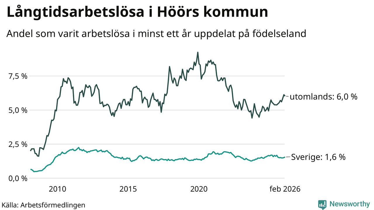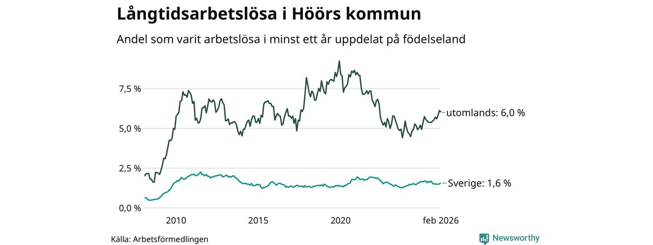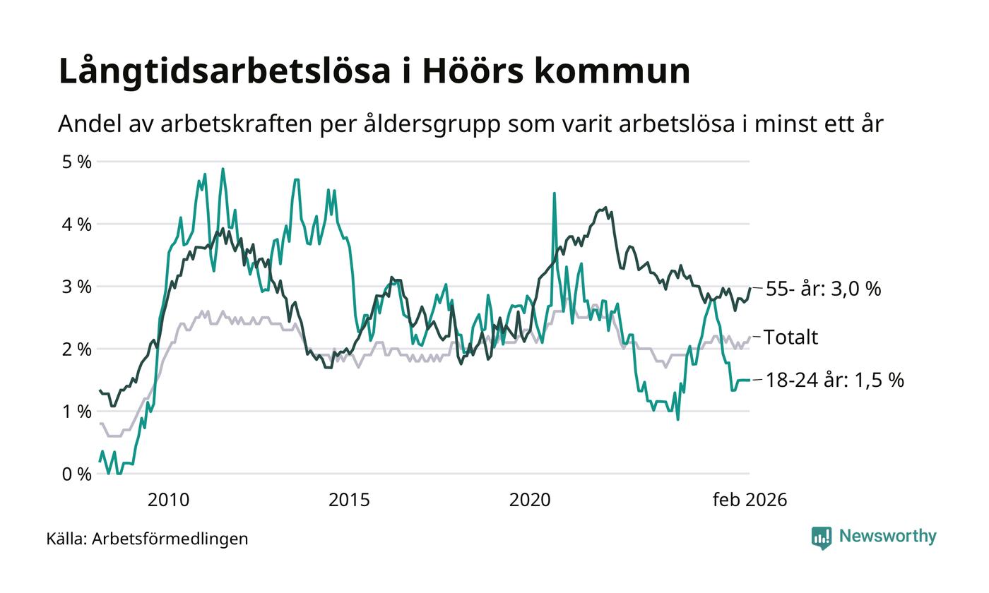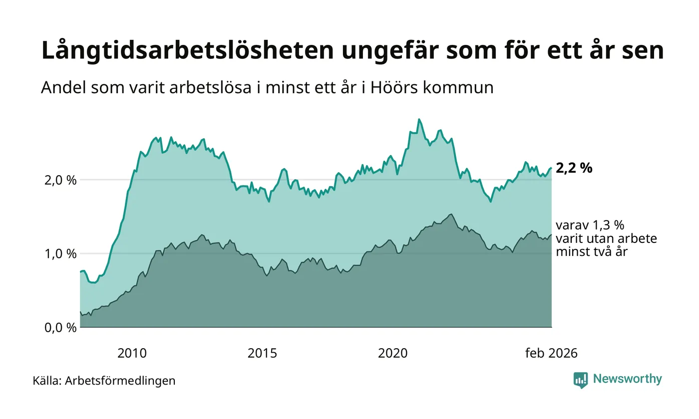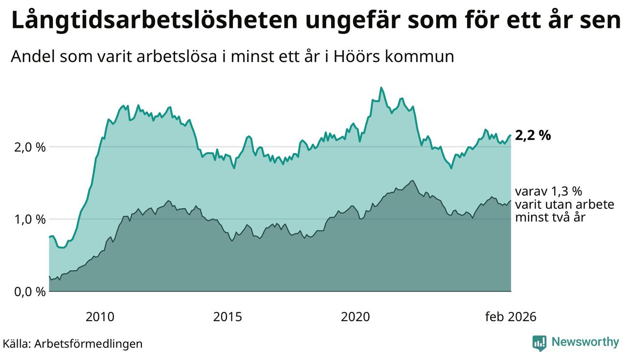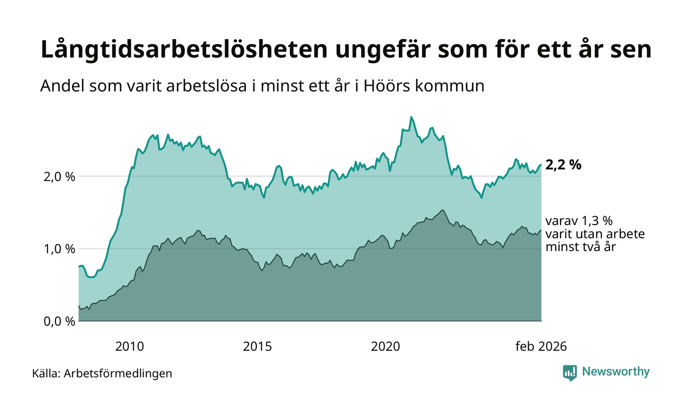 I februari hade 184 Höörbor varit arbetslösa i minst ett år, vilket är två fler än månaden innan. 184 personer motsvarar 2,2 procent av arbetskraften i kommunen – andelen långtidsarbetslösa är ungefär på samma nivå som för ett år sedan.