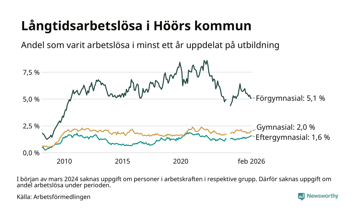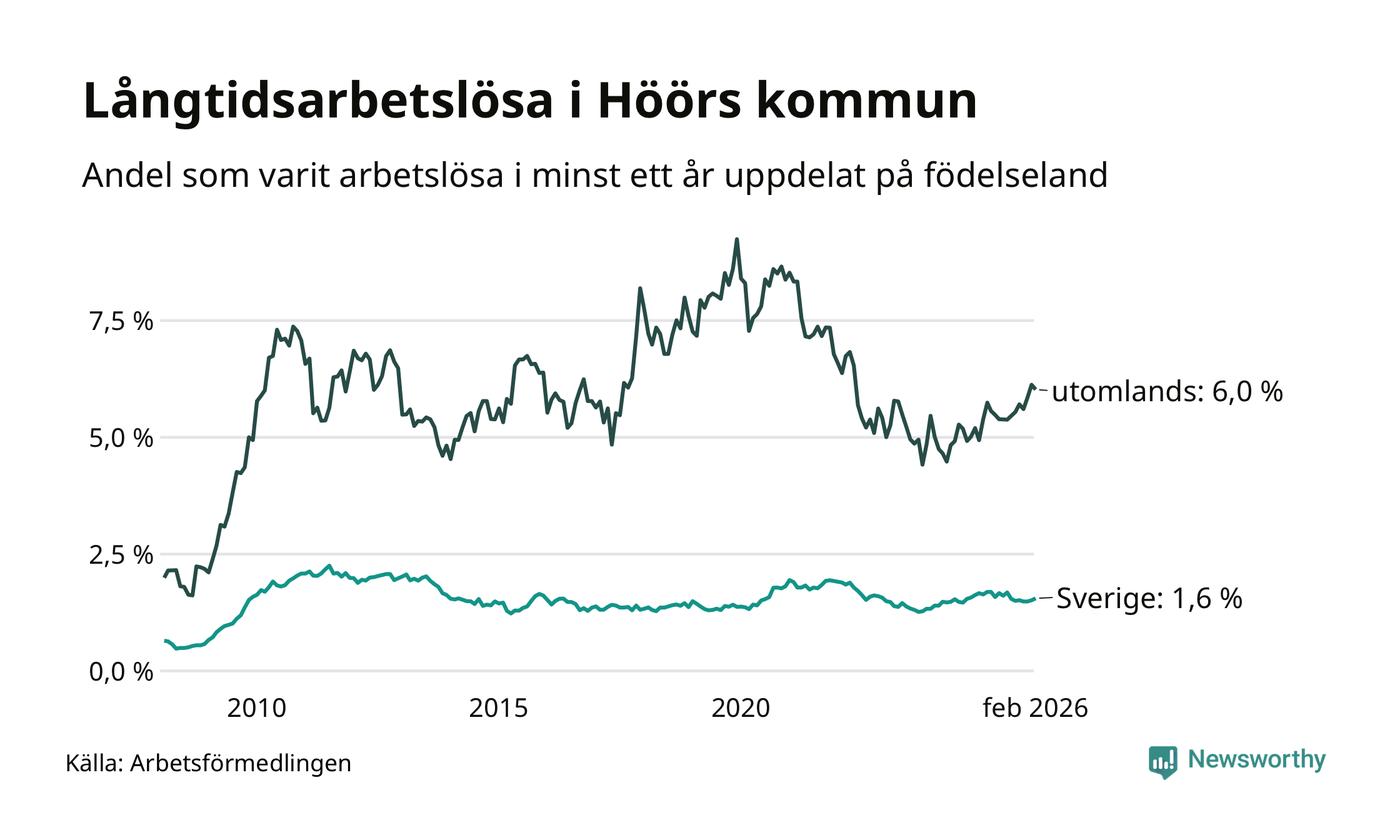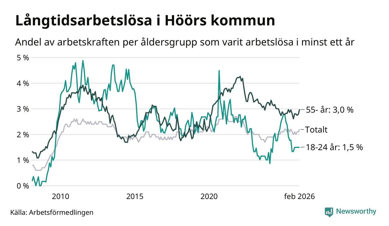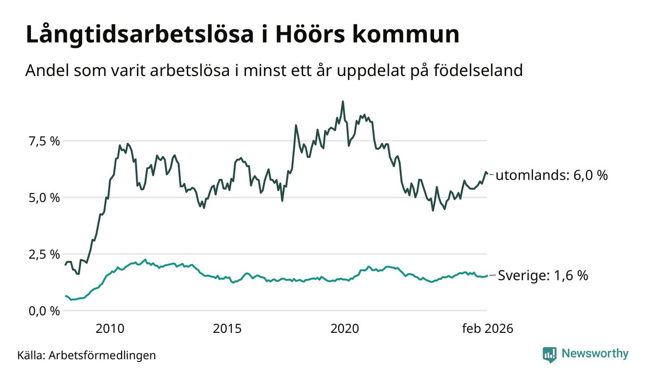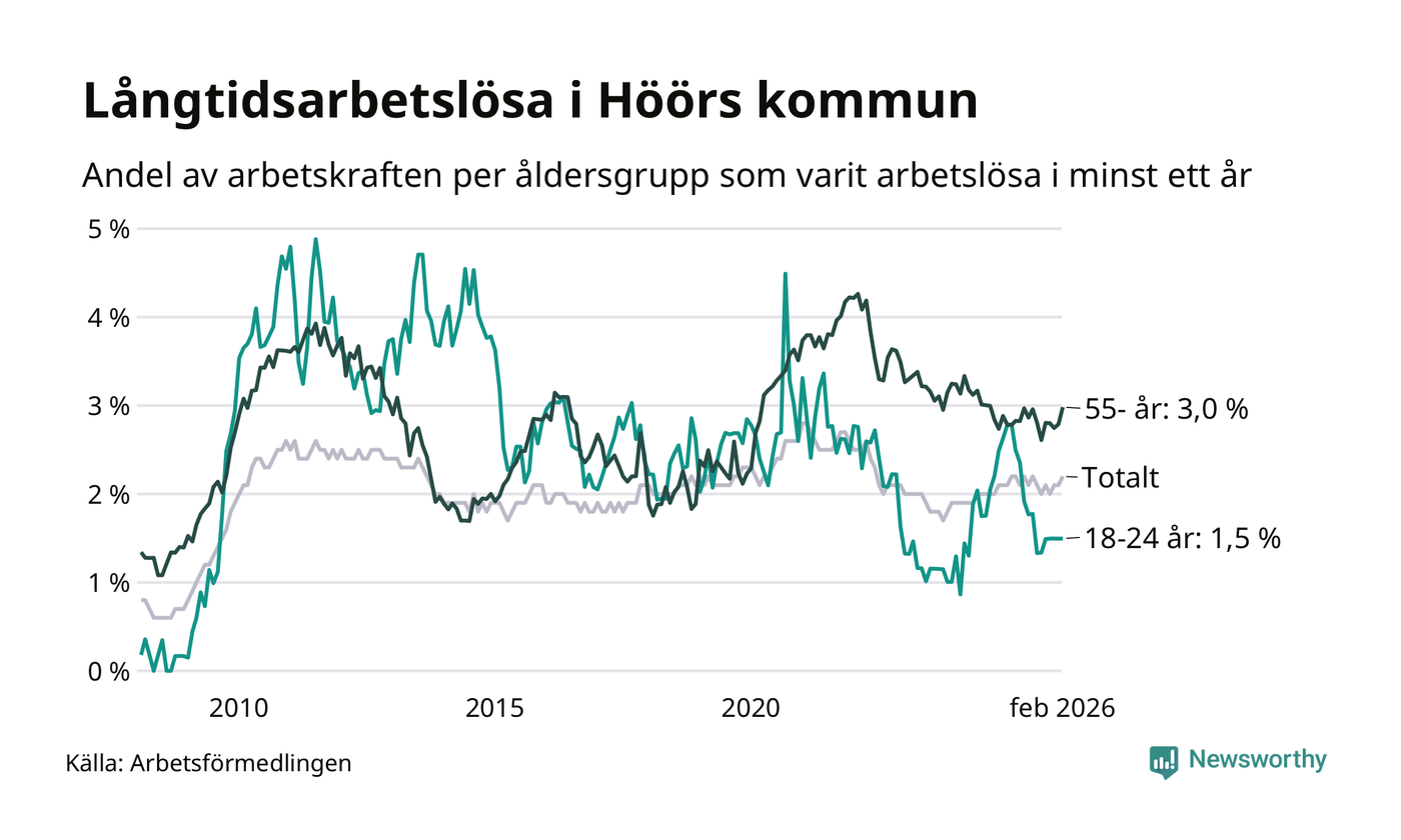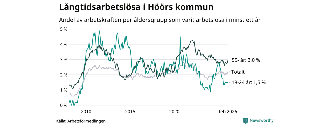 I februari hade 184 Höörbor varit arbetslösa i minst ett år, vilket är två fler än månaden innan. 184 personer motsvarar 2,2 procent av arbetskraften i kommunen – andelen långtidsarbetslösa är ungefär på samma nivå som för ett år sedan.