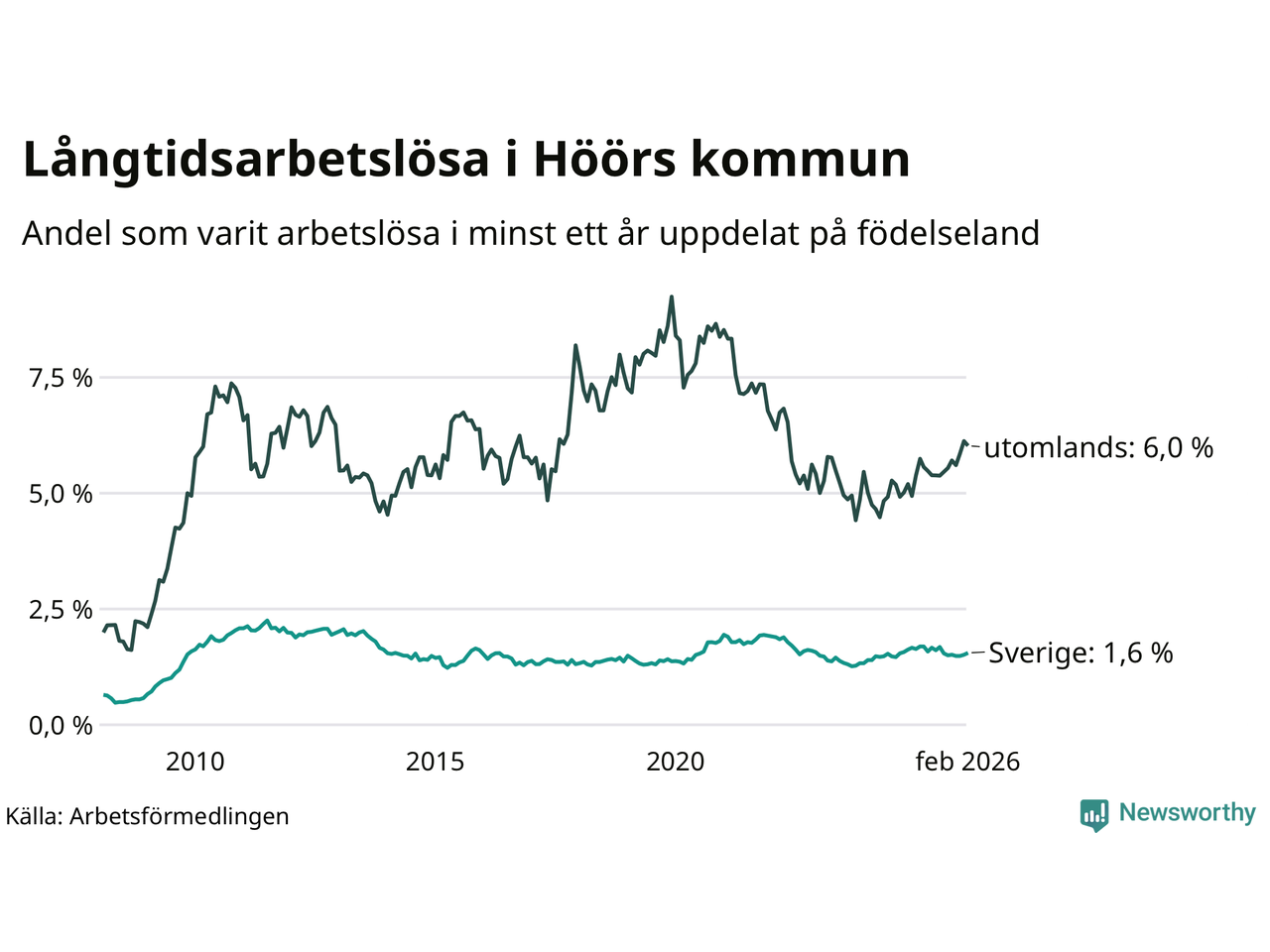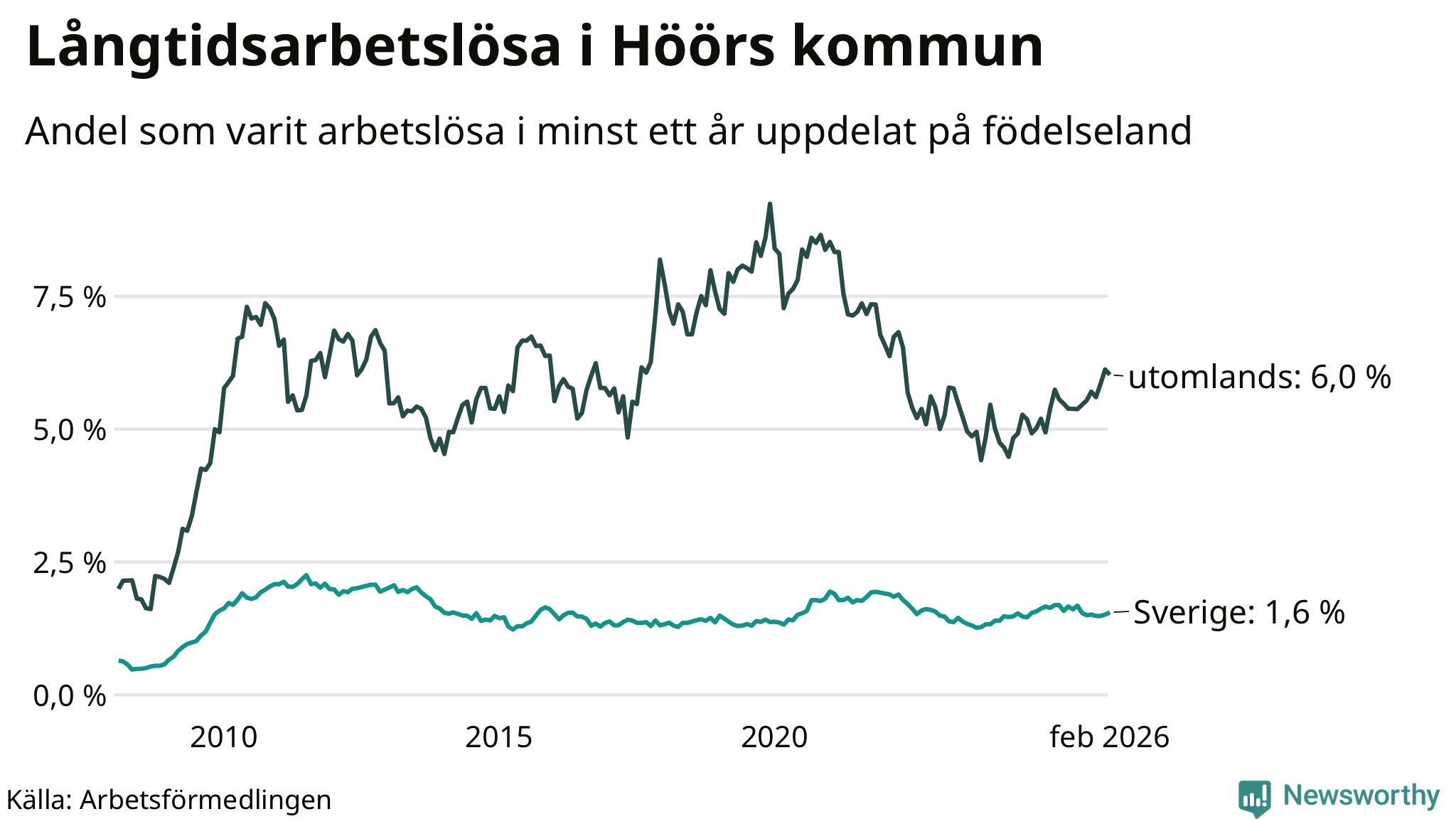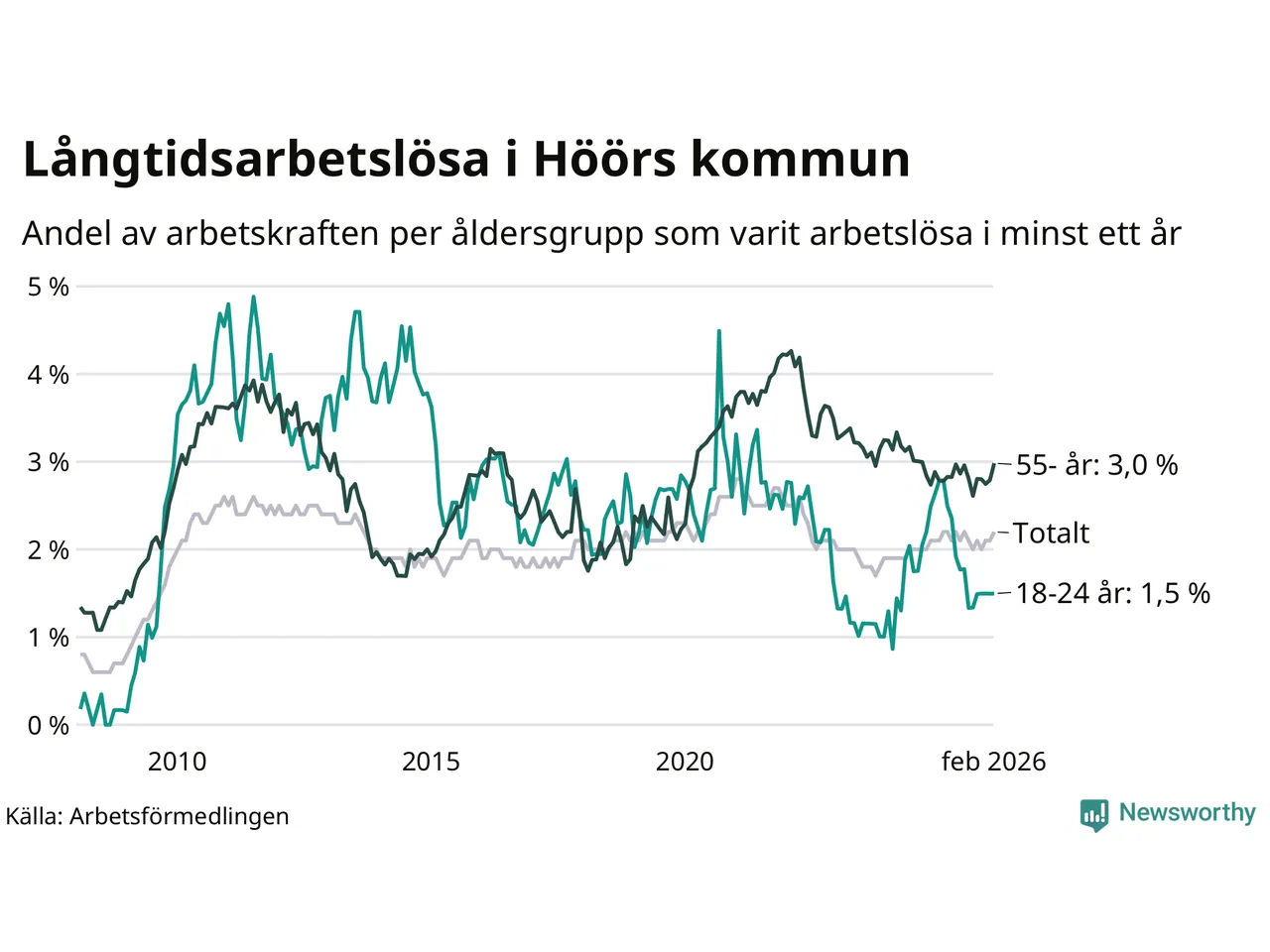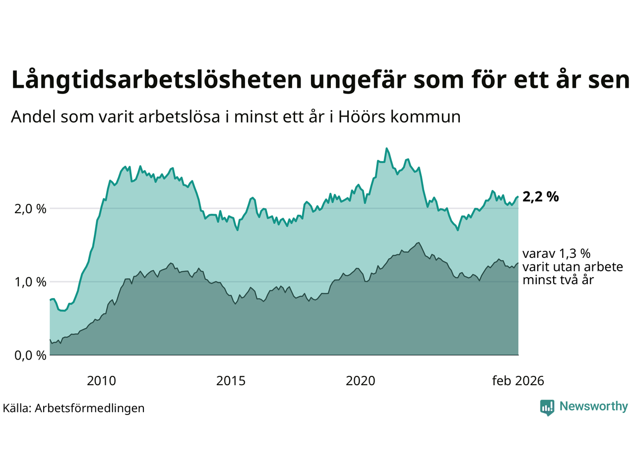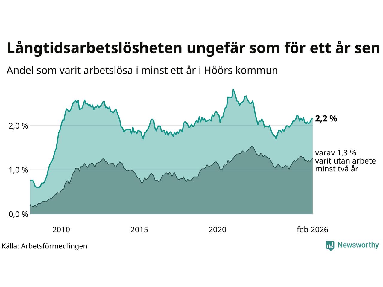 I februari hade 184 Höörbor varit arbetslösa i minst ett år, vilket är två fler än månaden innan. 184 personer motsvarar 2,2 procent av arbetskraften i kommunen – andelen långtidsarbetslösa är ungefär på samma nivå som för ett år sedan.