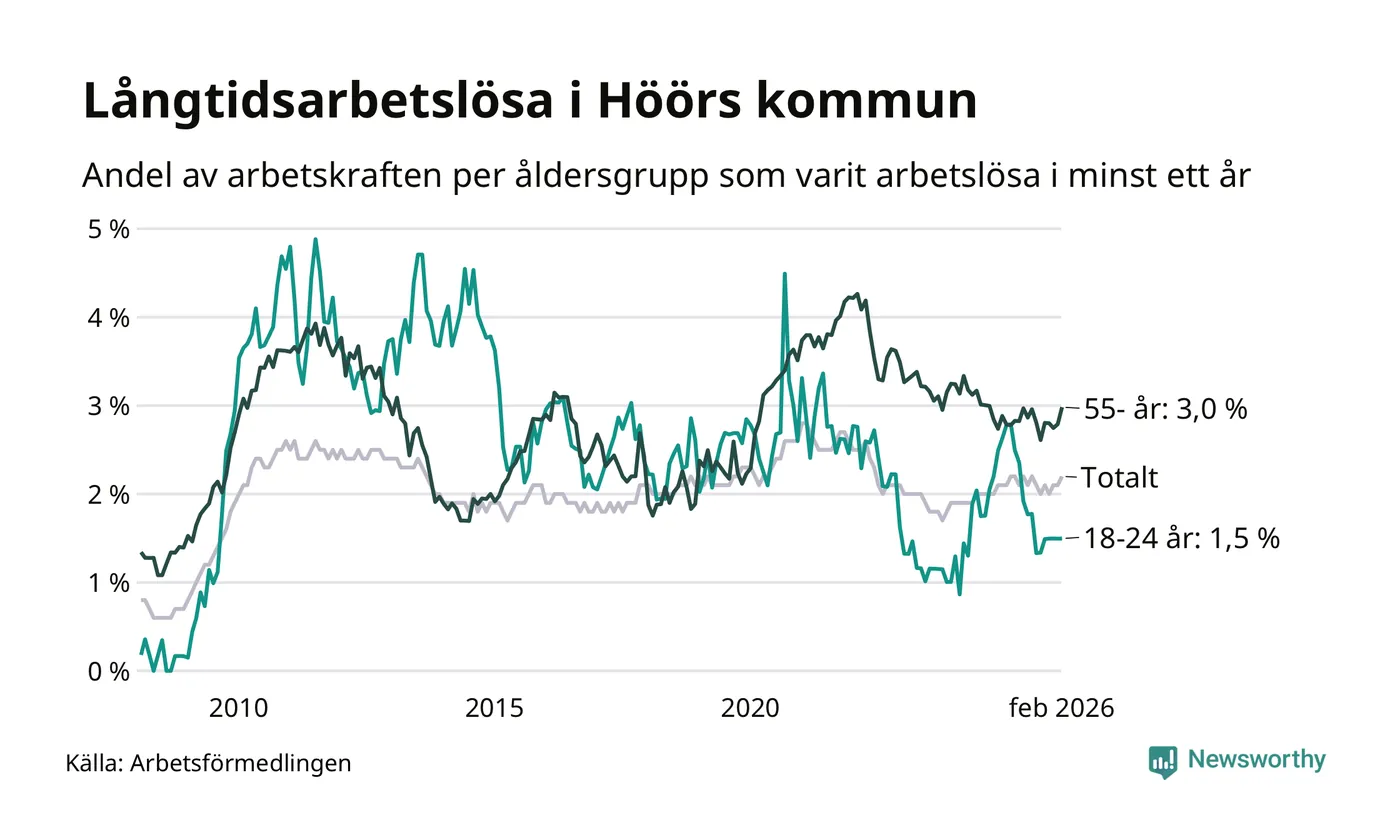 Av de 184 personerna som varit arbetslösa i mer än ett år i Höörs kommun är 61 personer mellan 55 och 661 år och tio är mellan 18 och 24 år. För den äldre gruppen är andelen arbetslösa 3,0 procent medan den i den yngre gruppen är 1,5 procent. Även i riket som helhet är långtidsarbetslösheten högre i gruppen äldre.