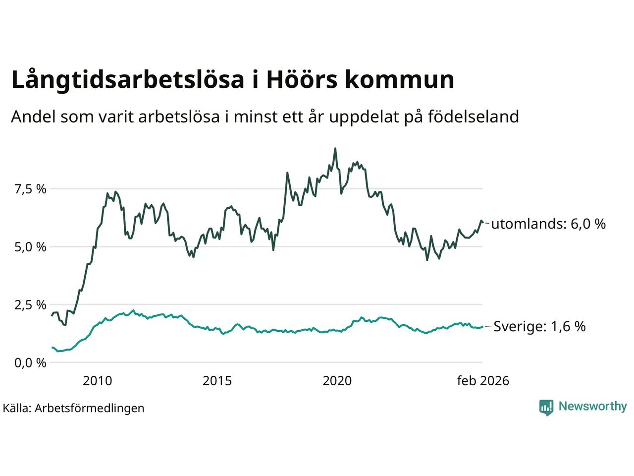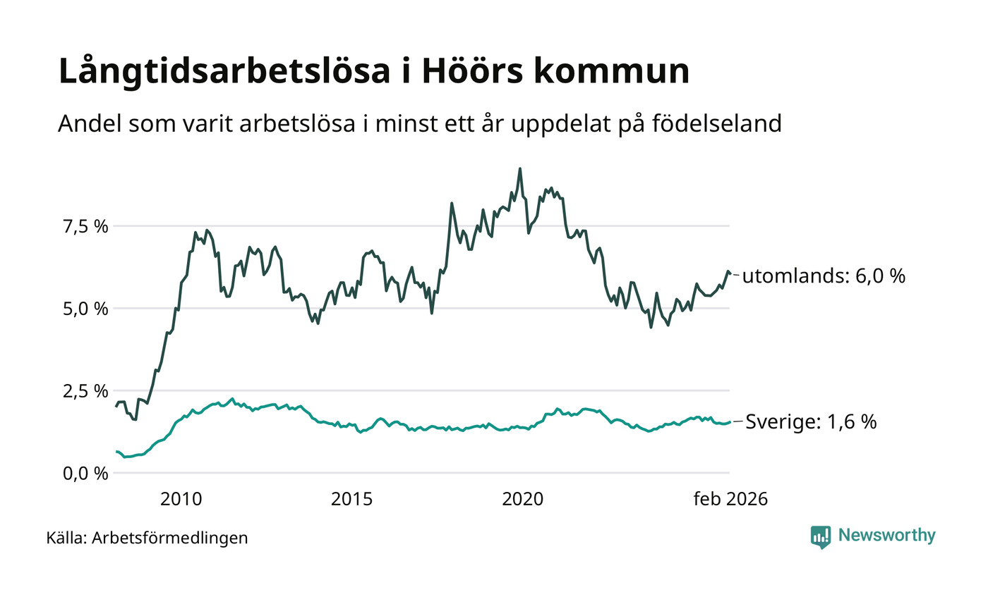 114 av de långtidsarbetslösa i Höör är födda i Sverige, medan 70 är födda utomlands. Det innebär att långtidsarbetslösheten bland Sverigefödda är 1,6 procent, medan den är fyra gånger så hög – 6,0 procent – bland födda utomlands. Även i riket som helhet är arbetslösheten högre bland utrikesfödda.