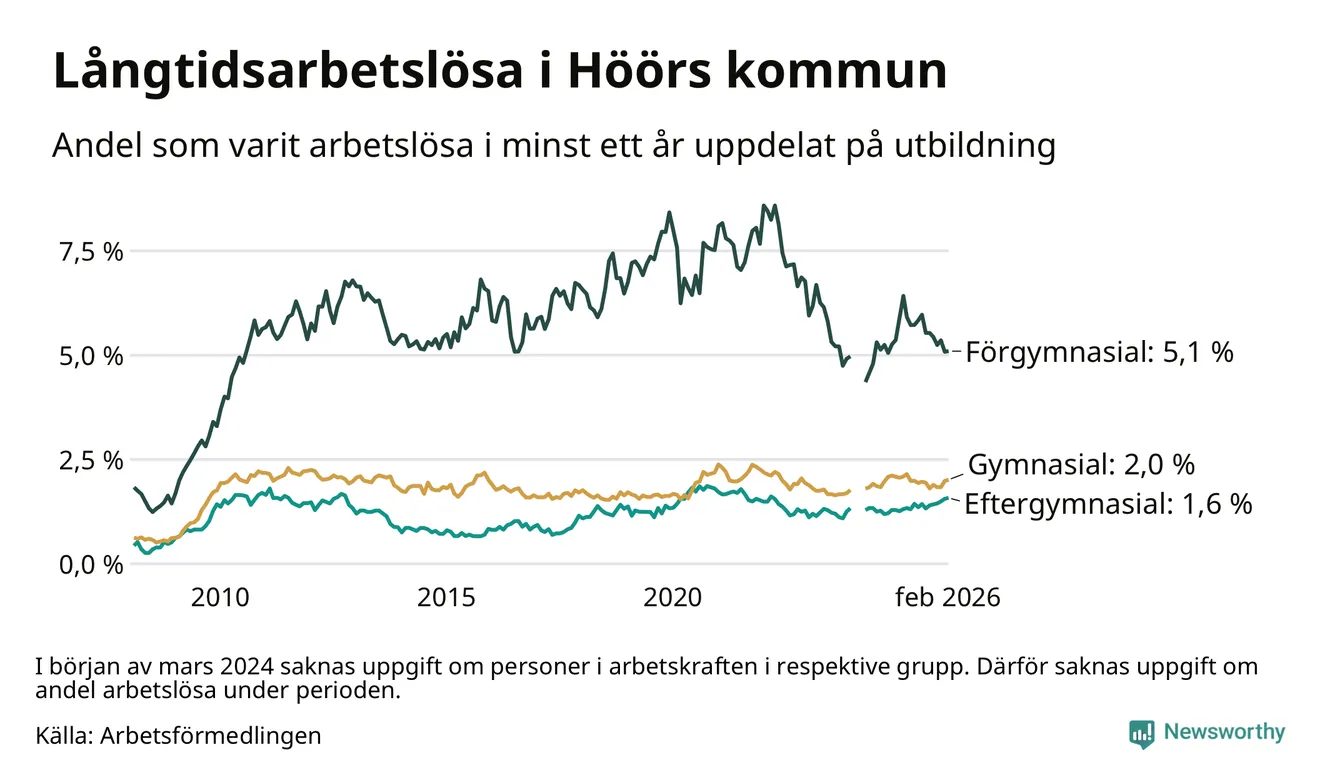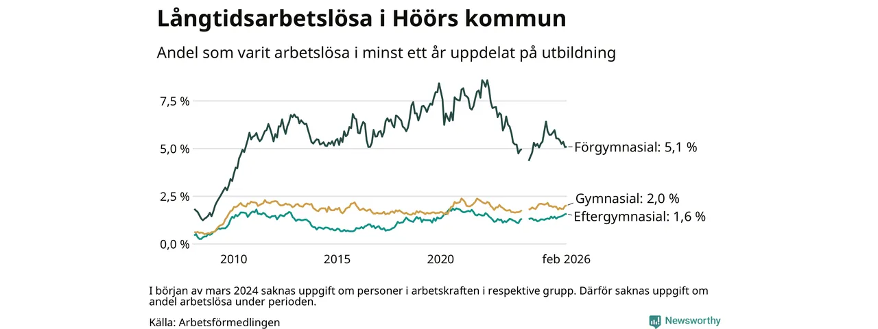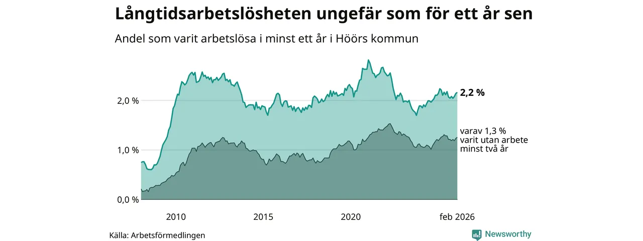 Andelen som varit utan arbete i minst ett år i Höör var ungefär lika stor i februari jämfört med samma månad för ett år sedan. Det visar Arbetsfömedlingens senaste månadsstatistik.