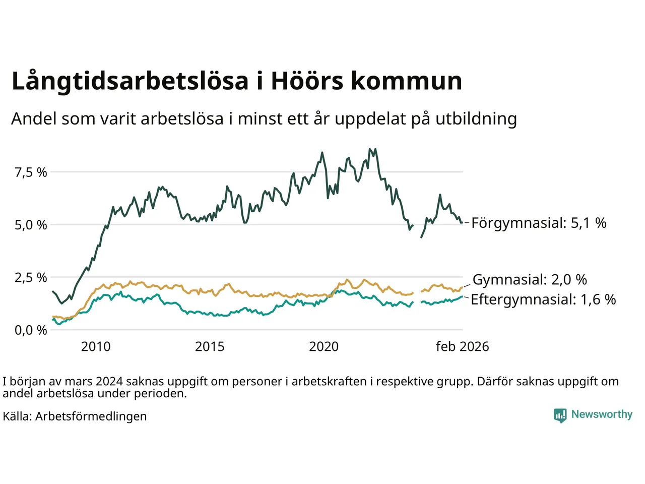 | Andel arbetslösa i minst två år | 1,3 % | 2,2 % | 1,6 % |