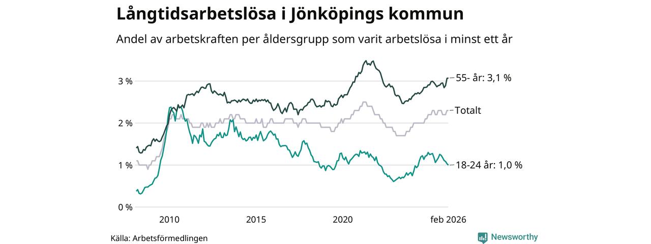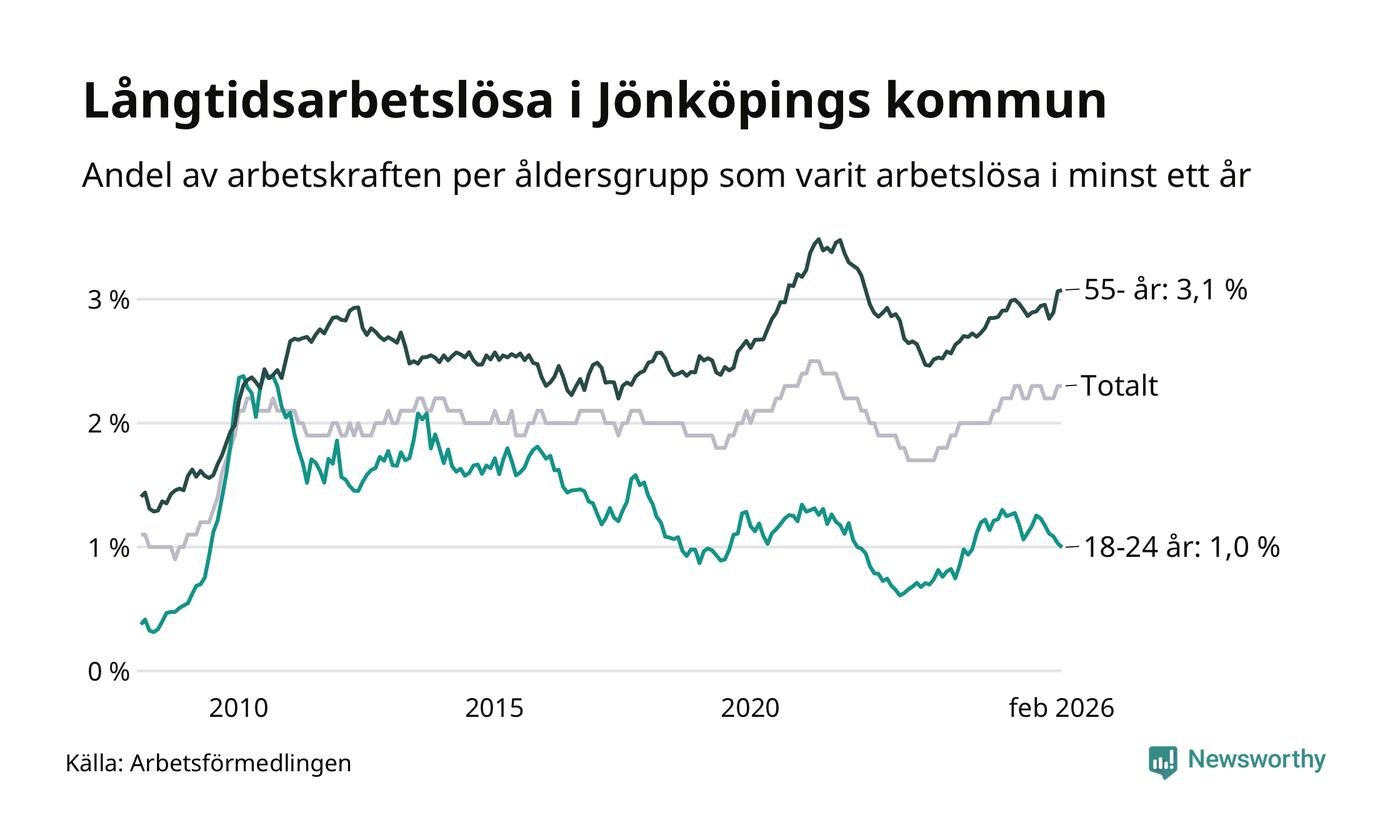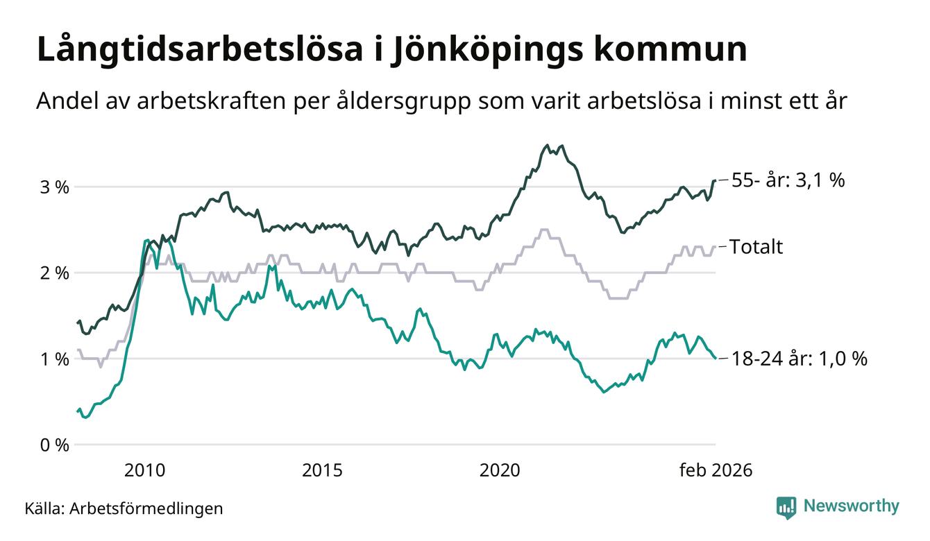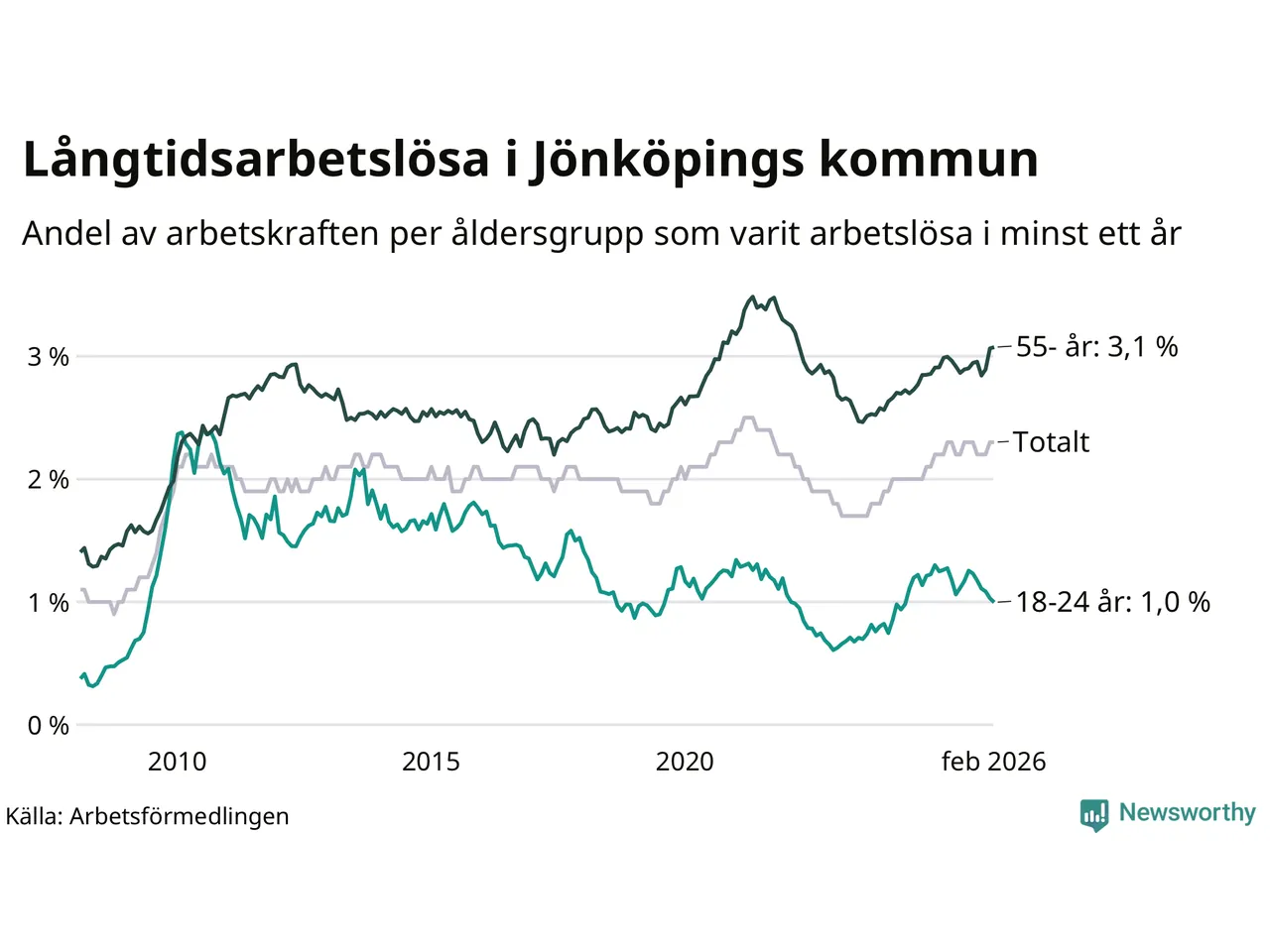 Av de 1 731 personerna som varit arbetslösa i mer än ett år i Jönköpings kommun är 456 personer mellan 55 och 661 år och 93 är mellan 18 och 24 år. För den äldre gruppen är andelen arbetslösa 3,1 procent medan den i den yngre gruppen är 1,0 procent. Även i riket som helhet är långtidsarbetslösheten högre i gruppen äldre.