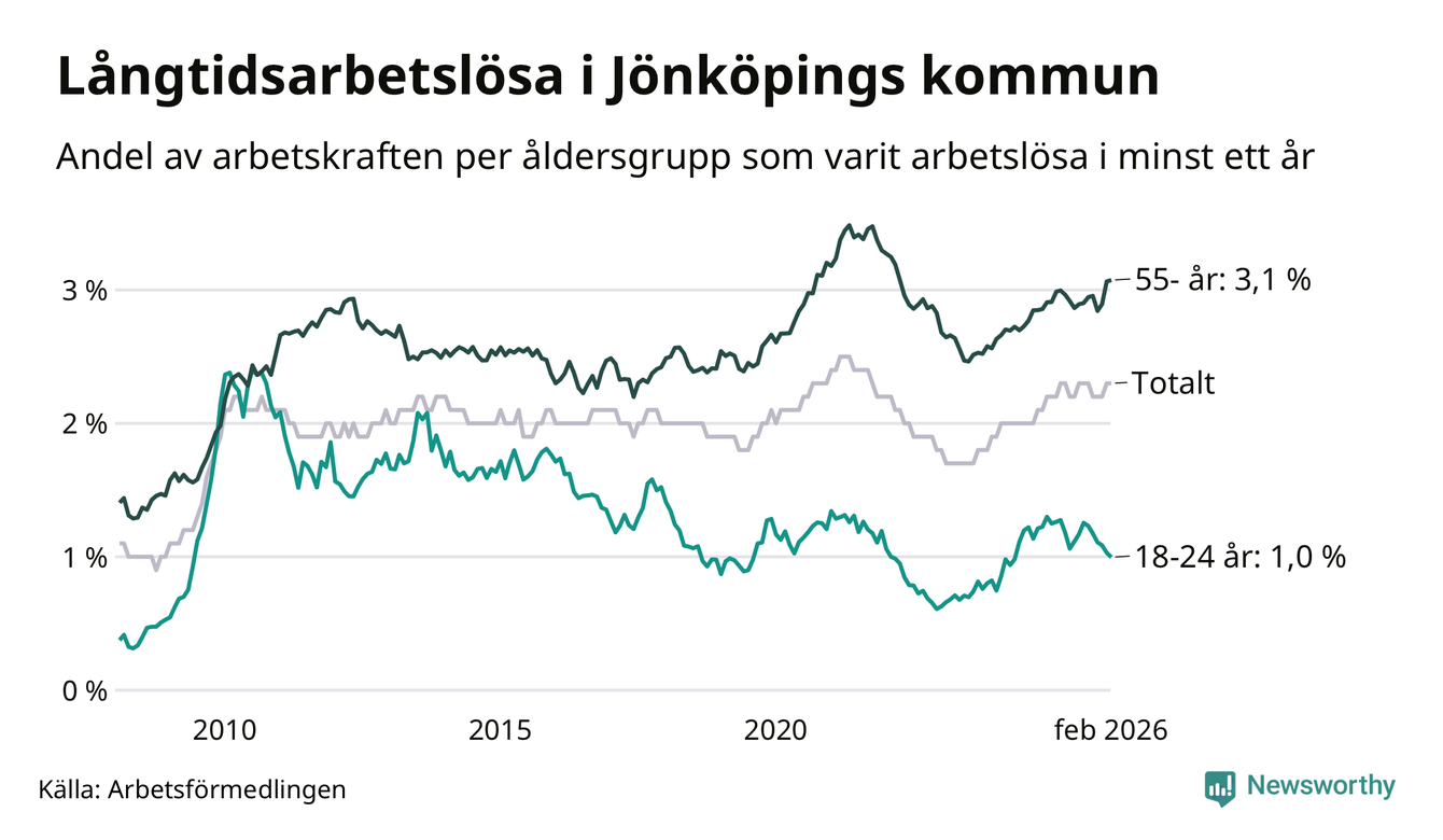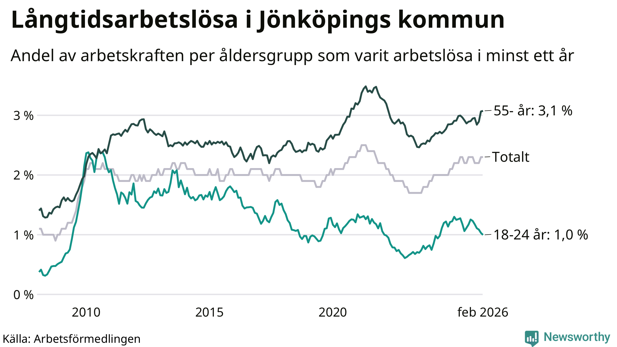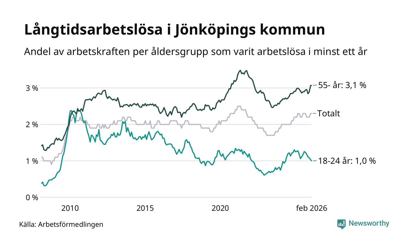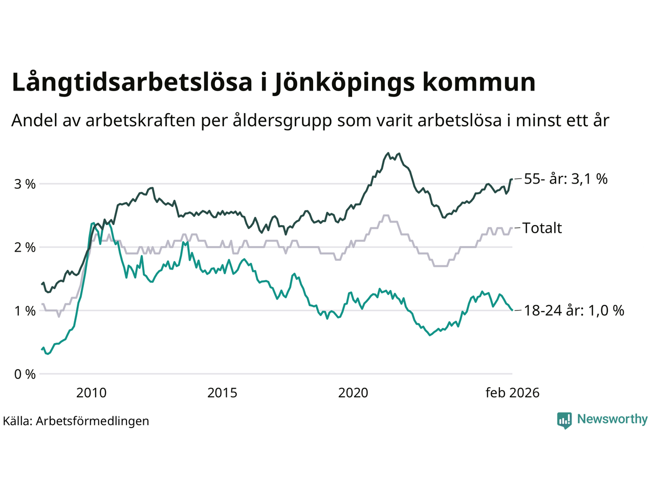 Av de 1 731 personerna som varit arbetslösa i mer än ett år i Jönköpings kommun är 456 personer mellan 55 och 661 år och 93 är mellan 18 och 24 år. För den äldre gruppen är andelen arbetslösa 3,1 procent medan den i den yngre gruppen är 1,0 procent. Även i riket som helhet är långtidsarbetslösheten högre i gruppen äldre.