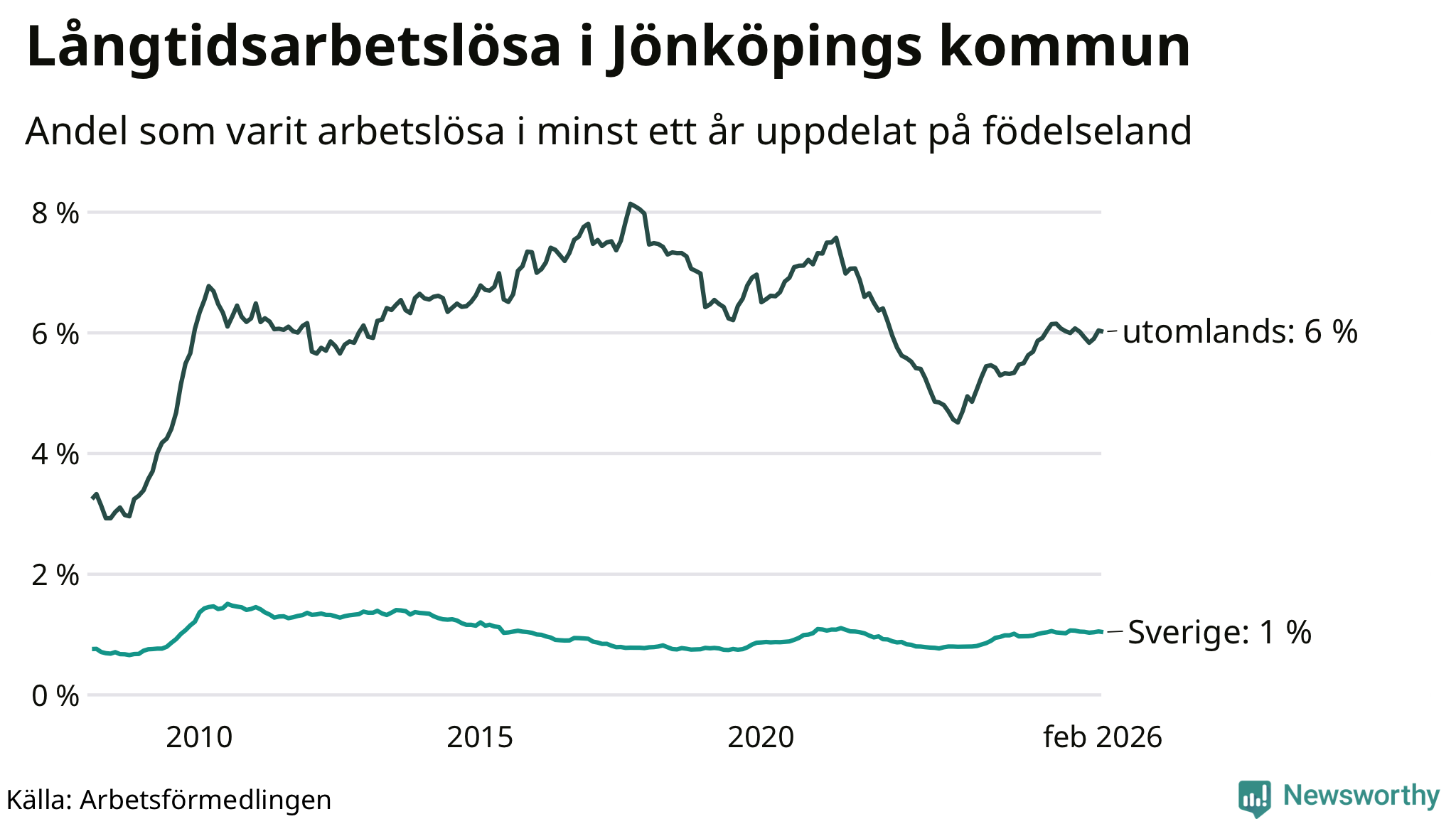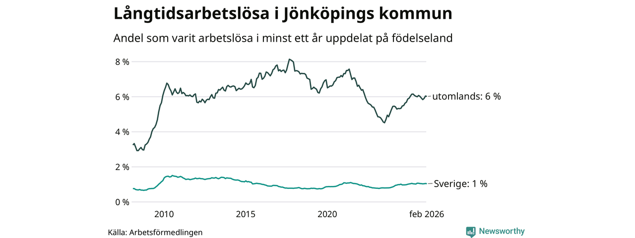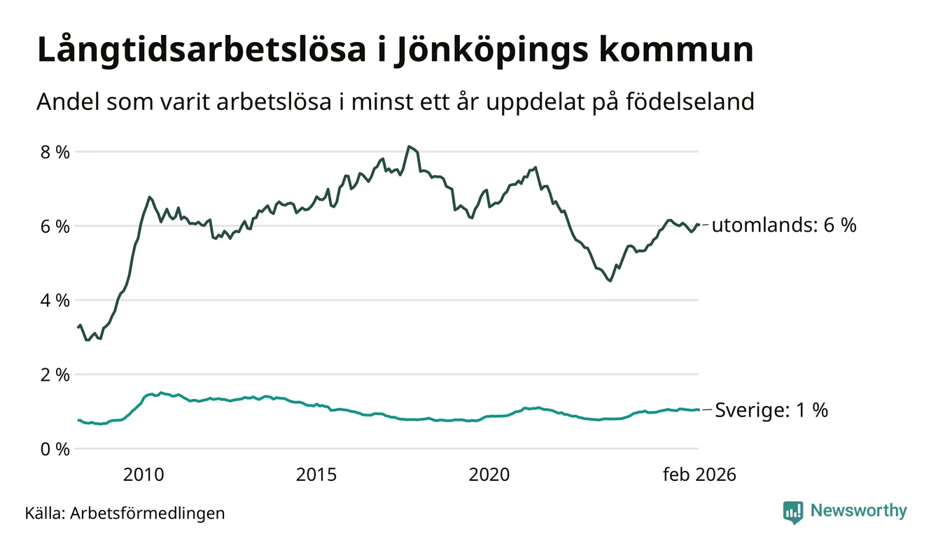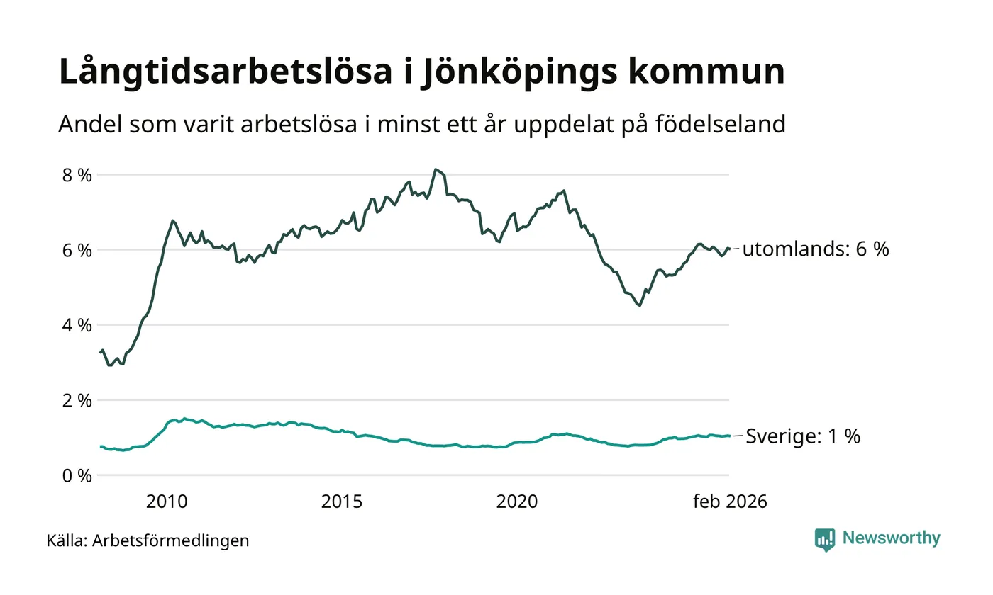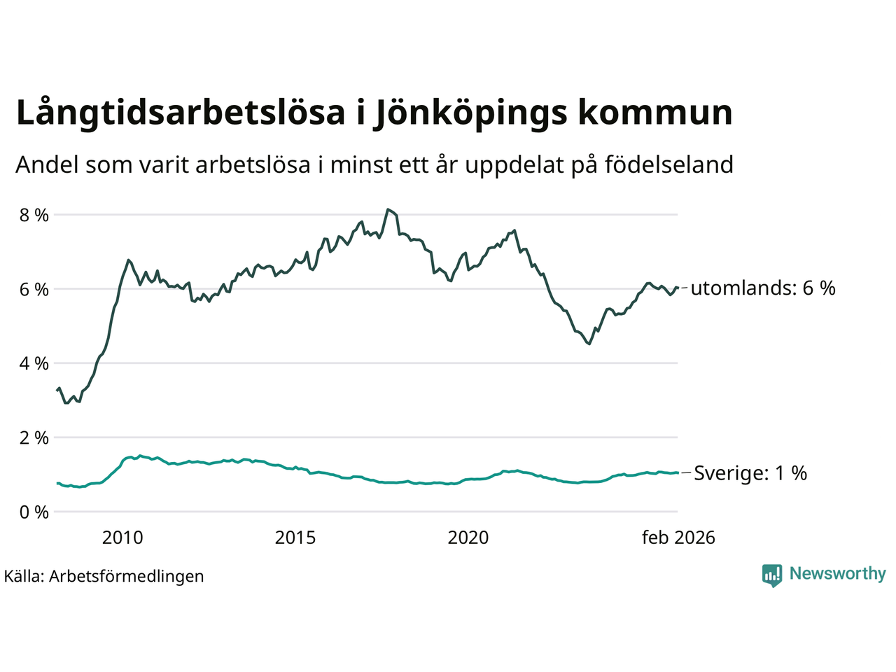 605 av de långtidsarbetslösa i Jönköpings kommun är födda i Sverige, medan 1 126 är födda utomlands. Det innebär att långtidsarbetslösheten bland Sverigefödda är 1,0 procent, medan den är sex gånger så hög – 6,0 procent – bland födda utomlands. Även i riket som helhet är arbetslösheten högre bland utrikesfödda.