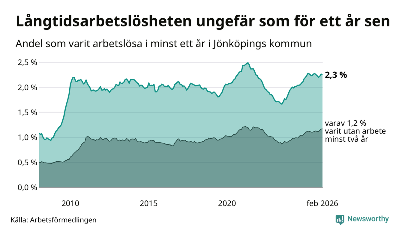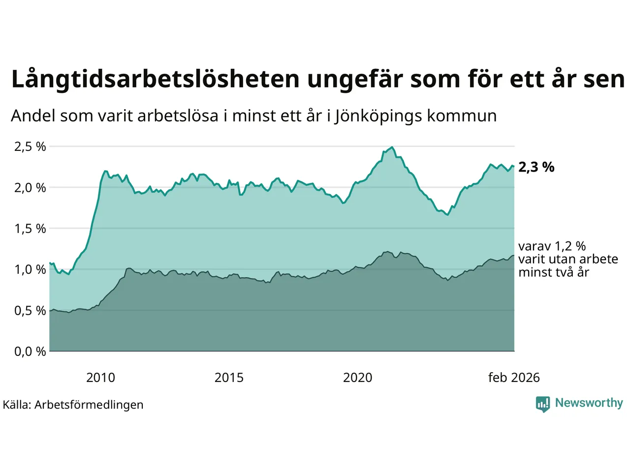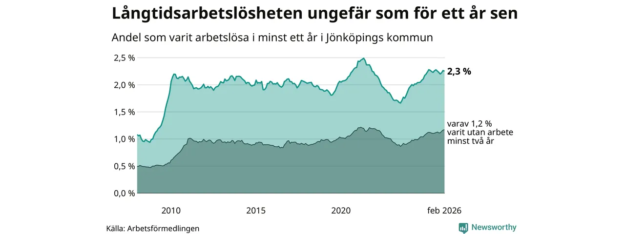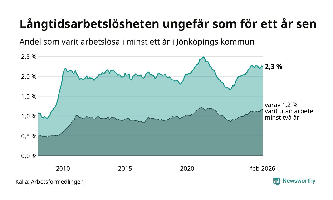 I februari hade 1 731 Jönköpingsbor varit arbetslösa i minst ett år, vilket är nio färre än månaden innan. 1 731 personer motsvarar 2,3 procent av arbetskraften i kommunen – andelen långtidsarbetslösa är ungefär på samma nivå som för ett år sedan.