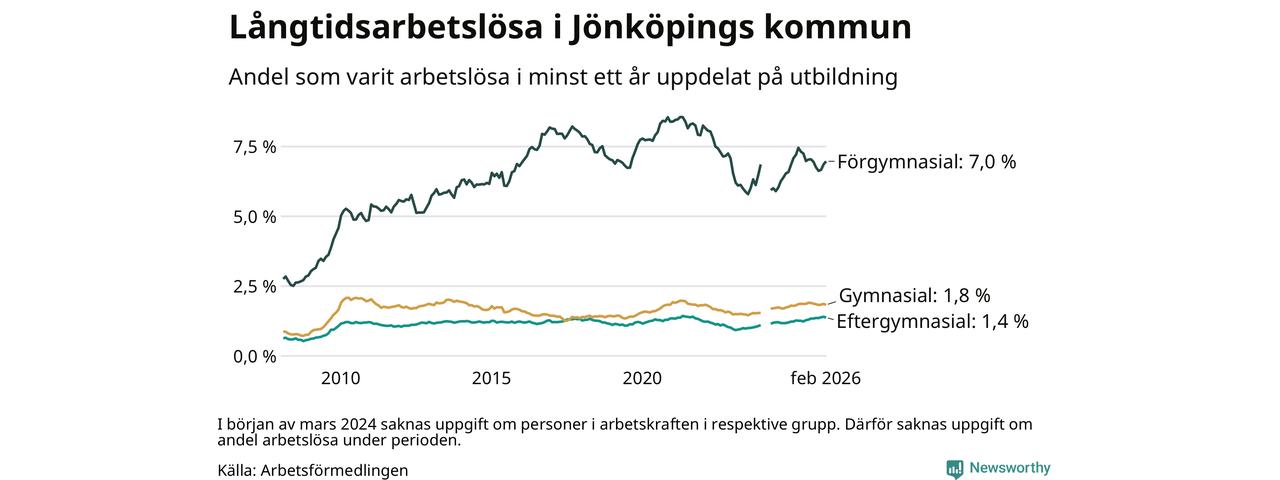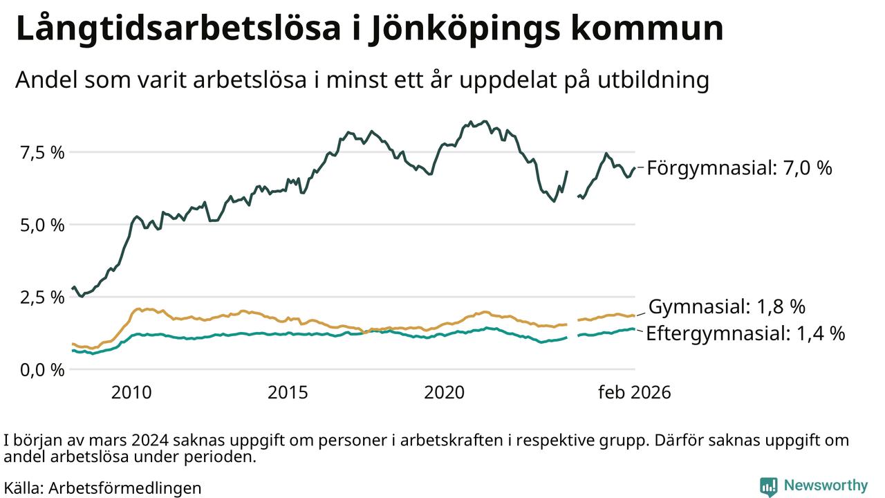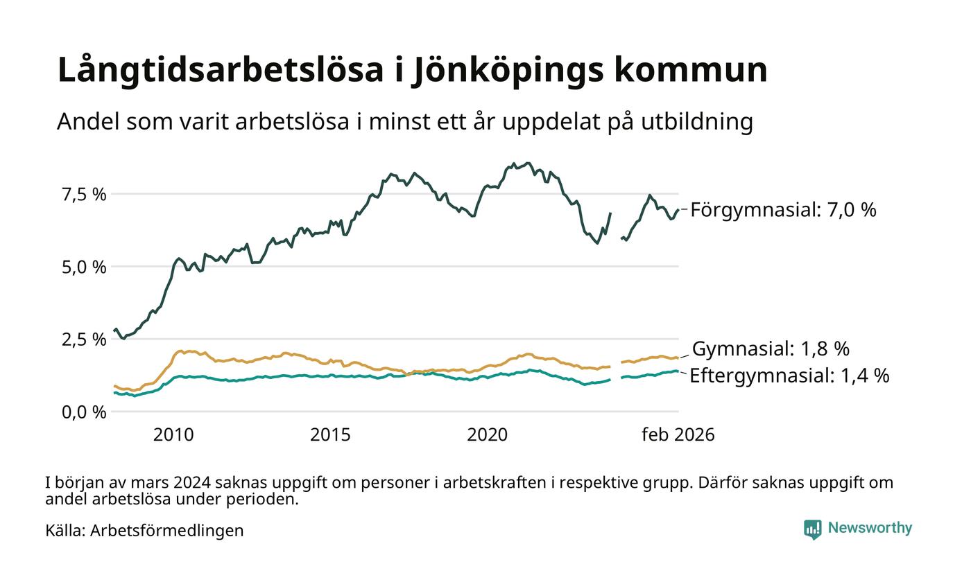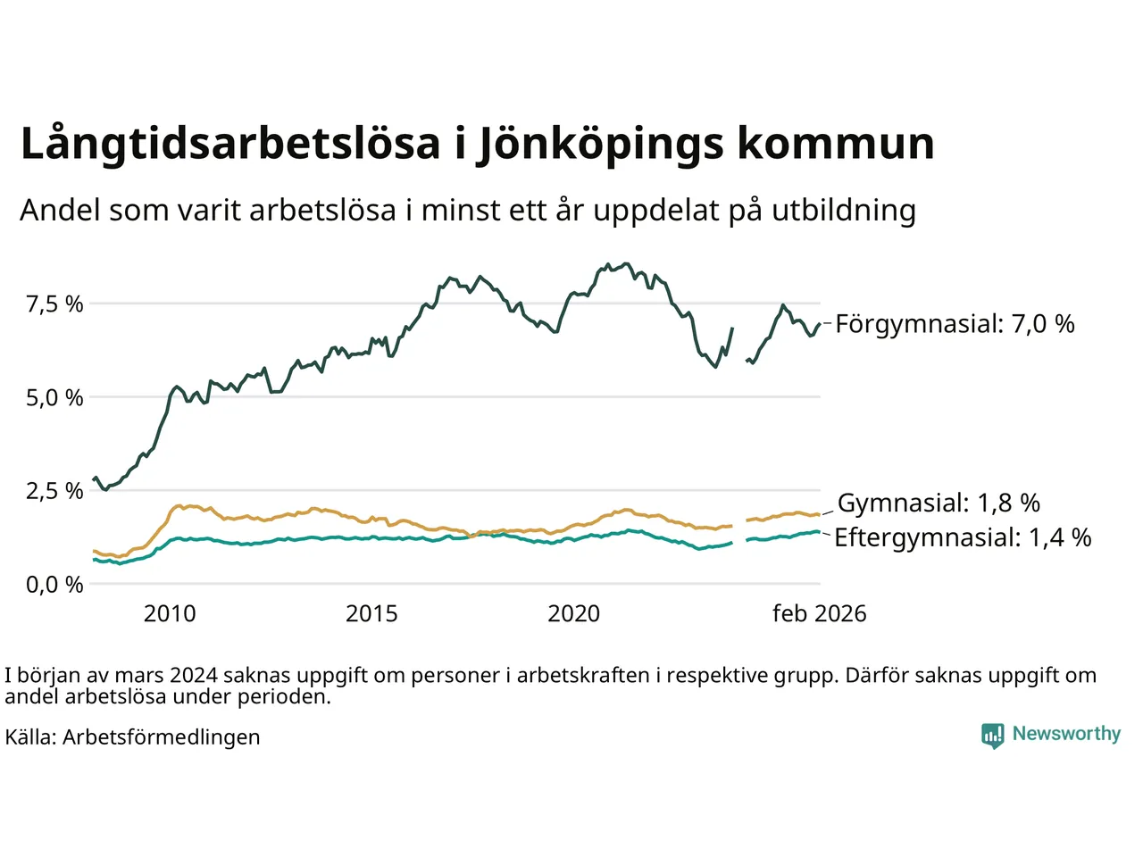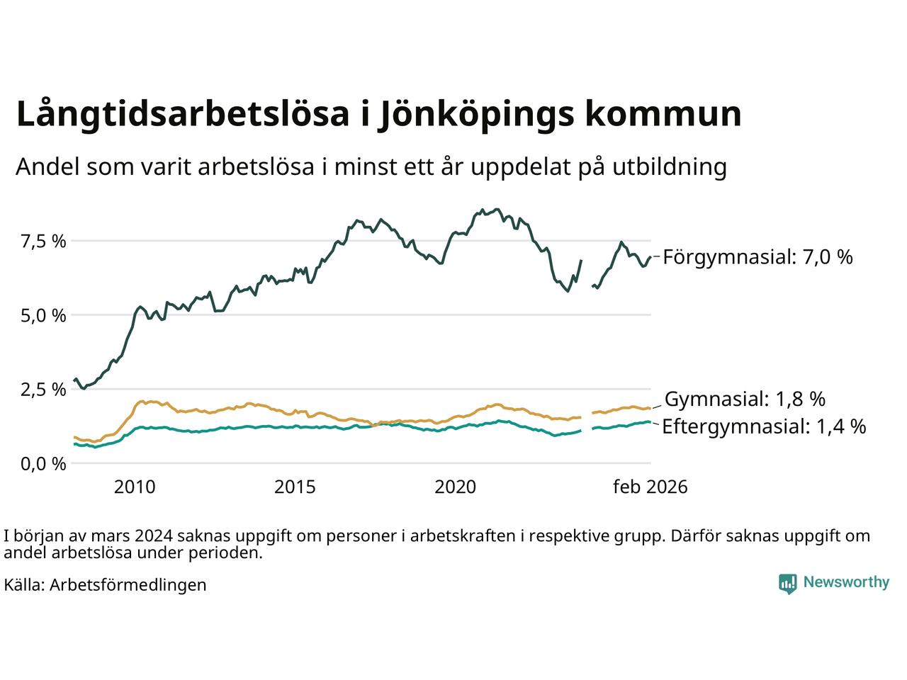 I februari hade 1 731 Jönköpingsbor varit arbetslösa i minst ett år, vilket är nio färre än månaden innan. 1 731 personer motsvarar 2,3 procent av arbetskraften i kommunen – andelen långtidsarbetslösa är ungefär på samma nivå som för ett år sedan.